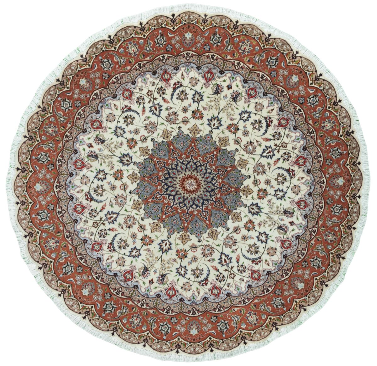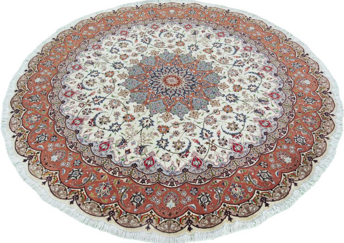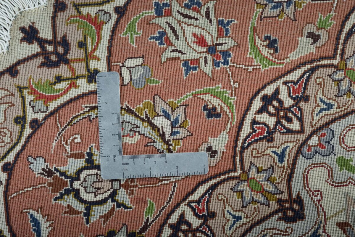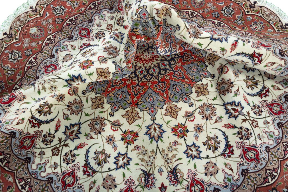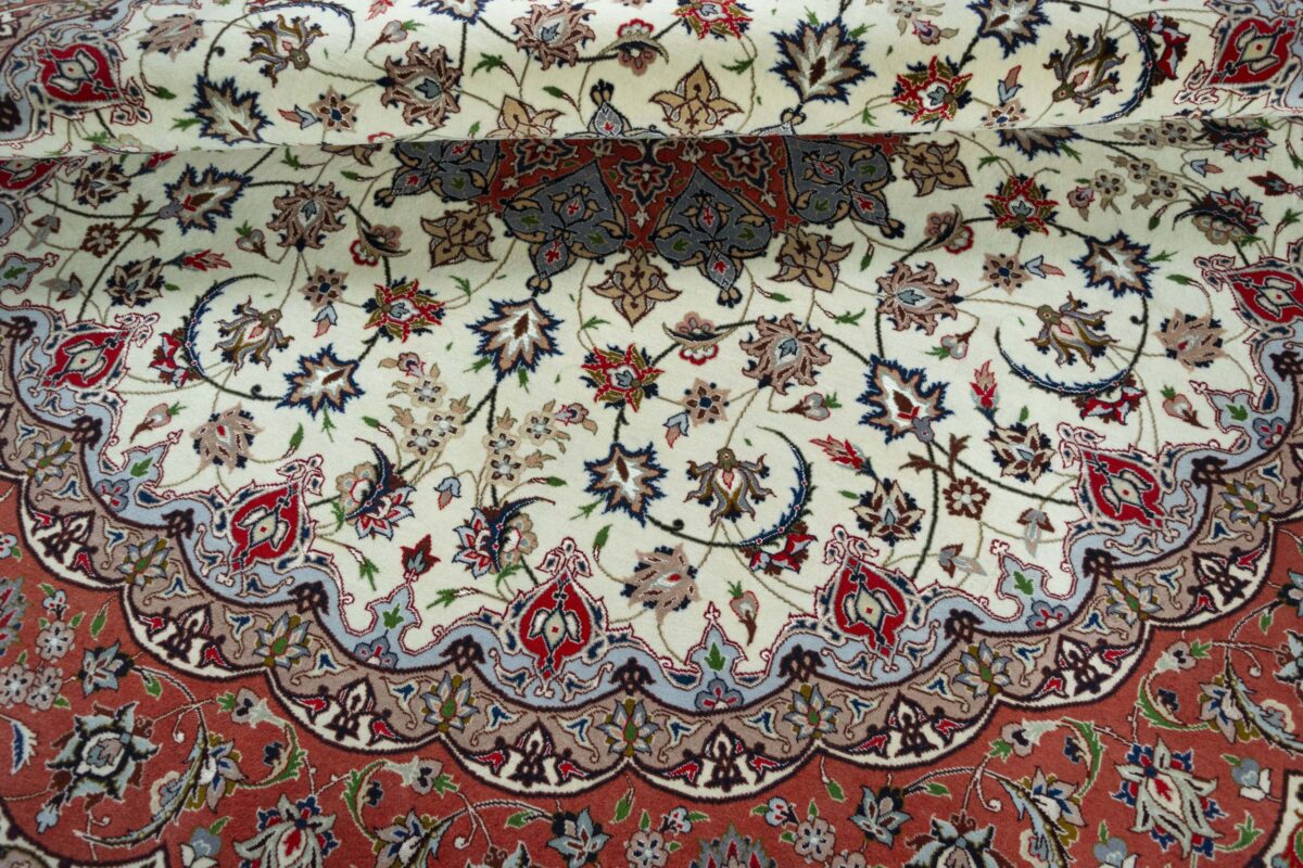 Für die besondere Eleganz des Täbriz-Flors sorgen hervorragende Materialien wie samtig anmutende Korkwolle und glänzende Seidenfäden. Die Knüpfqualität eines Täbriz-Teppichs lässt sich aus der angegebenen Raj-Zahl erschließen – je höher diese ausfällt, umso feiner ist die Knüpfdichte, die eine Million und mehr Knoten pro Quadratmeter erreichen kann. Bei besonders feingeknüpften Qualitäten kommt für die Kette statt des üblichen Baumwollgarns sogar Seide zum Einsatz.