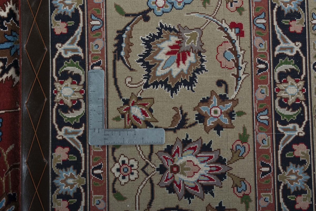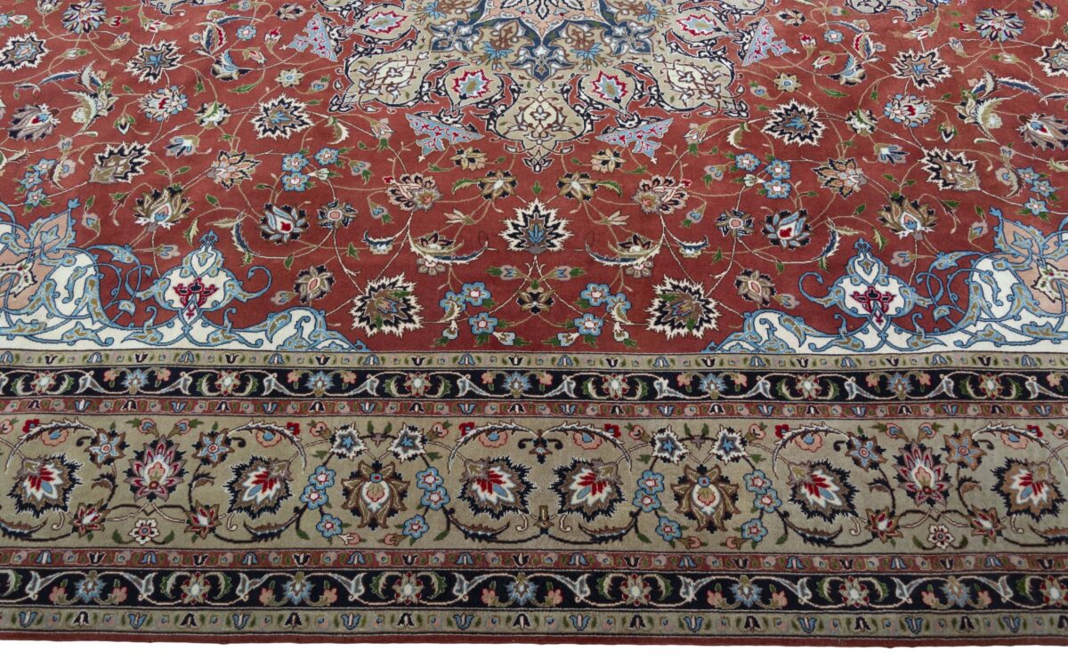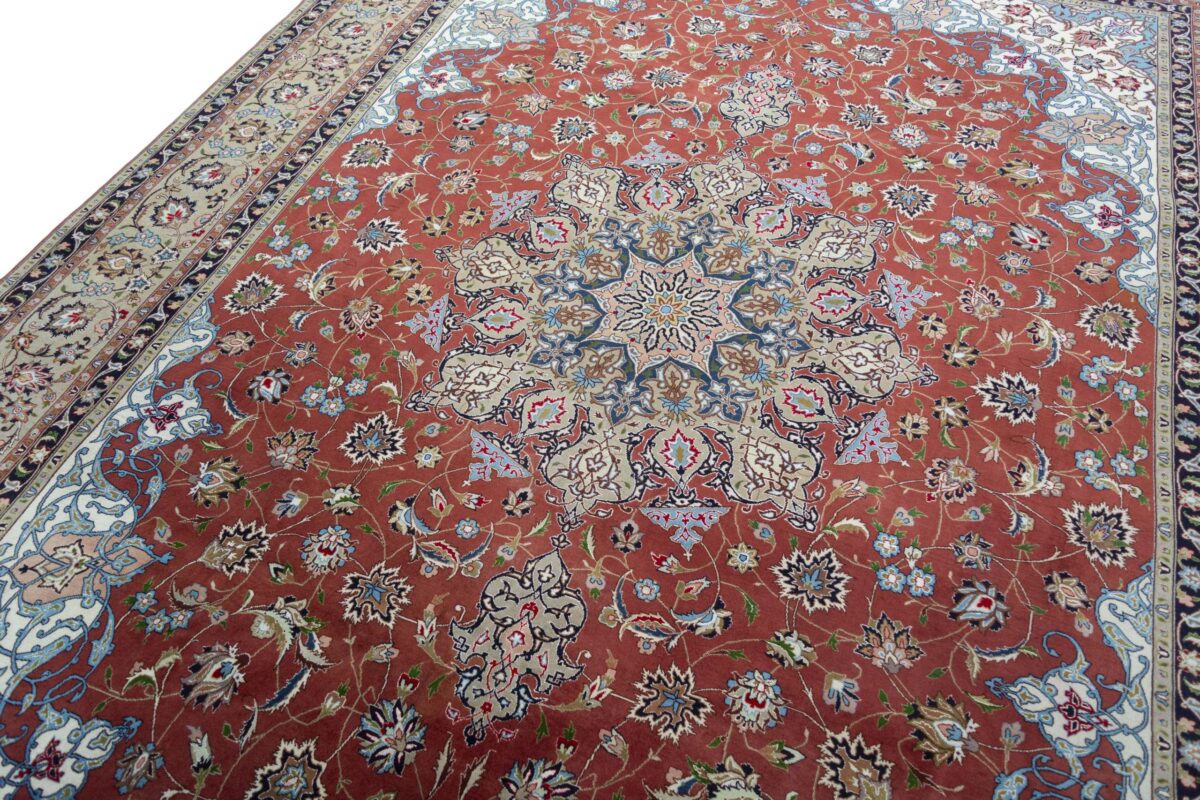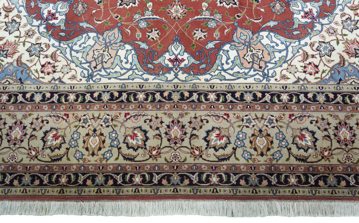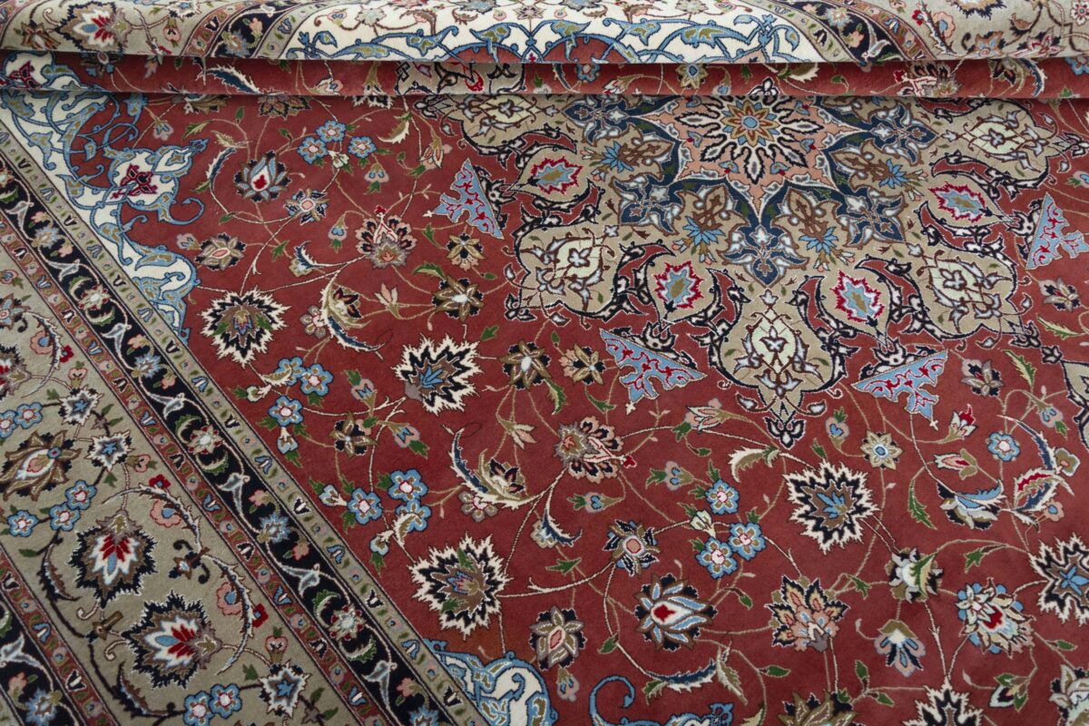 Für die besondere Eleganz des Täbriz-Flors sorgen hervorragende Materialien wie samtig anmutende Korkwolle und glänzende Seidenfäden. Die Knüpfqualität eines Täbriz-Teppichs lässt sich aus der angegebenen Raj-Zahl erschließen – je höher diese ausfällt, umso feiner ist die Knüpfdichte, die eine Million und mehr Knoten pro Quadratmeter erreichen kann. Bei besonders feingeknüpften Qualitäten kommt für die Kette statt des üblichen Baumwollgarns sogar Seide zum Einsatz.