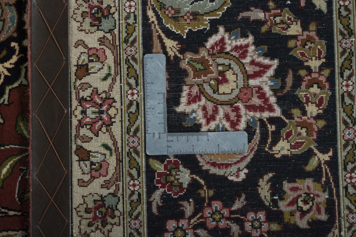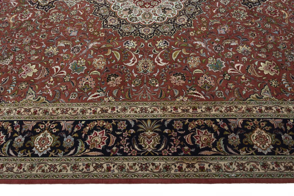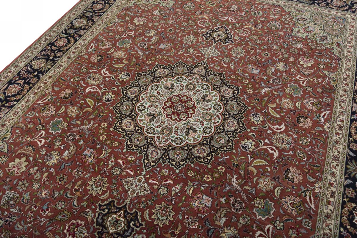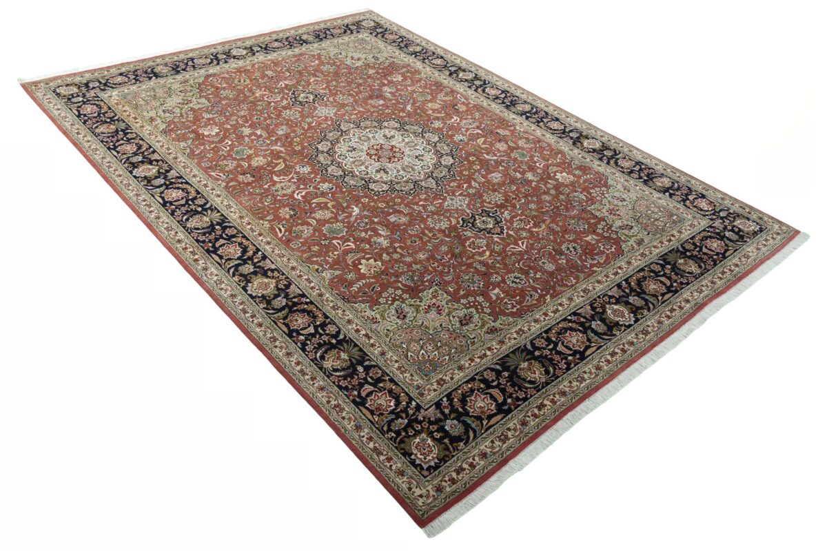 Für die besondere Eleganz des Täbriz-Flors sorgen hervorragende Materialien wie samtig anmutende Korkwolle und glänzende Seidenfäden. Die Knüpfqualität eines Täbriz-Teppichs lässt sich aus der angegebenen Raj-Zahl erschließen – je höher diese ausfällt, umso feiner ist die Knüpfdichte, die eine Million und mehr Knoten pro Quadratmeter erreichen kann. Bei besonders feingeknüpften Qualitäten kommt für die Kette statt des üblichen Baumwollgarns sogar Seide zum Einsatz.