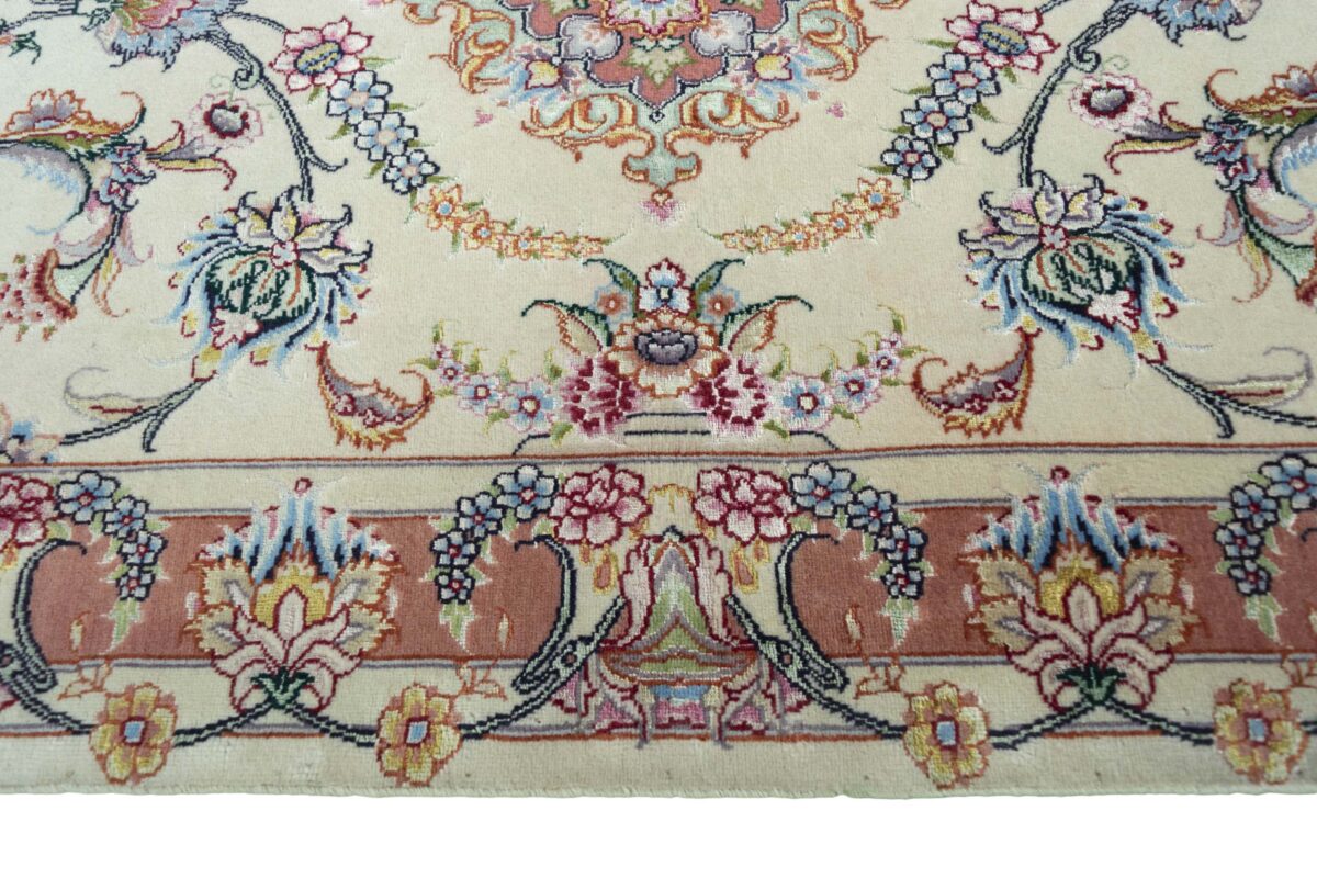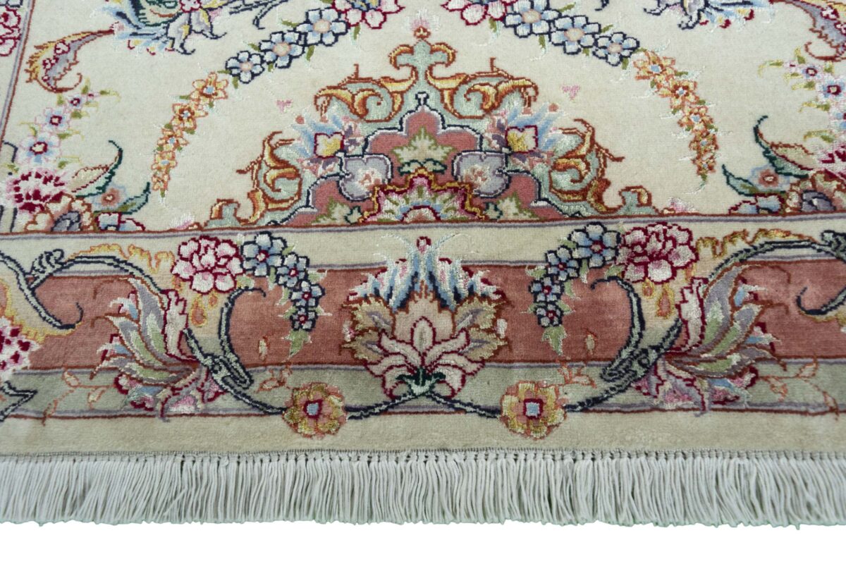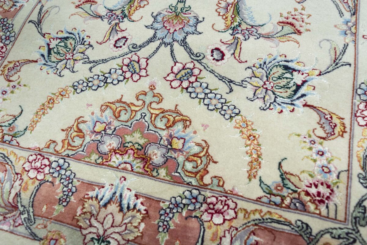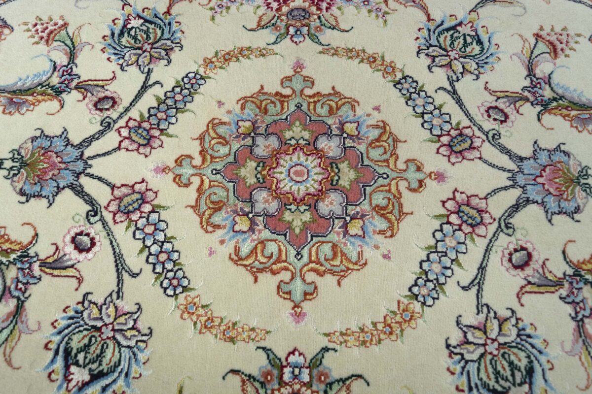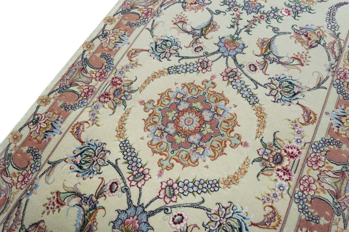 Für die besondere Eleganz des Täbriz-Flors sorgen hervorragende Materialien wie samtig anmutende Korkwolle und glänzende Seidenfäden. Die Knüpfqualität eines Täbriz-Teppichs lässt sich aus der angegebenen Raj-Zahl erschließen – je höher diese ausfällt, umso feiner ist die Knüpfdichte, die eine Million und mehr Knoten pro Quadratmeter erreichen kann. Bei besonders feingeknüpften Qualitäten kommt für die Kette statt des üblichen Baumwollgarns sogar Seide zum Einsatz.