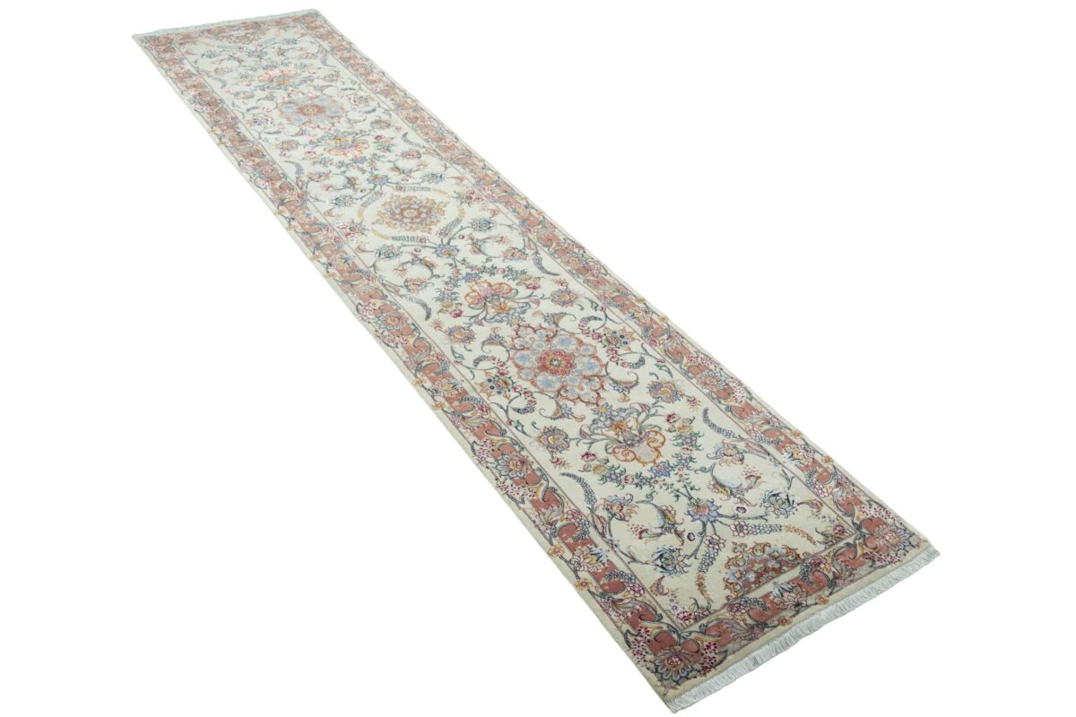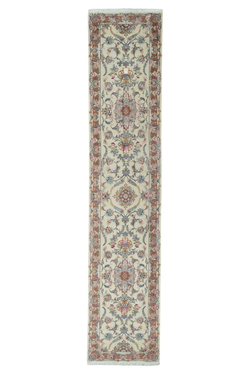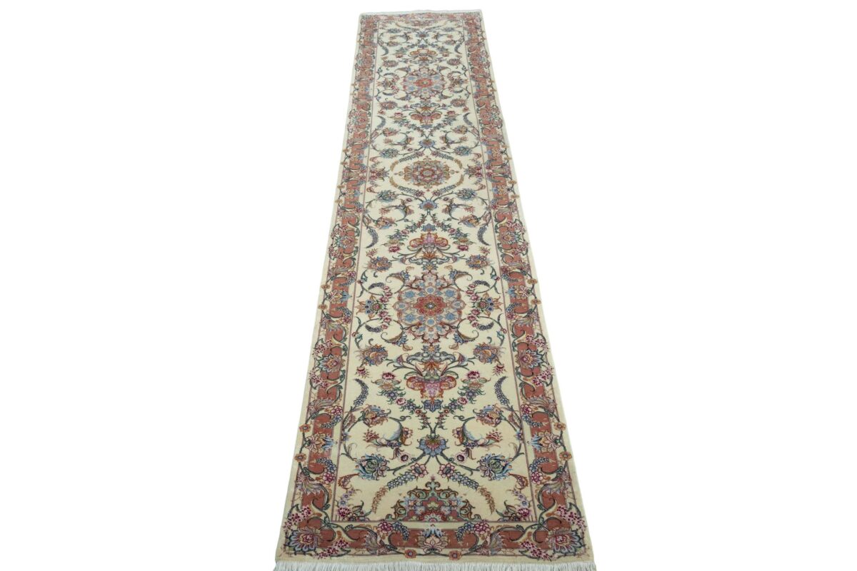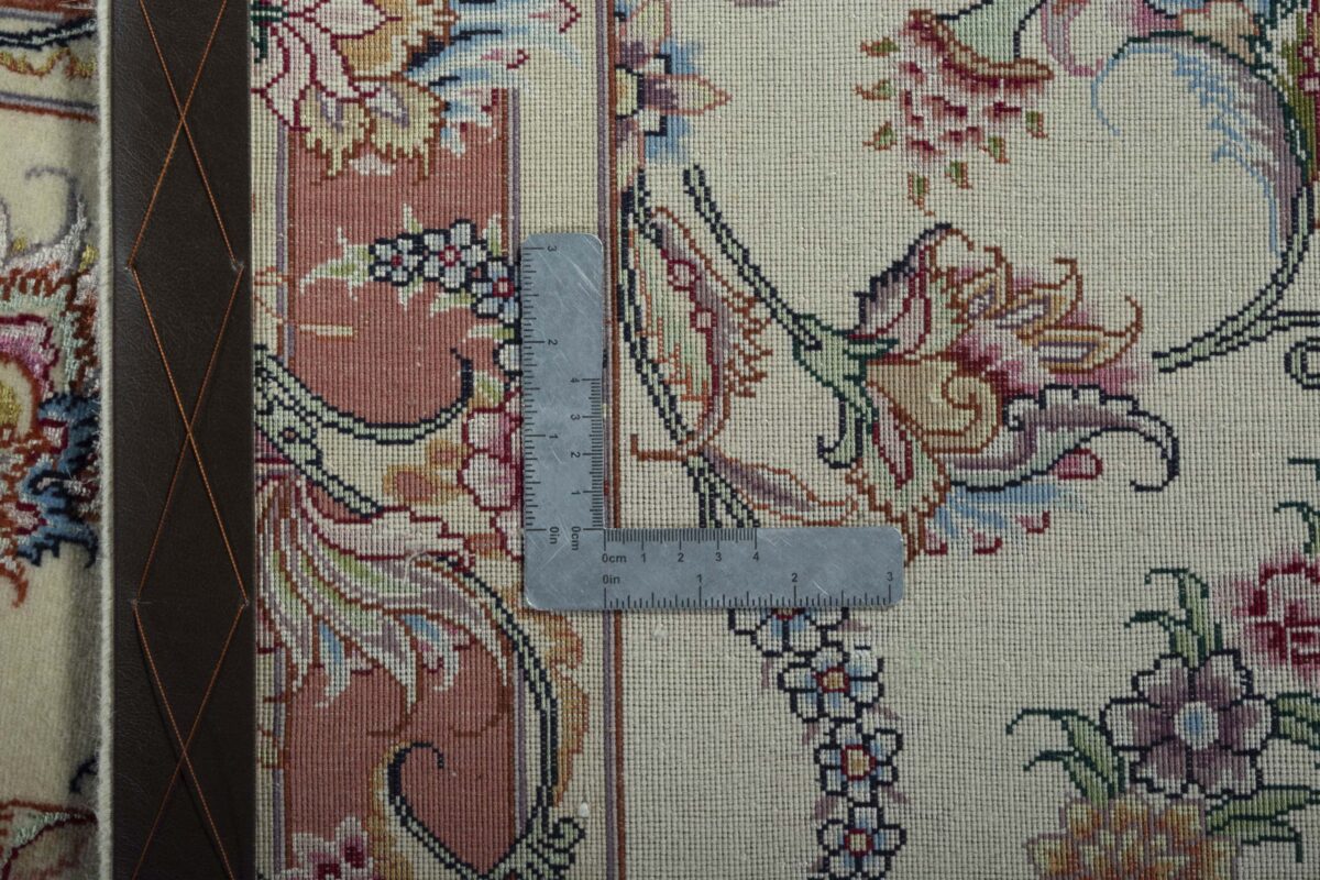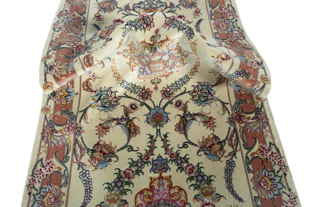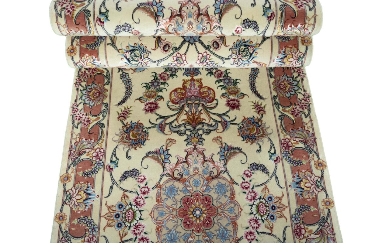 Für die besondere Eleganz des Täbriz-Flors sorgen hervorragende Materialien wie samtig anmutende Korkwolle und glänzende Seidenfäden. Die Knüpfqualität eines Täbriz-Teppichs lässt sich aus der angegebenen Raj-Zahl erschließen – je höher diese ausfällt, umso feiner ist die Knüpfdichte, die eine Million und mehr Knoten pro Quadratmeter erreichen kann. Bei besonders feingeknüpften Qualitäten kommt für die Kette statt des üblichen Baumwollgarns sogar Seide zum Einsatz.