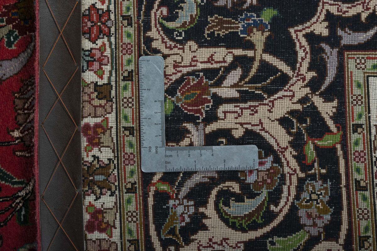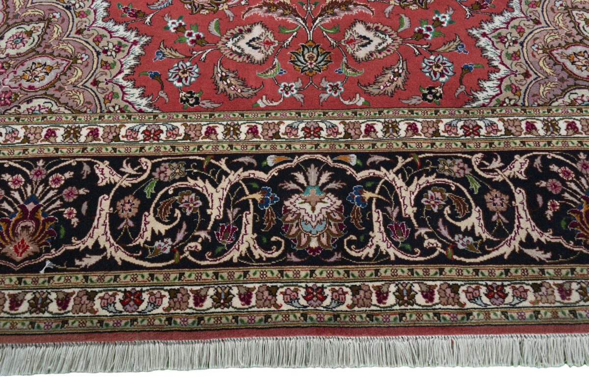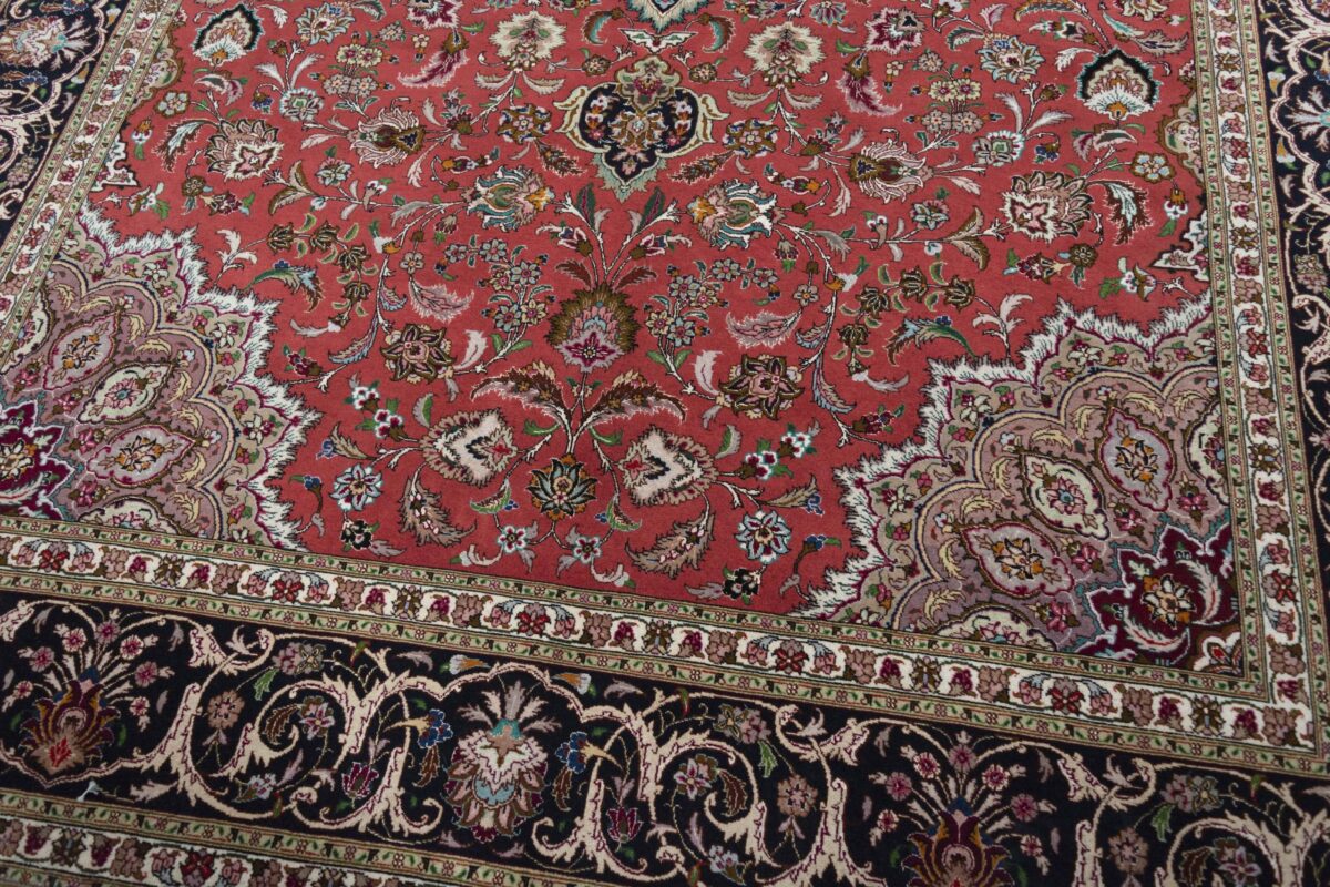 Für die besondere Eleganz des Täbriz-Flors sorgen hervorragende Materialien wie samtig anmutende Korkwolle und glänzende Seidenfäden. Die Knüpfqualität eines Täbriz-Teppichs lässt sich aus der angegebenen Raj-Zahl erschließen – je höher diese ausfällt, umso feiner ist die Knüpfdichte, die eine Million und mehr Knoten pro Quadratmeter erreichen kann. Bei besonders feingeknüpften Qualitäten kommt für die Kette statt des üblichen Baumwollgarns sogar Seide zum Einsatz.