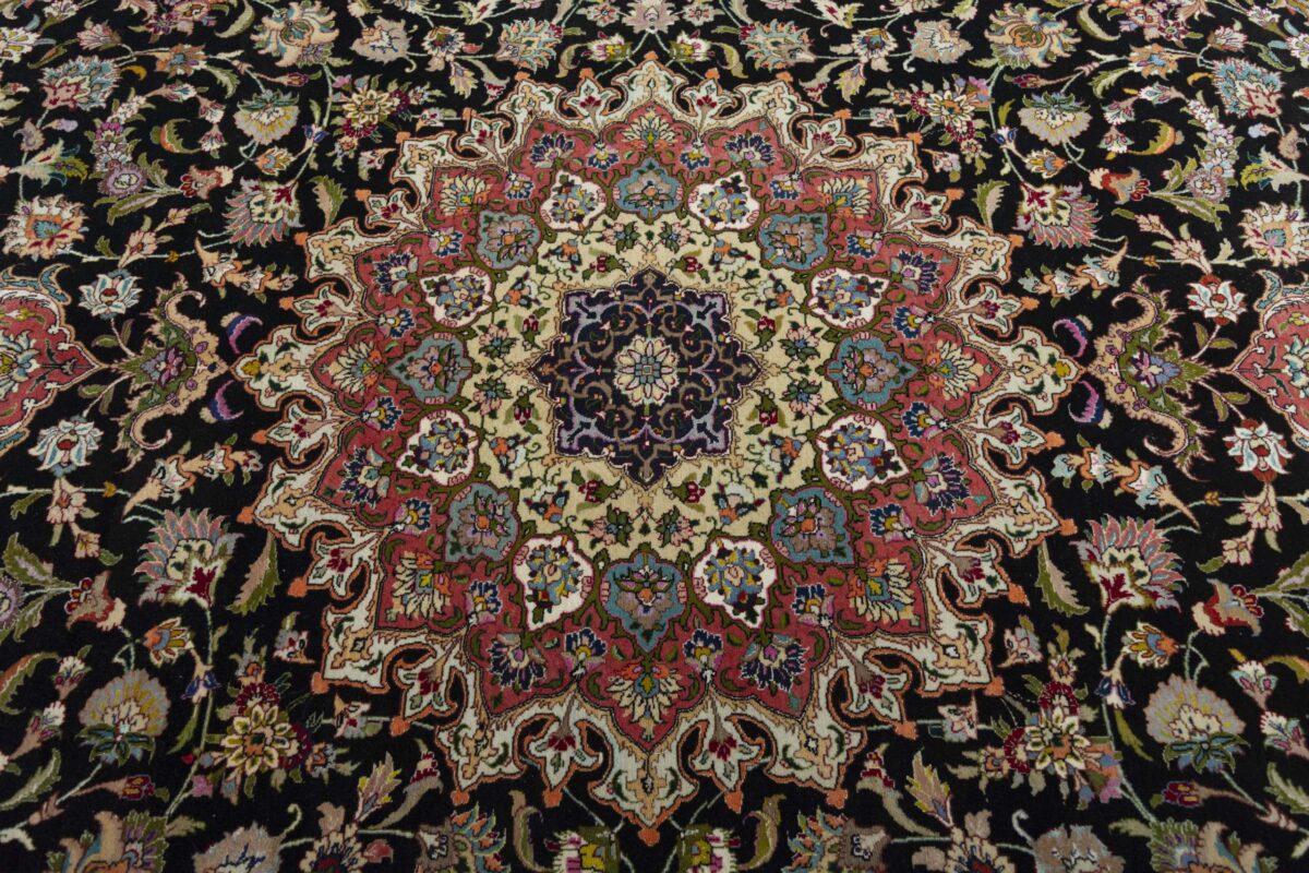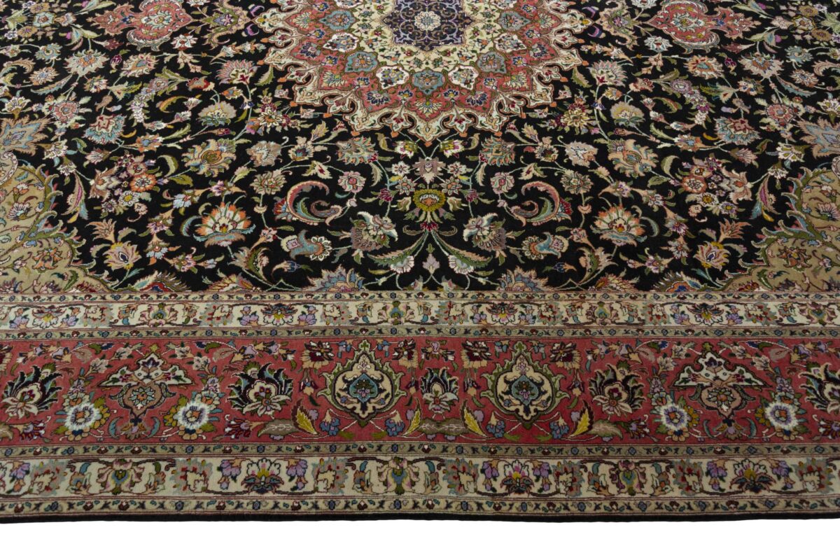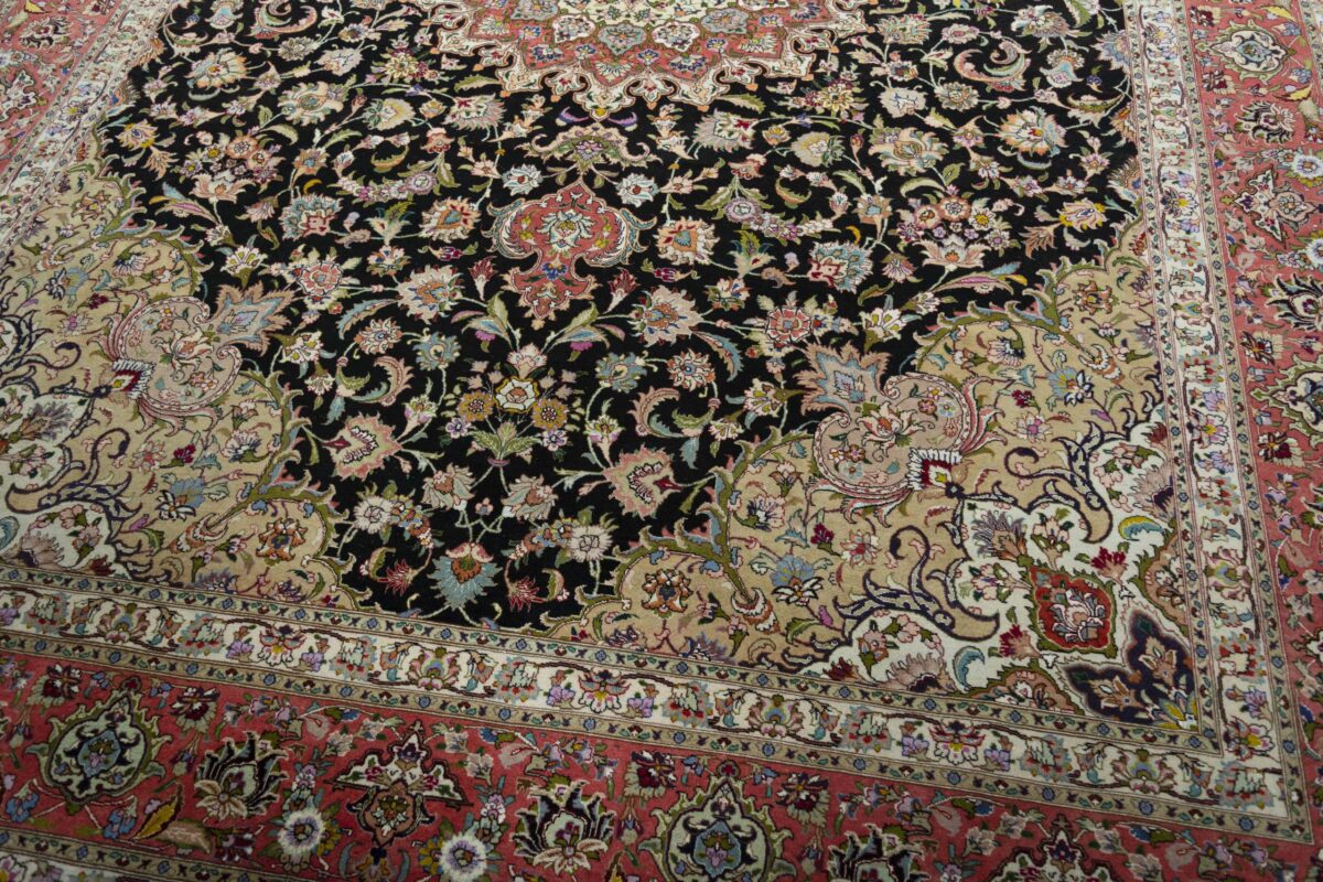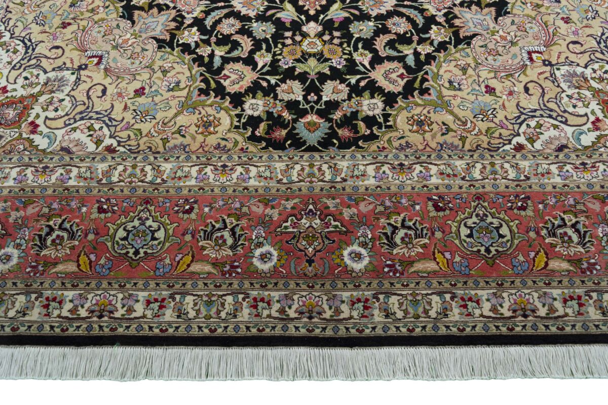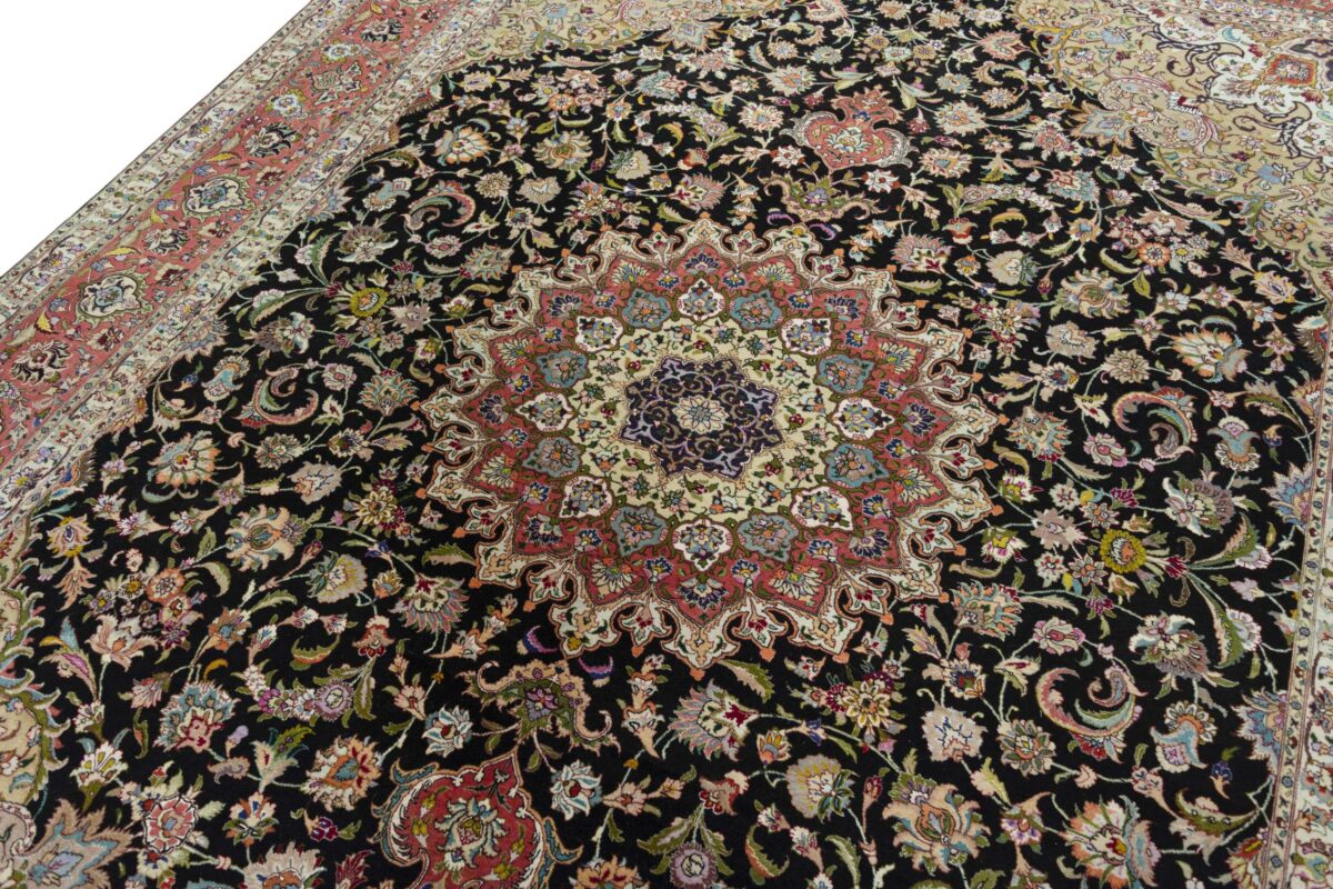Für die besondere Eleganz des Täbriz-Flors sorgen hervorragende Materialien wie samtig anmutende Korkwolle und glänzende Seidenfäden. Die Knüpfqualität eines Täbriz-Teppichs lässt sich aus der angegebenen Raj-Zahl erschließen – je höher diese ausfällt, umso feiner ist die Knüpfdichte, die eine Million und mehr Knoten pro Quadratmeter erreichen kann. Bei besonders feingeknüpften Qualitäten kommt für die Kette statt des üblichen Baumwollgarns sogar Seide zum Einsatz.