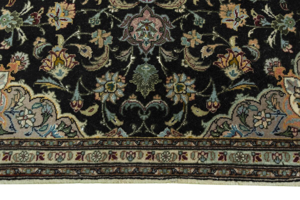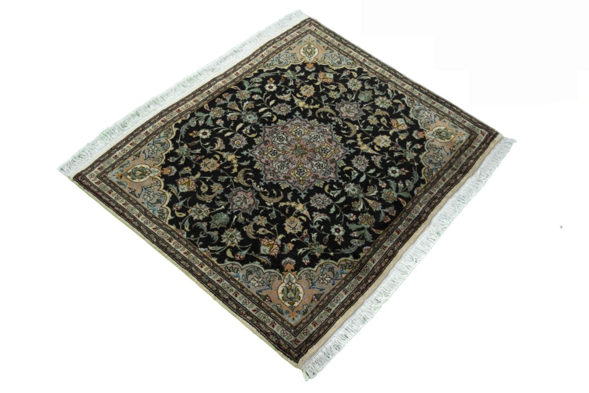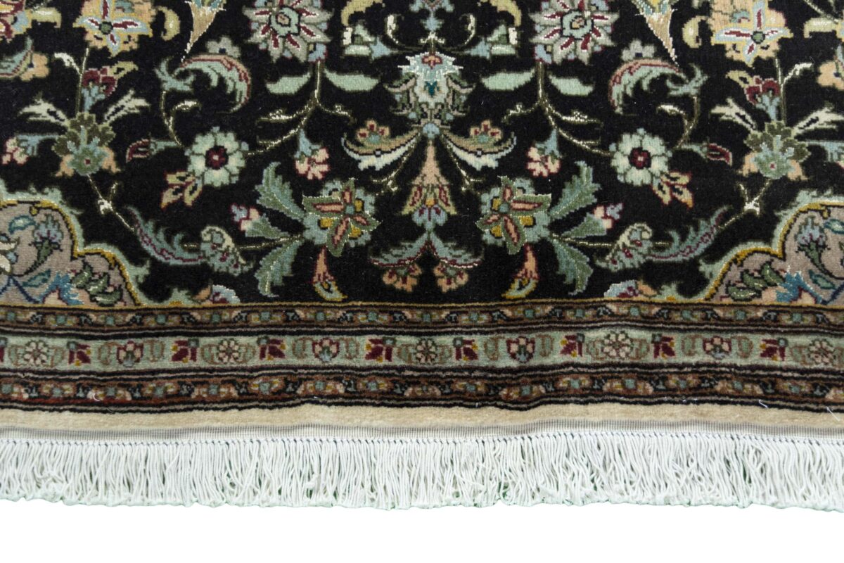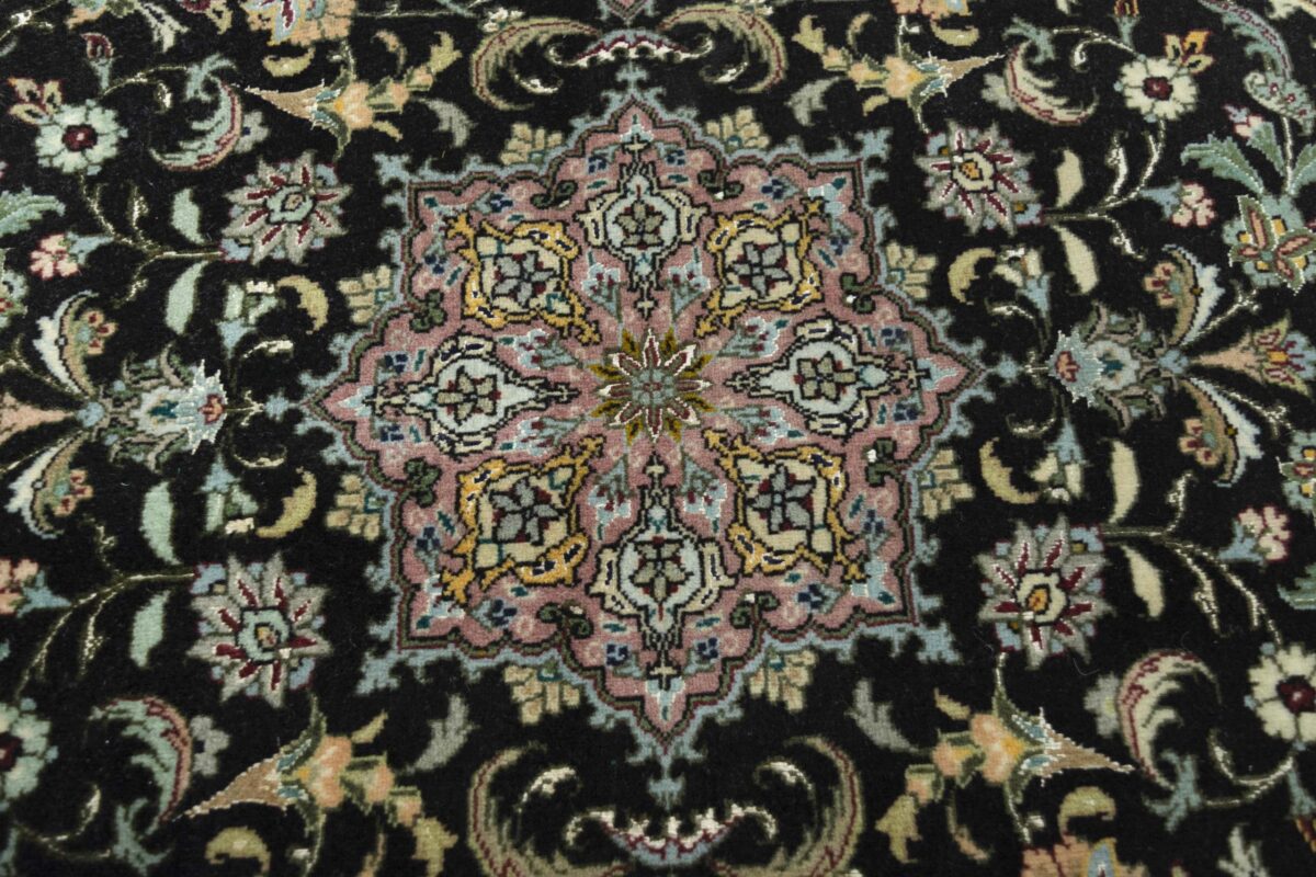 Für die besondere Eleganz des Täbriz-Flors sorgen hervorragende Materialien wie samtig anmutende Korkwolle und glänzende Seidenfäden. Die Knüpfqualität eines Täbriz-Teppichs lässt sich aus der angegebenen Raj-Zahl erschließen – je höher diese ausfällt, umso feiner ist die Knüpfdichte, die eine Million und mehr Knoten pro Quadratmeter erreichen kann. Bei besonders feingeknüpften Qualitäten kommt für die Kette statt des üblichen Baumwollgarns sogar Seide zum Einsatz.