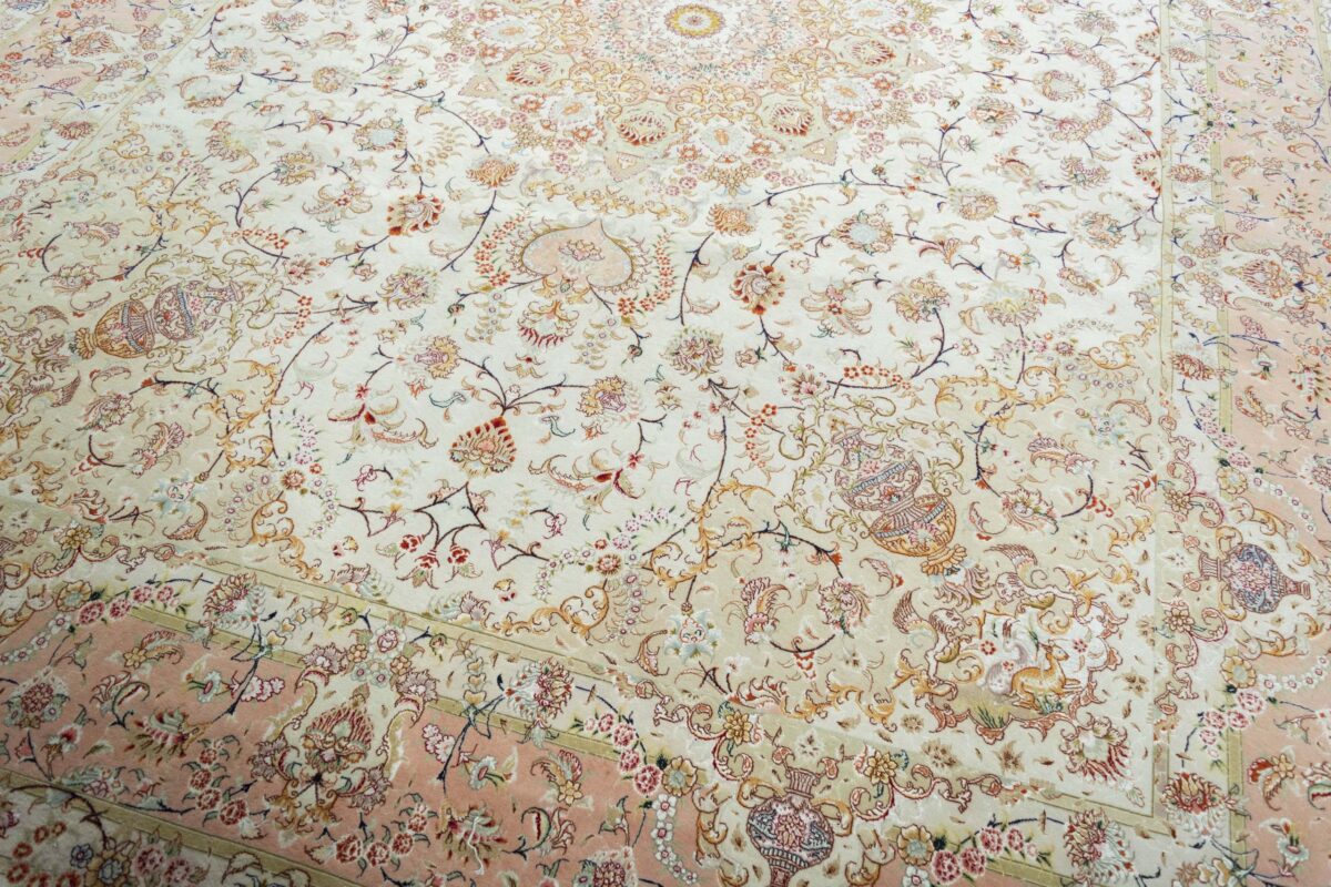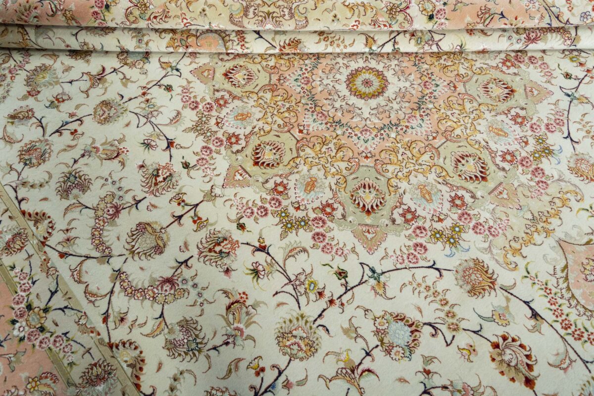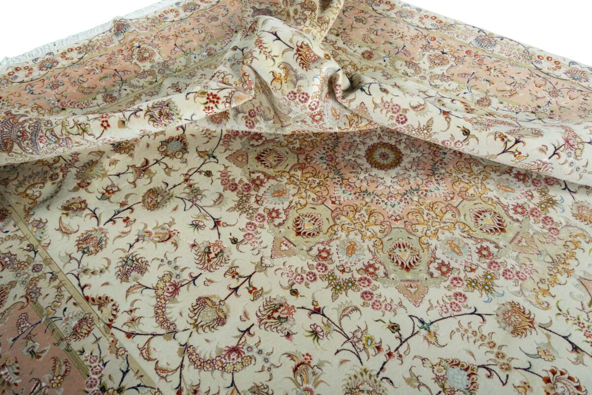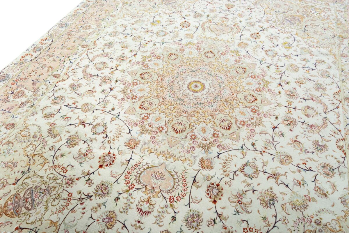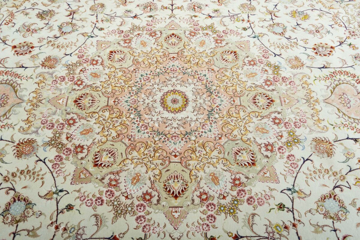 Für die besondere Eleganz des Täbriz-Flors sorgen hervorragende Materialien wie samtig anmutende Korkwolle und glänzende Seidenfäden. Die Knüpfqualität eines Täbriz-Teppichs lässt sich aus der angegebenen Raj-Zahl erschließen – je höher diese ausfällt, umso feiner ist die Knüpfdichte, die eine Million und mehr Knoten pro Quadratmeter erreichen kann. Bei besonders feingeknüpften Qualitäten kommt für die Kette statt des üblichen Baumwollgarns sogar Seide zum Einsatz.