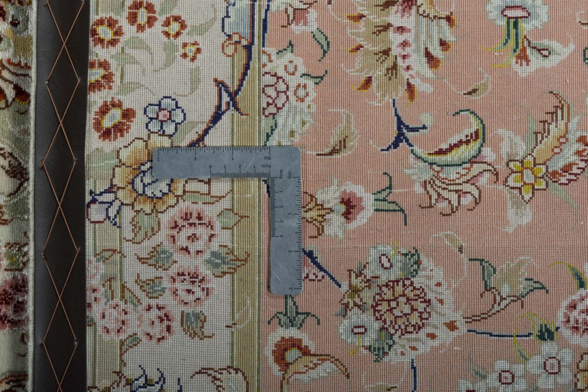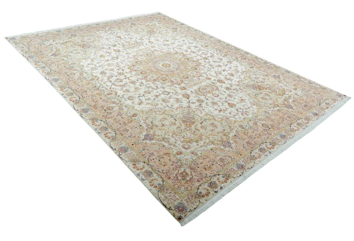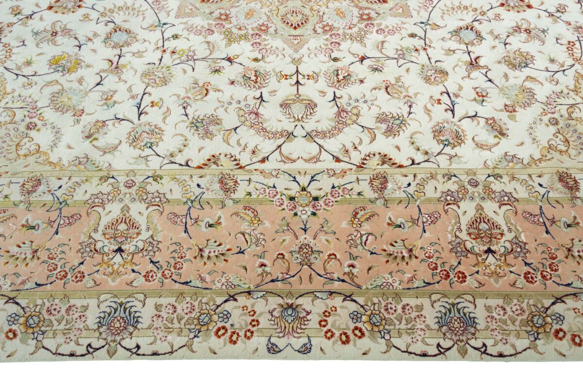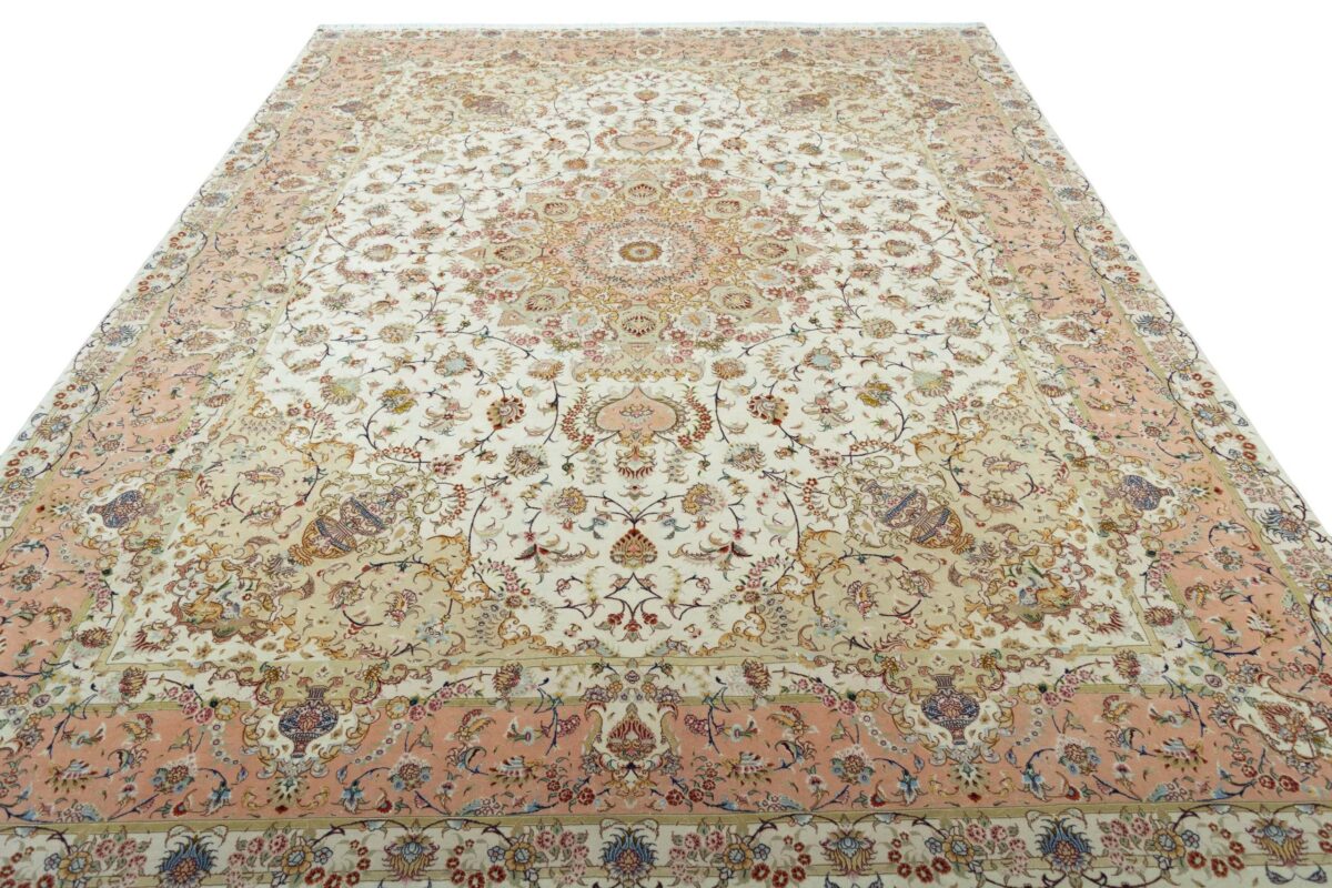 Für die besondere Eleganz des Täbriz-Flors sorgen hervorragende Materialien wie samtig anmutende Korkwolle und glänzende Seidenfäden. Die Knüpfqualität eines Täbriz-Teppichs lässt sich aus der angegebenen Raj-Zahl erschließen – je höher diese ausfällt, umso feiner ist die Knüpfdichte, die eine Million und mehr Knoten pro Quadratmeter erreichen kann. Bei besonders feingeknüpften Qualitäten kommt für die Kette statt des üblichen Baumwollgarns sogar Seide zum Einsatz.