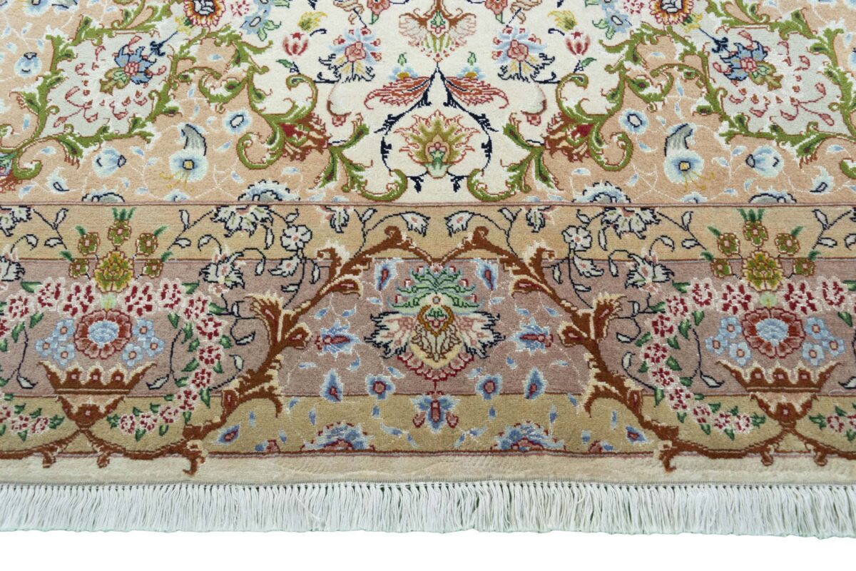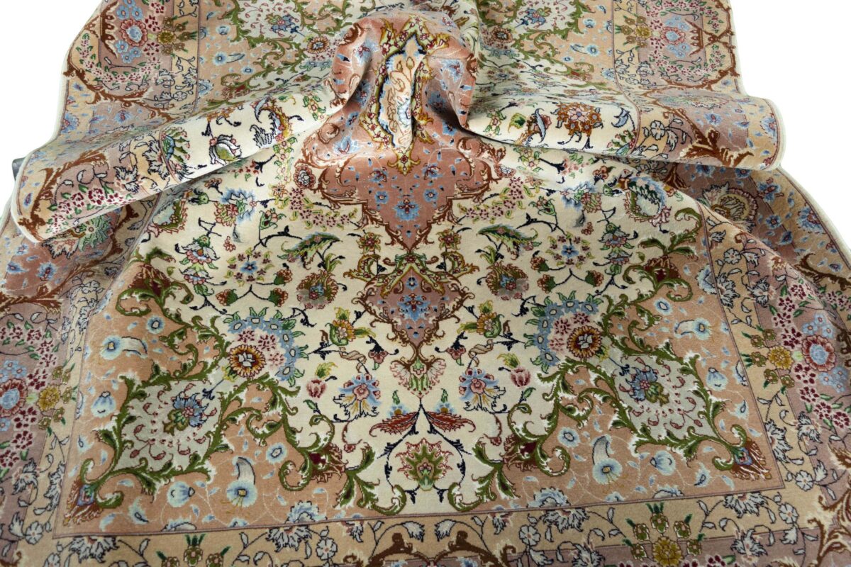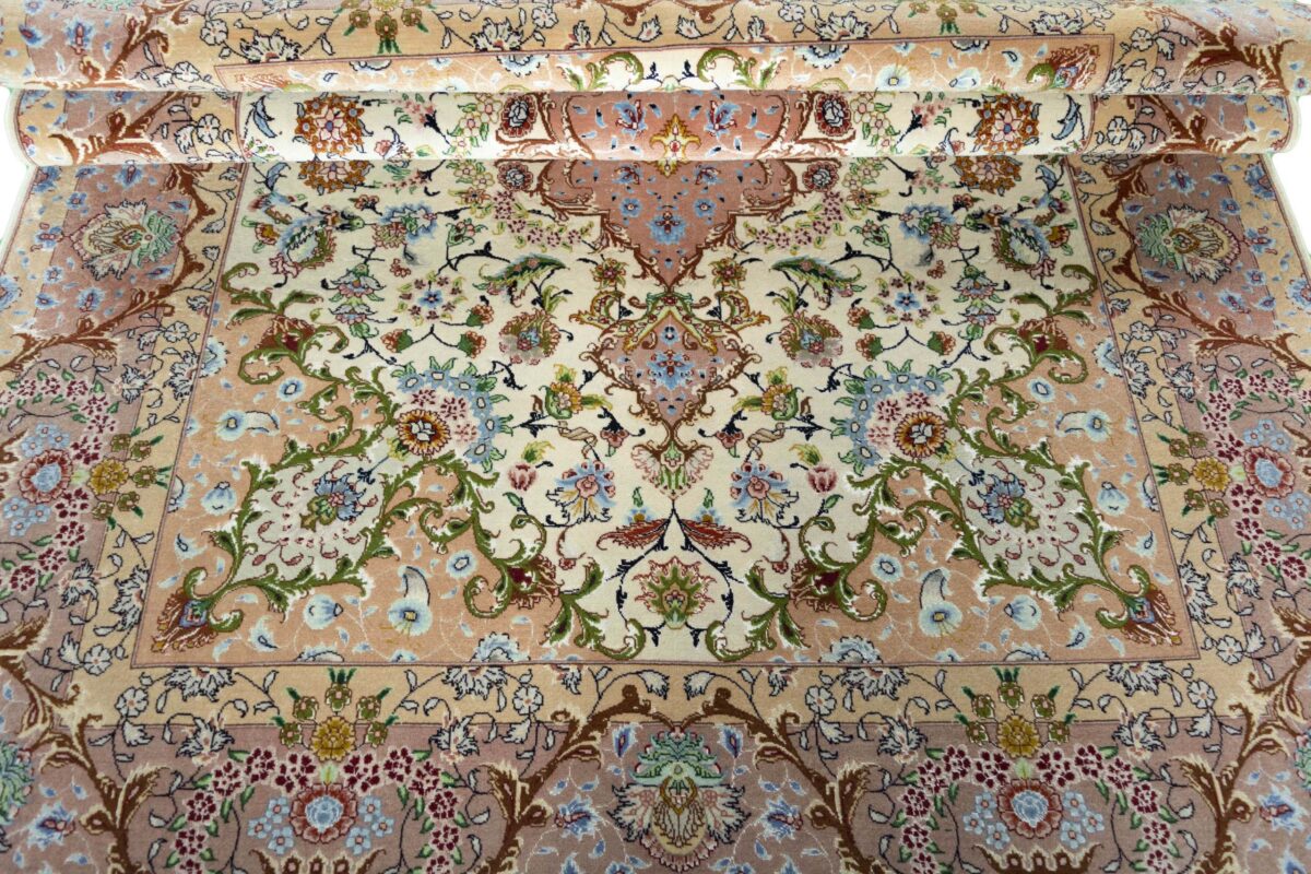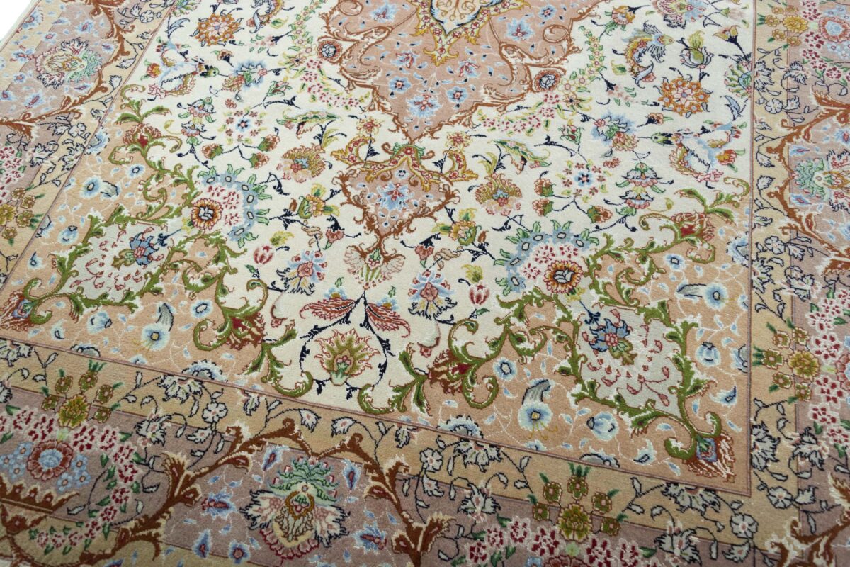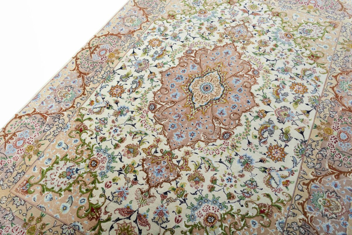 Für die besondere Eleganz des Täbriz-Flors sorgen hervorragende Materialien wie samtig anmutende Korkwolle und glänzende Seidenfäden. Die Knüpfqualität eines Täbriz-Teppichs lässt sich aus der angegebenen Raj-Zahl erschließen – je höher diese ausfällt, umso feiner ist die Knüpfdichte, die eine Million und mehr Knoten pro Quadratmeter erreichen kann. Bei besonders feingeknüpften Qualitäten kommt für die Kette statt des üblichen Baumwollgarns sogar Seide zum Einsatz.