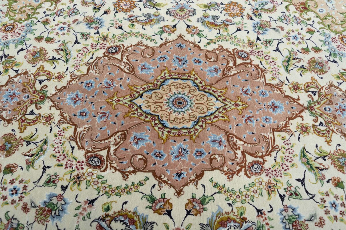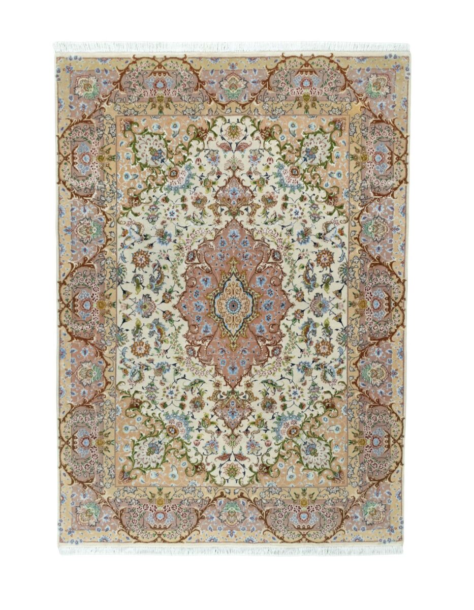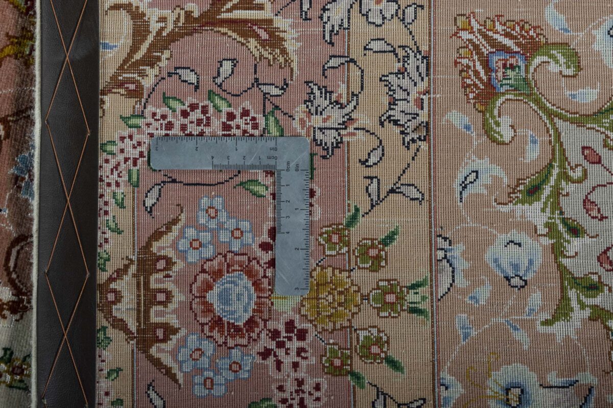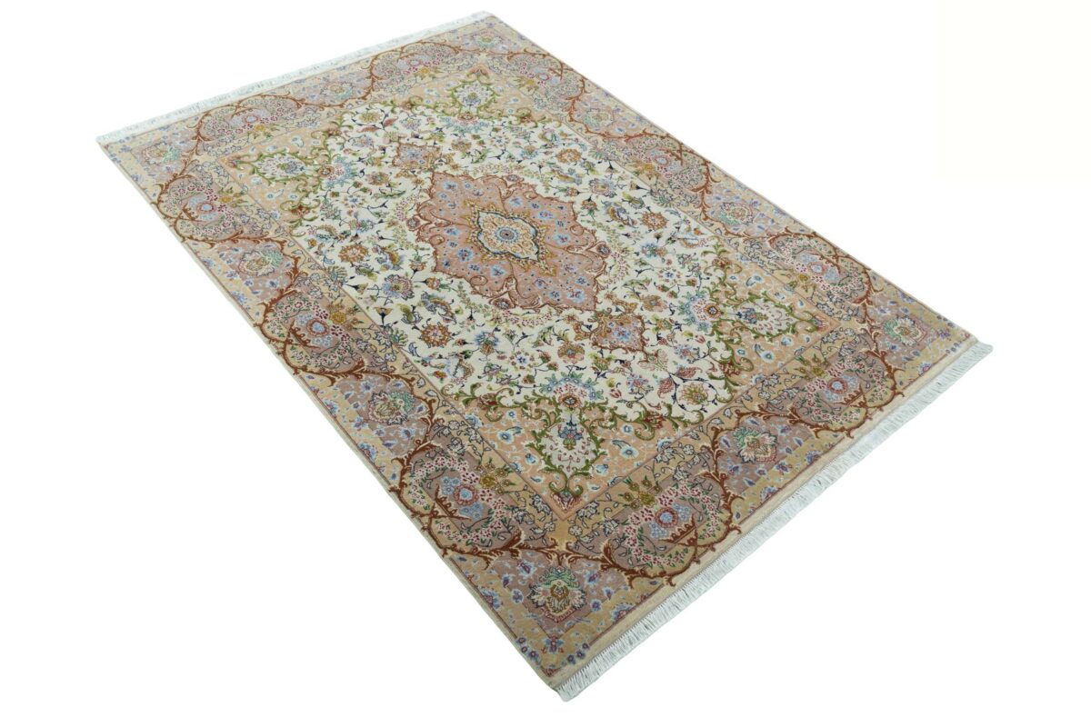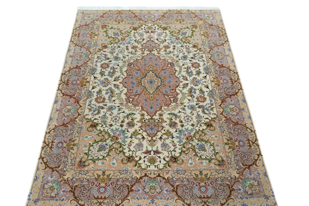 Für die besondere Eleganz des Täbriz-Flors sorgen hervorragende Materialien wie samtig anmutende Korkwolle und glänzende Seidenfäden. Die Knüpfqualität eines Täbriz-Teppichs lässt sich aus der angegebenen Raj-Zahl erschließen – je höher diese ausfällt, umso feiner ist die Knüpfdichte, die eine Million und mehr Knoten pro Quadratmeter erreichen kann. Bei besonders feingeknüpften Qualitäten kommt für die Kette statt des üblichen Baumwollgarns sogar Seide zum Einsatz.