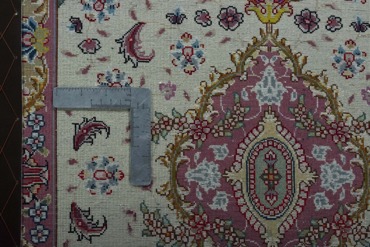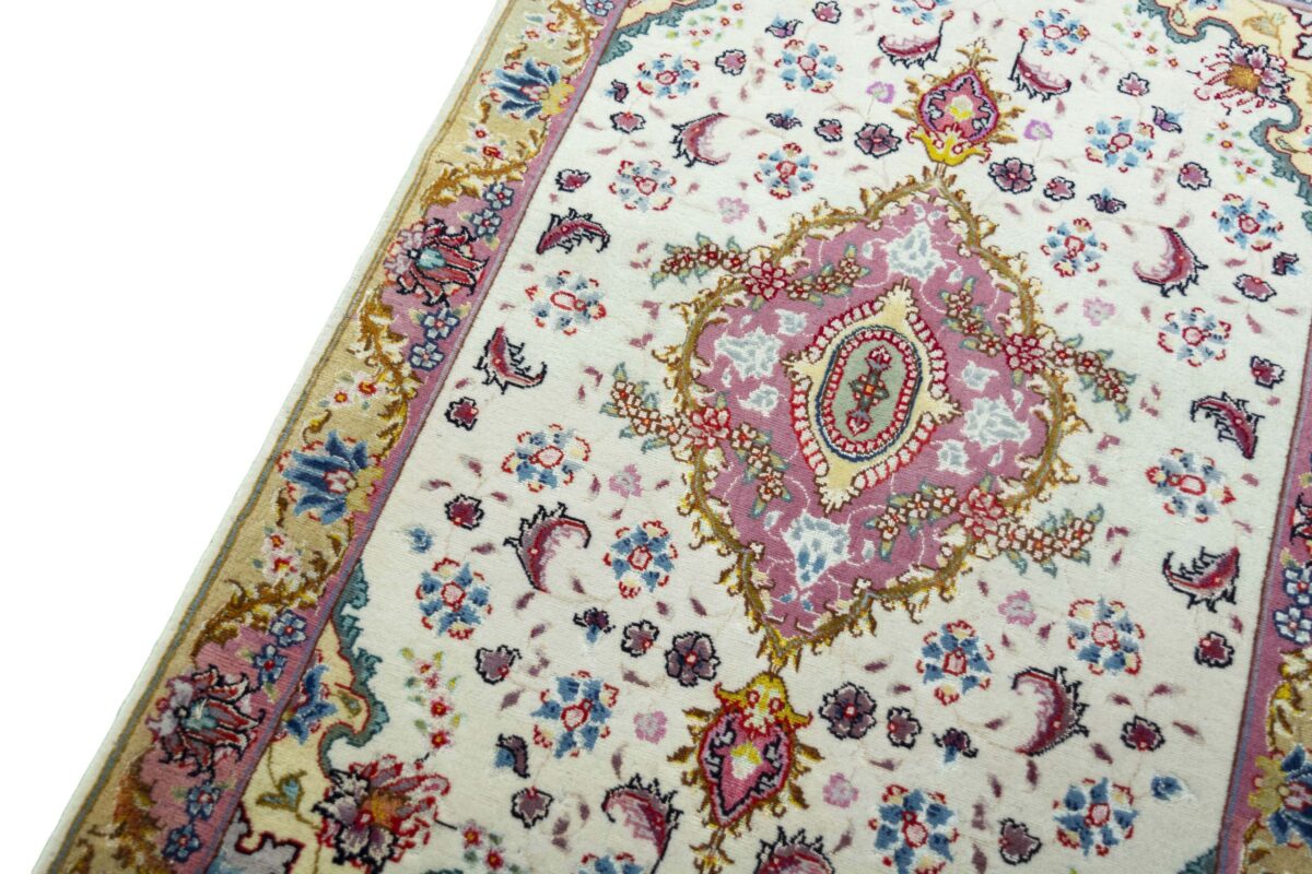 Für die besondere Eleganz des Täbriz-Flors sorgen hervorragende Materialien wie samtig anmutende Korkwolle und glänzende Seidenfäden. Die Knüpfqualität eines Täbriz-Teppichs lässt sich aus der angegebenen Raj-Zahl erschließen – je höher diese ausfällt, umso feiner ist die Knüpfdichte, die eine Million und mehr Knoten pro Quadratmeter erreichen kann. Bei besonders feingeknüpften Qualitäten kommt für die Kette statt des üblichen Baumwollgarns sogar Seide zum Einsatz.