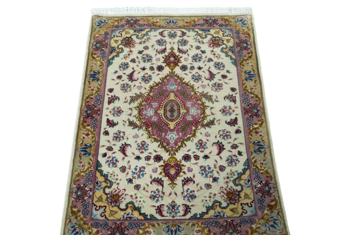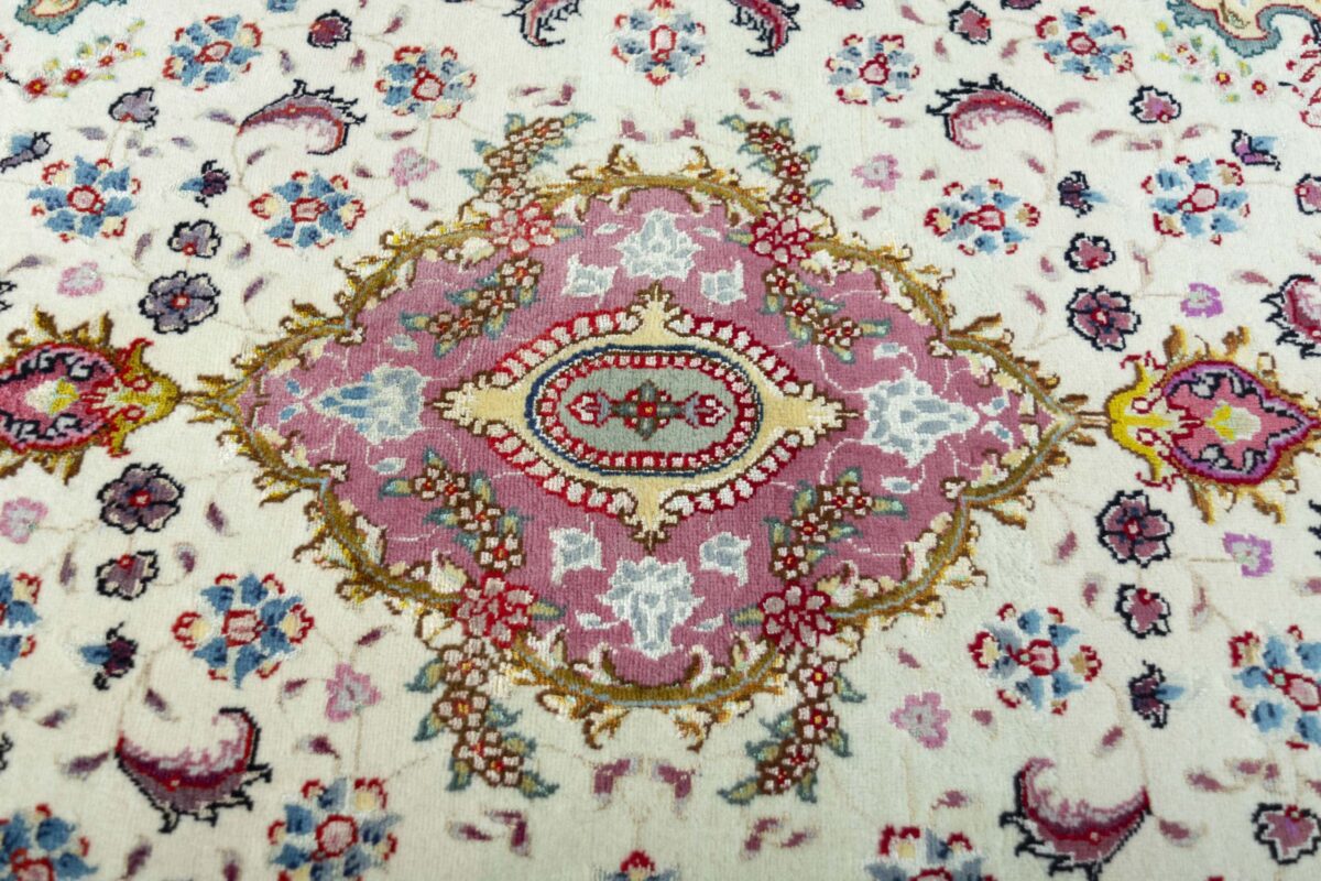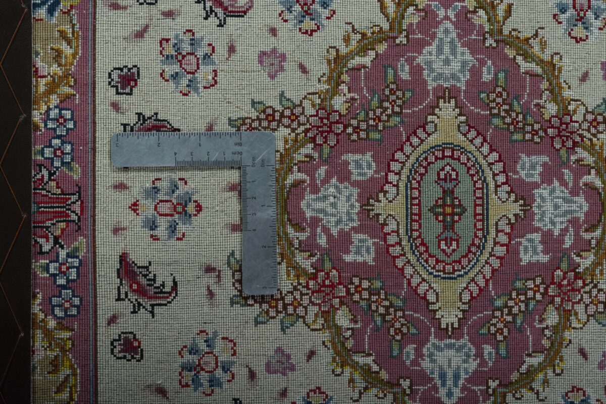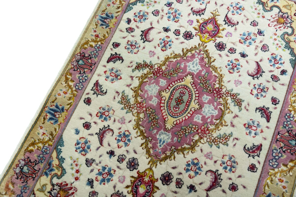 Für die besondere Eleganz des Täbriz-Flors sorgen hervorragende Materialien wie samtig anmutende Korkwolle und glänzende Seidenfäden. Die Knüpfqualität eines Täbriz-Teppichs lässt sich aus der angegebenen Raj-Zahl erschließen – je höher diese ausfällt, umso feiner ist die Knüpfdichte, die eine Million und mehr Knoten pro Quadratmeter erreichen kann. Bei besonders feingeknüpften Qualitäten kommt für die Kette statt des üblichen Baumwollgarns sogar Seide zum Einsatz.