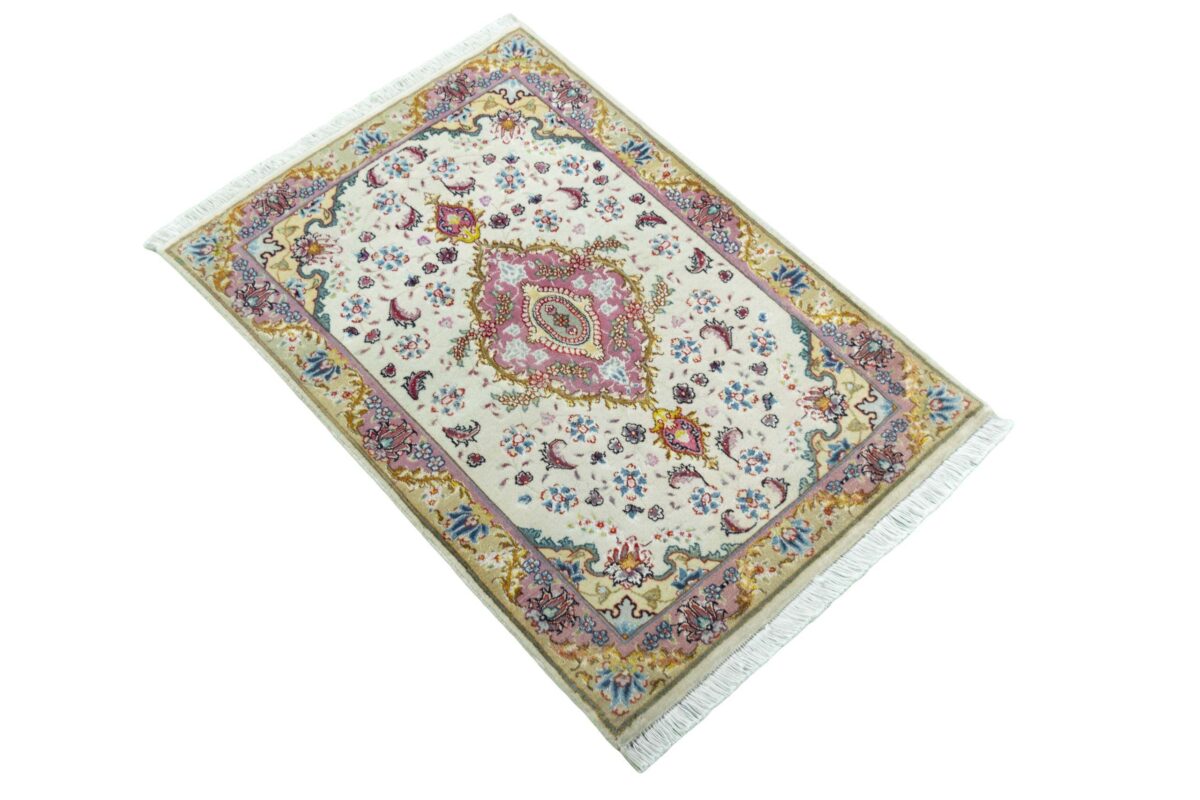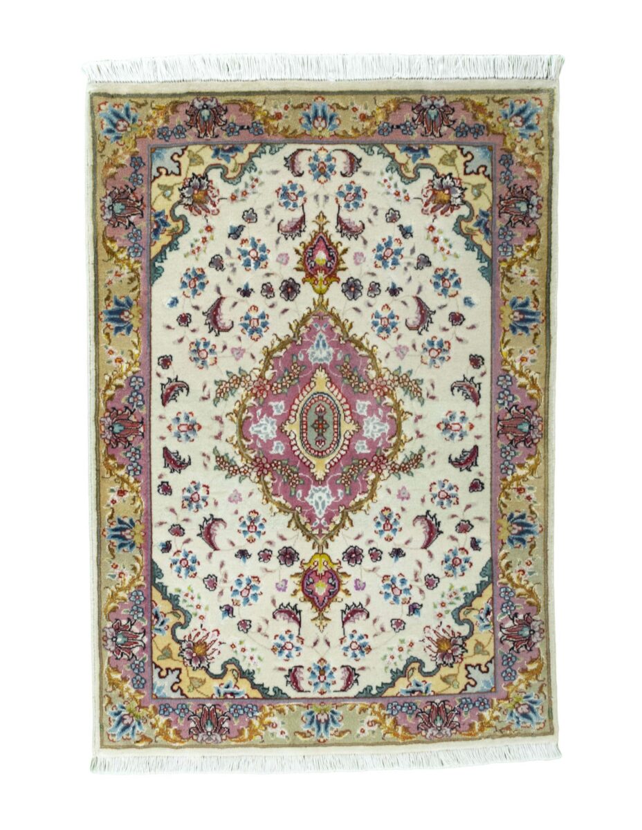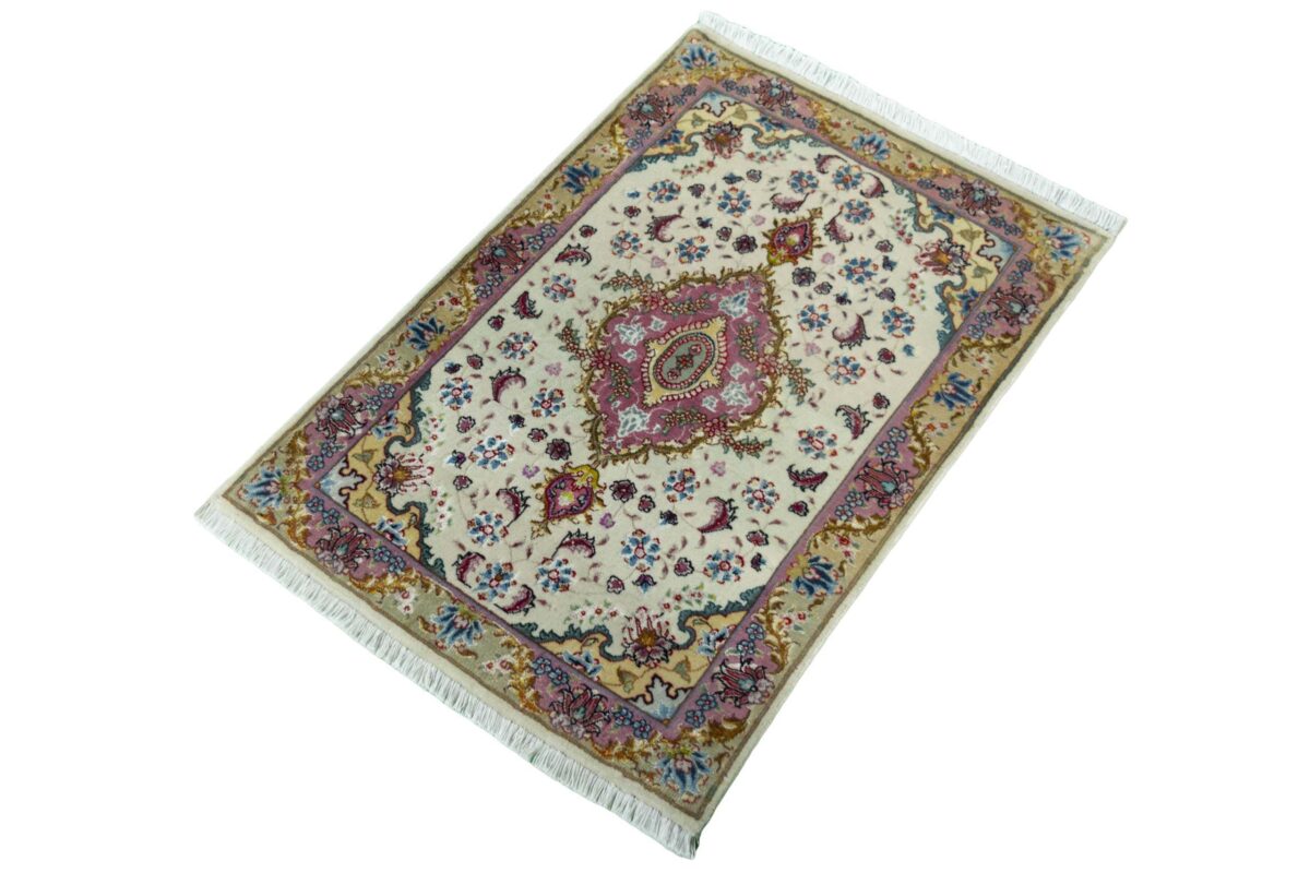 Für die besondere Eleganz des Täbriz-Flors sorgen hervorragende Materialien wie samtig anmutende Korkwolle und glänzende Seidenfäden. Die Knüpfqualität eines Täbriz-Teppichs lässt sich aus der angegebenen Raj-Zahl erschließen – je höher diese ausfällt, umso feiner ist die Knüpfdichte, die eine Million und mehr Knoten pro Quadratmeter erreichen kann. Bei besonders feingeknüpften Qualitäten kommt für die Kette statt des üblichen Baumwollgarns sogar Seide zum Einsatz.