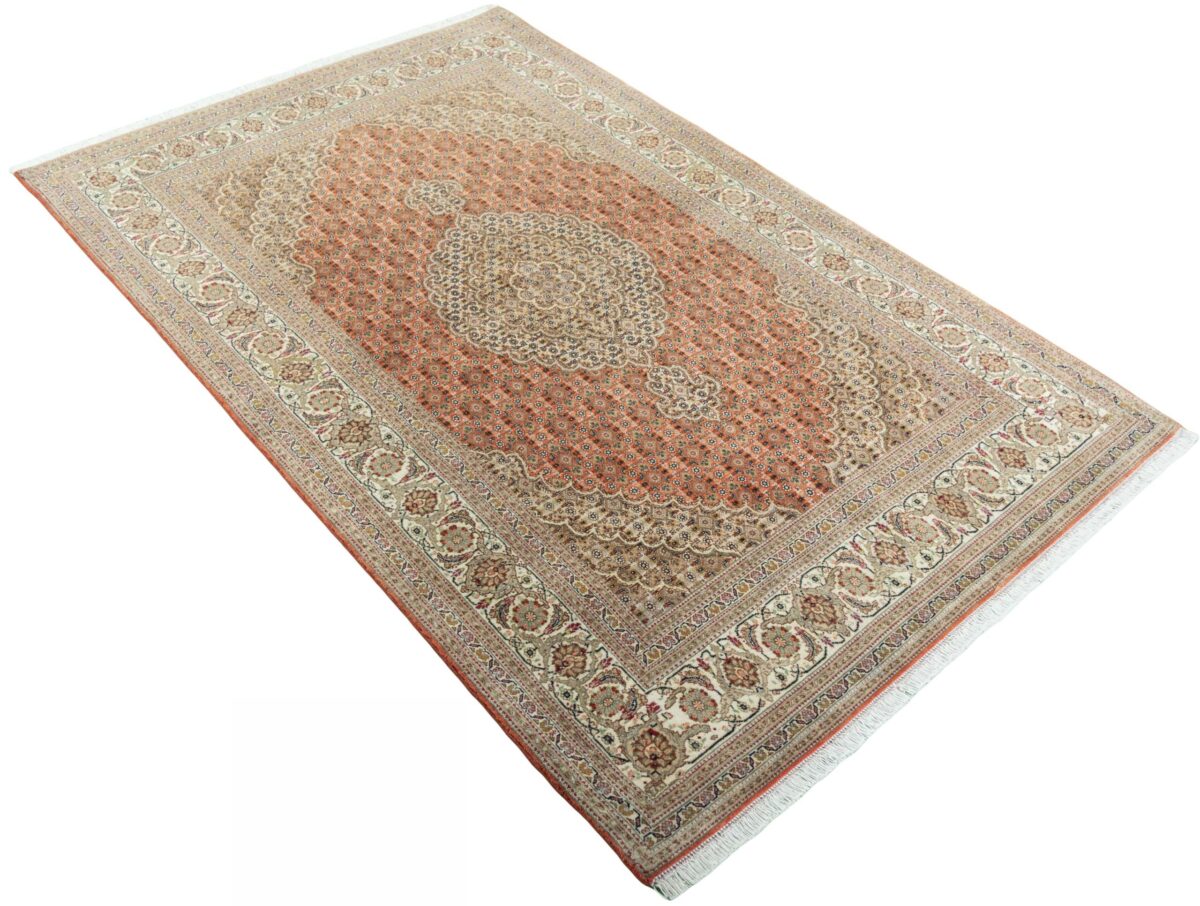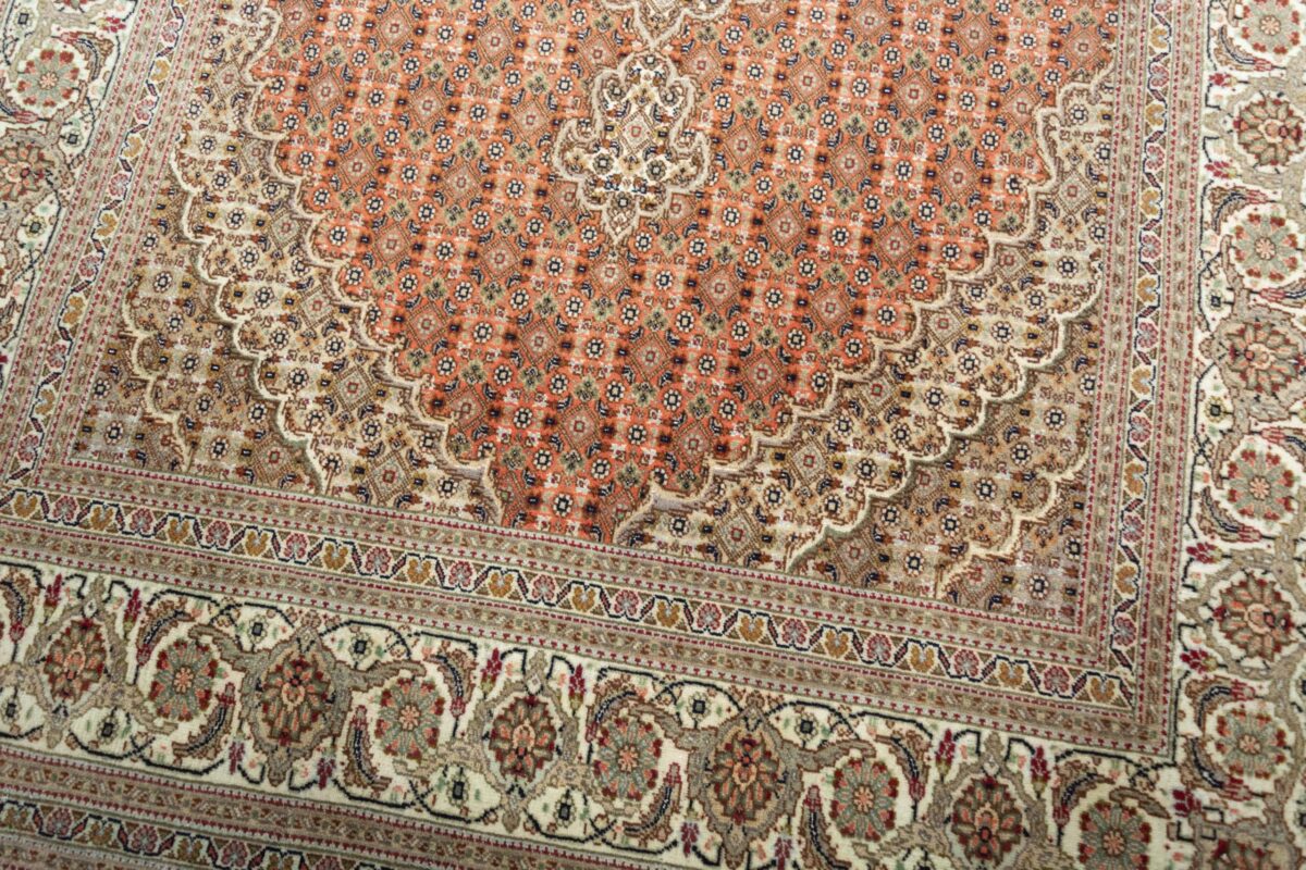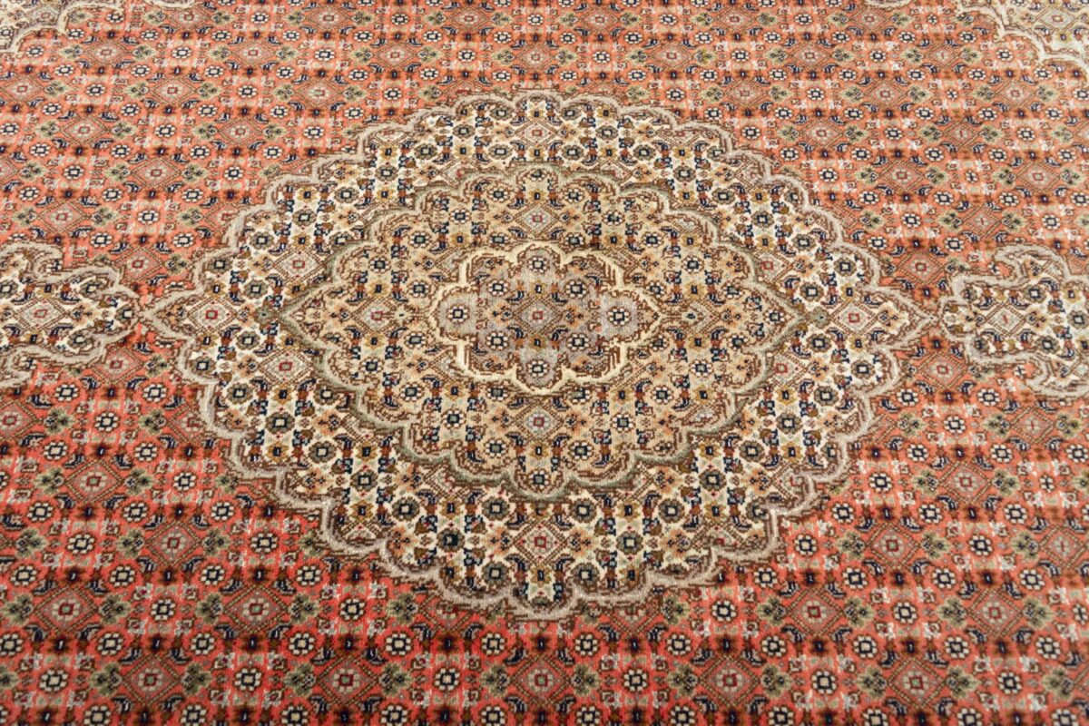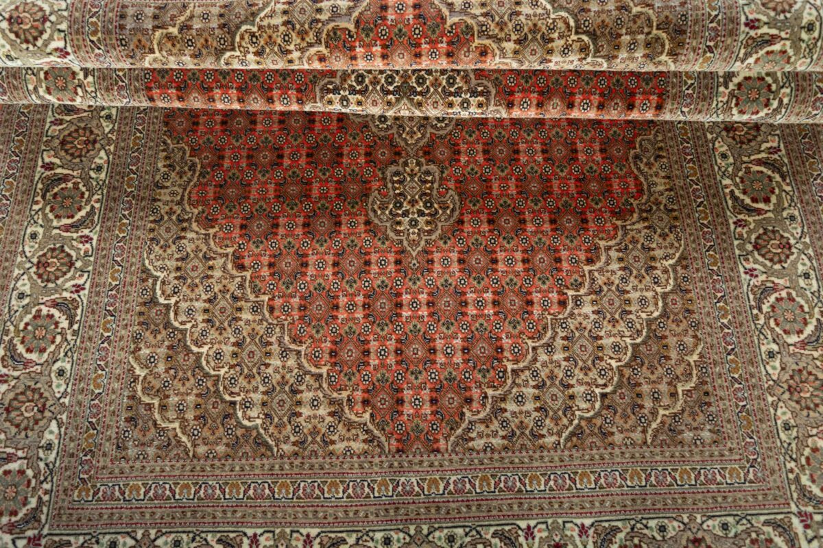Für die besondere Eleganz des Täbriz-Flors sorgen hervorragende Materialien wie samtig anmutende Korkwolle und glänzende Seidenfäden. Die Knüpfqualität eines Täbriz-Teppichs lässt sich aus der angegebenen Raj-Zahl erschließen – je höher diese ausfällt, umso feiner ist die Knüpfdichte, die eine Million und mehr Knoten pro Quadratmeter erreichen kann. Bei besonders feingeknüpften Qualitäten kommt für die Kette statt des üblichen Baumwollgarns sogar Seide zum Einsatz.