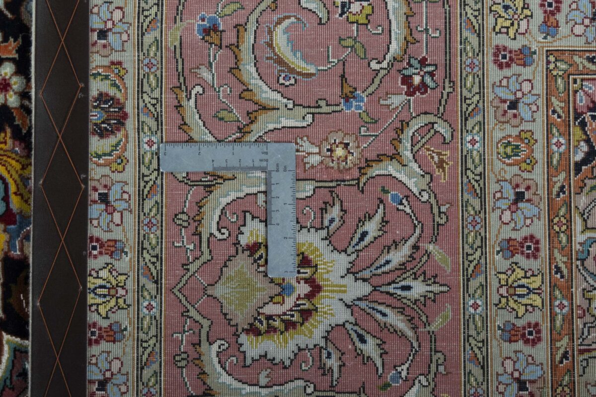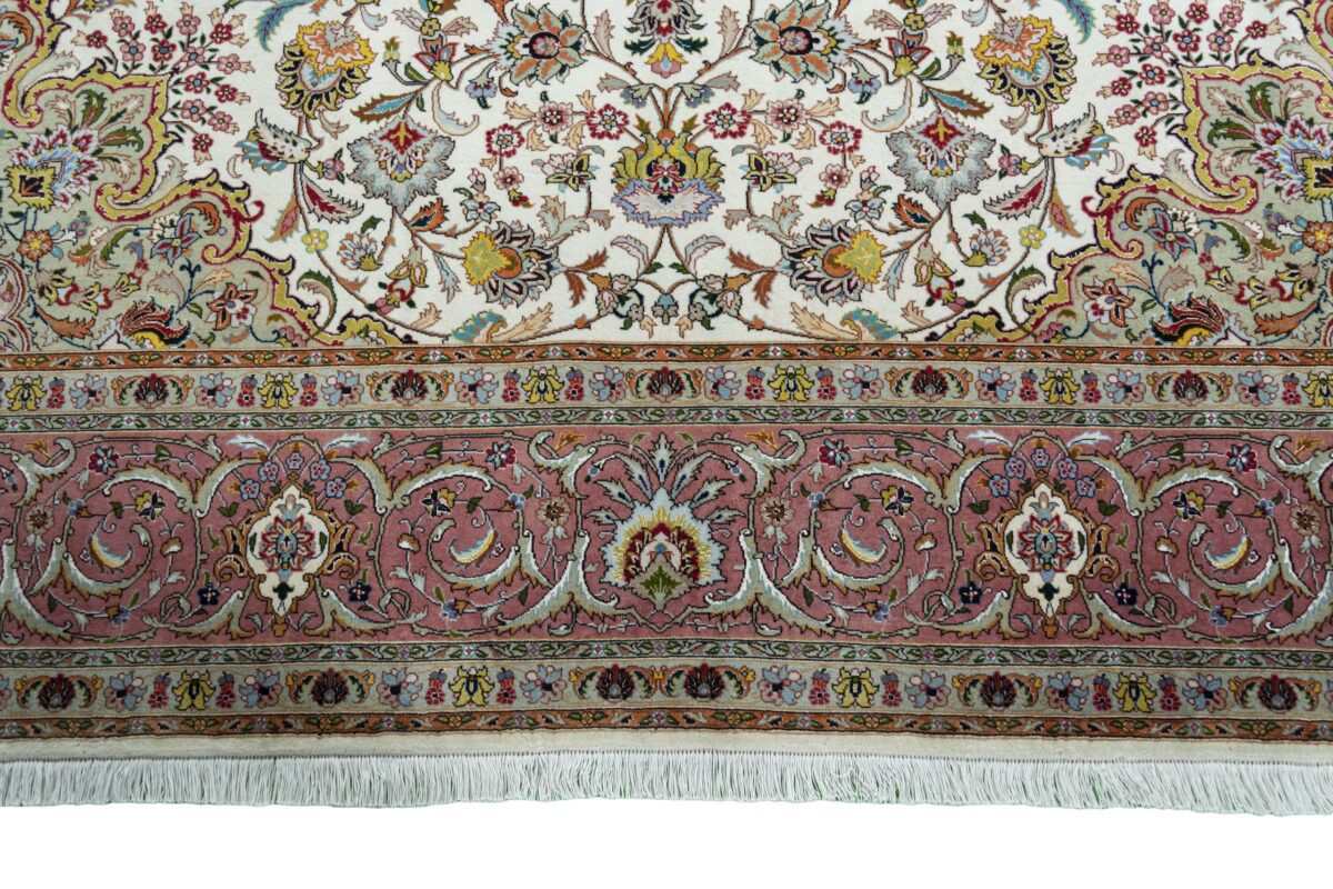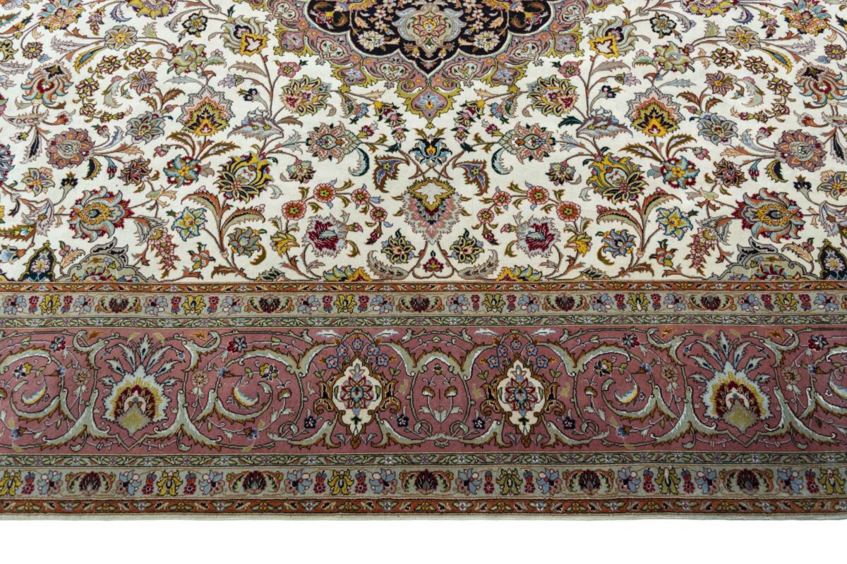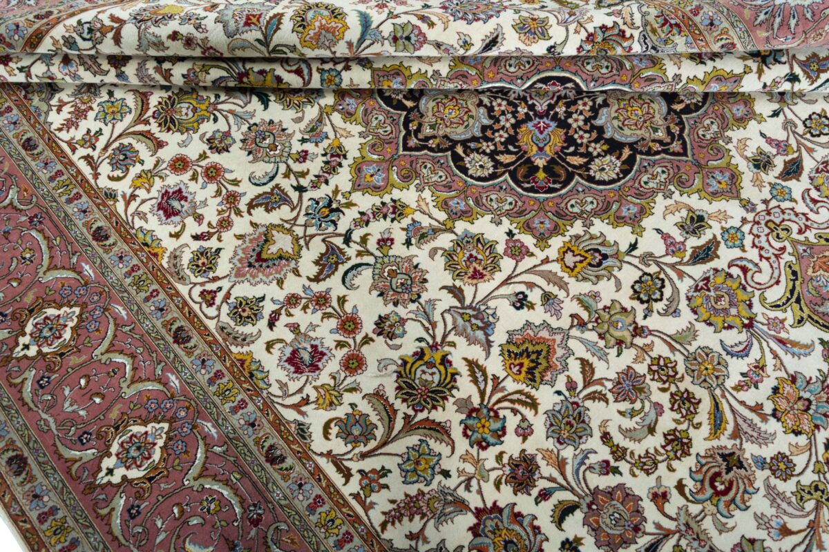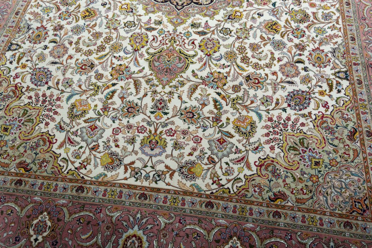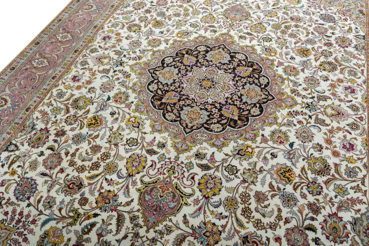 Für die besondere Eleganz des Täbriz-Flors sorgen hervorragende Materialien wie samtig anmutende Korkwolle und glänzende Seidenfäden. Die Knüpfqualität eines Täbriz-Teppichs lässt sich aus der angegebenen Raj-Zahl erschließen – je höher diese ausfällt, umso feiner ist die Knüpfdichte, die eine Million und mehr Knoten pro Quadratmeter erreichen kann. Bei besonders feingeknüpften Qualitäten kommt für die Kette statt des üblichen Baumwollgarns sogar Seide zum Einsatz.