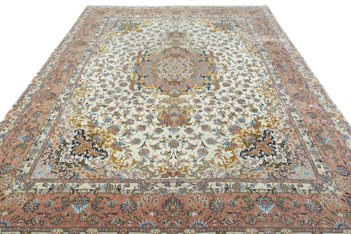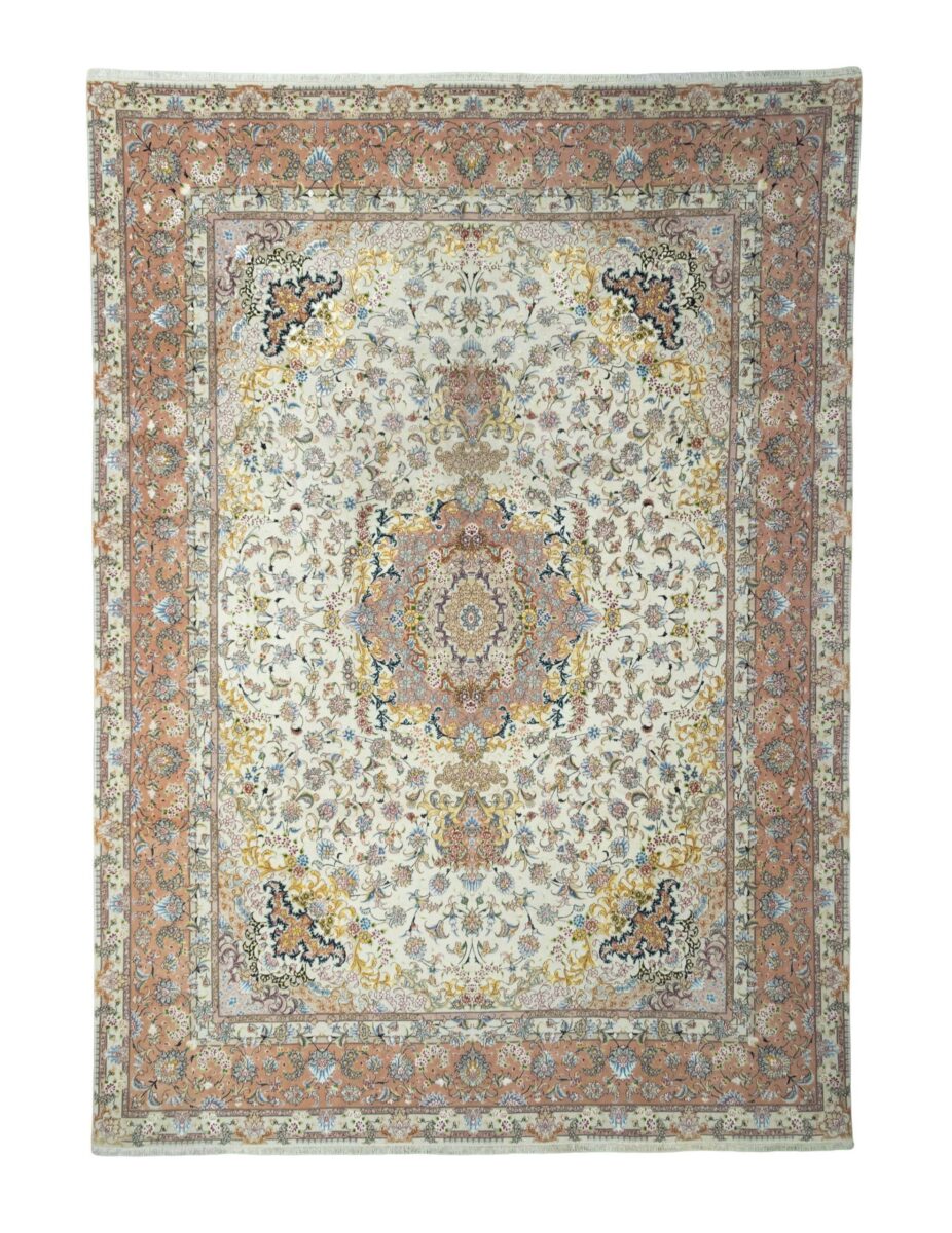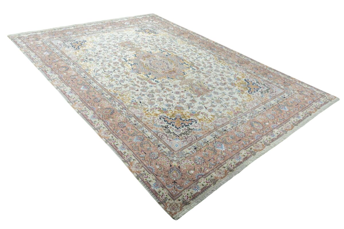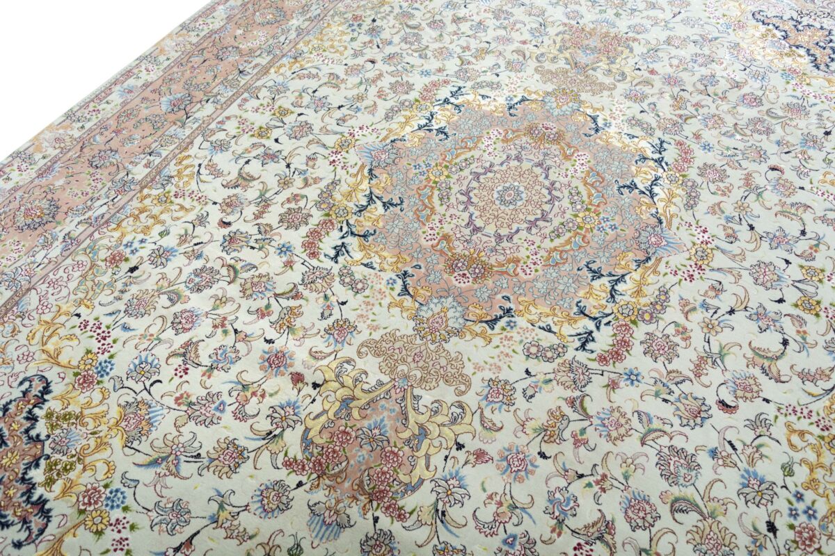 Für die besondere Eleganz des Täbriz-Flors sorgen hervorragende Materialien wie samtig anmutende Korkwolle und glänzende Seidenfäden. Die Knüpfqualität eines Täbriz-Teppichs lässt sich aus der angegebenen Raj-Zahl erschließen – je höher diese ausfällt, umso feiner ist die Knüpfdichte, die eine Million und mehr Knoten pro Quadratmeter erreichen kann. Bei besonders feingeknüpften Qualitäten kommt für die Kette statt des üblichen Baumwollgarns sogar Seide zum Einsatz.