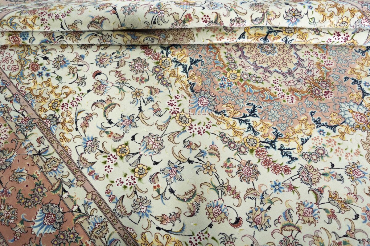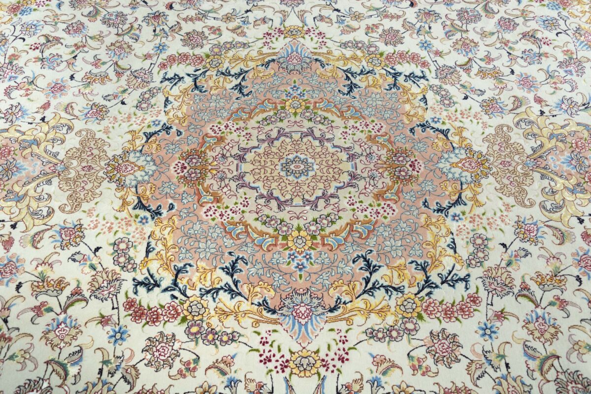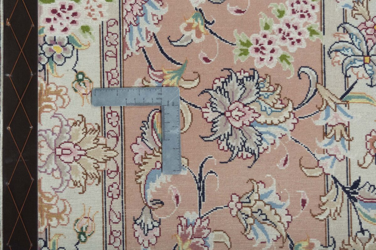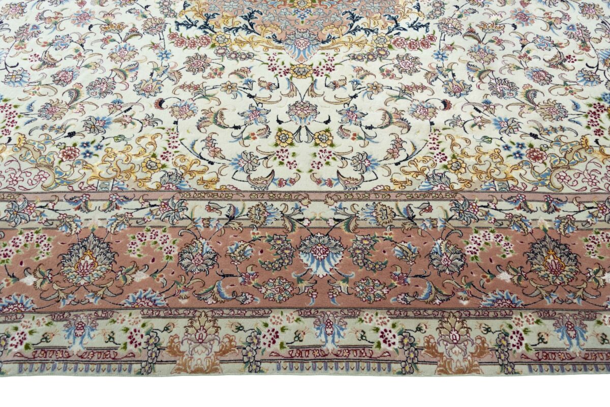 Für die besondere Eleganz des Täbriz-Flors sorgen hervorragende Materialien wie samtig anmutende Korkwolle und glänzende Seidenfäden. Die Knüpfqualität eines Täbriz-Teppichs lässt sich aus der angegebenen Raj-Zahl erschließen – je höher diese ausfällt, umso feiner ist die Knüpfdichte, die eine Million und mehr Knoten pro Quadratmeter erreichen kann. Bei besonders feingeknüpften Qualitäten kommt für die Kette statt des üblichen Baumwollgarns sogar Seide zum Einsatz.