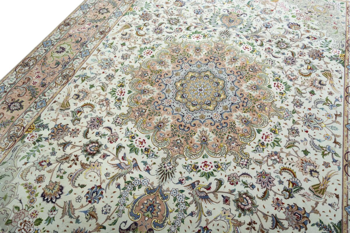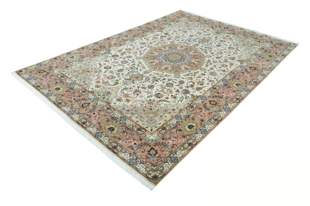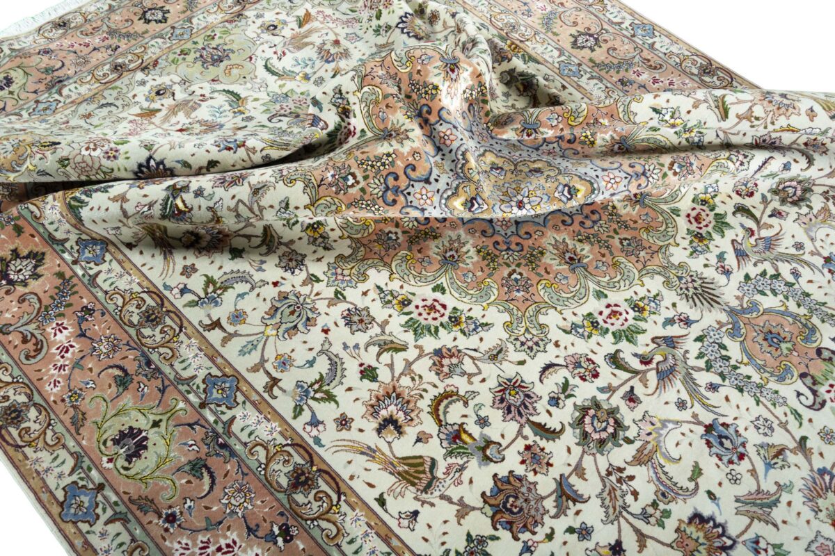 Für die besondere Eleganz des Täbriz-Flors sorgen hervorragende Materialien wie samtig anmutende Korkwolle und glänzende Seidenfäden. Die Knüpfqualität eines Täbriz-Teppichs lässt sich aus der angegebenen Raj-Zahl erschließen – je höher diese ausfällt, umso feiner ist die Knüpfdichte, die eine Million und mehr Knoten pro Quadratmeter erreichen kann. Bei besonders feingeknüpften Qualitäten kommt für die Kette statt des üblichen Baumwollgarns sogar Seide zum Einsatz.