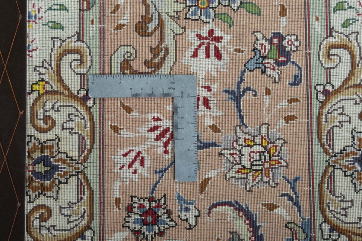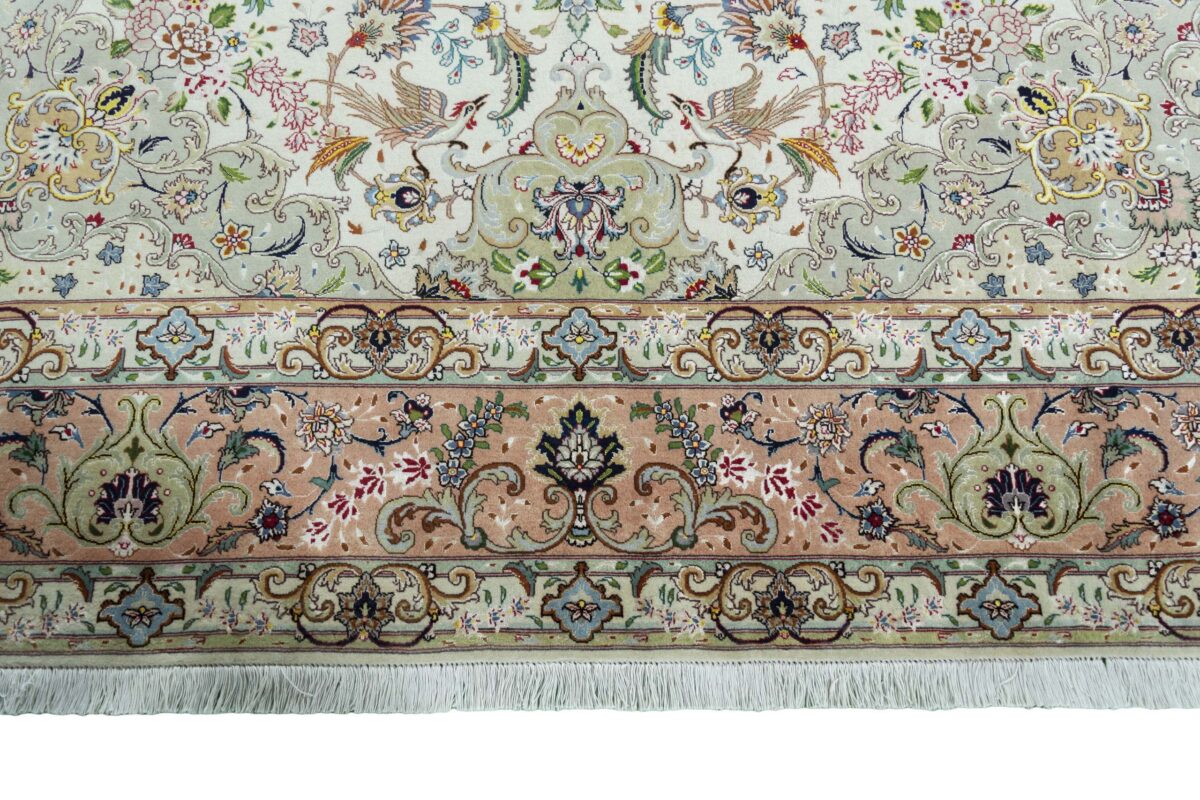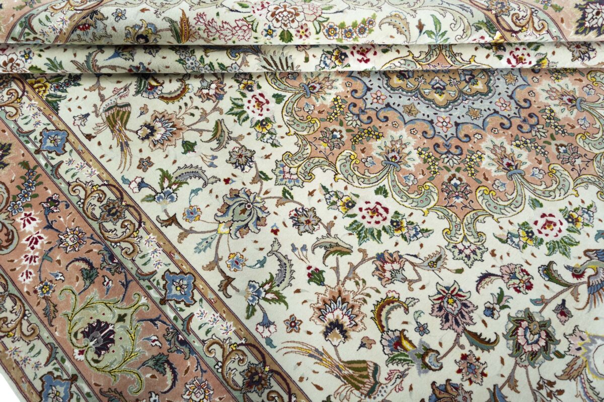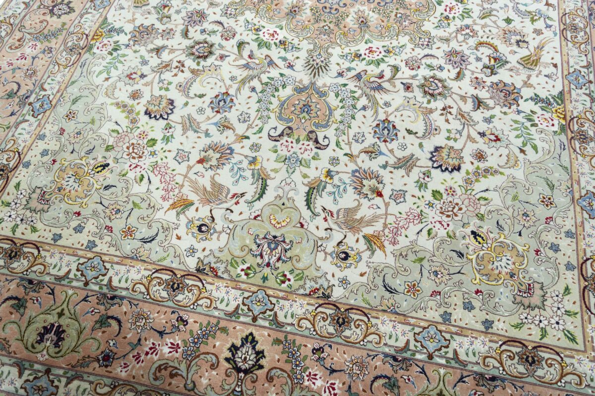 Für die besondere Eleganz des Täbriz-Flors sorgen hervorragende Materialien wie samtig anmutende Korkwolle und glänzende Seidenfäden. Die Knüpfqualität eines Täbriz-Teppichs lässt sich aus der angegebenen Raj-Zahl erschließen – je höher diese ausfällt, umso feiner ist die Knüpfdichte, die eine Million und mehr Knoten pro Quadratmeter erreichen kann. Bei besonders feingeknüpften Qualitäten kommt für die Kette statt des üblichen Baumwollgarns sogar Seide zum Einsatz.