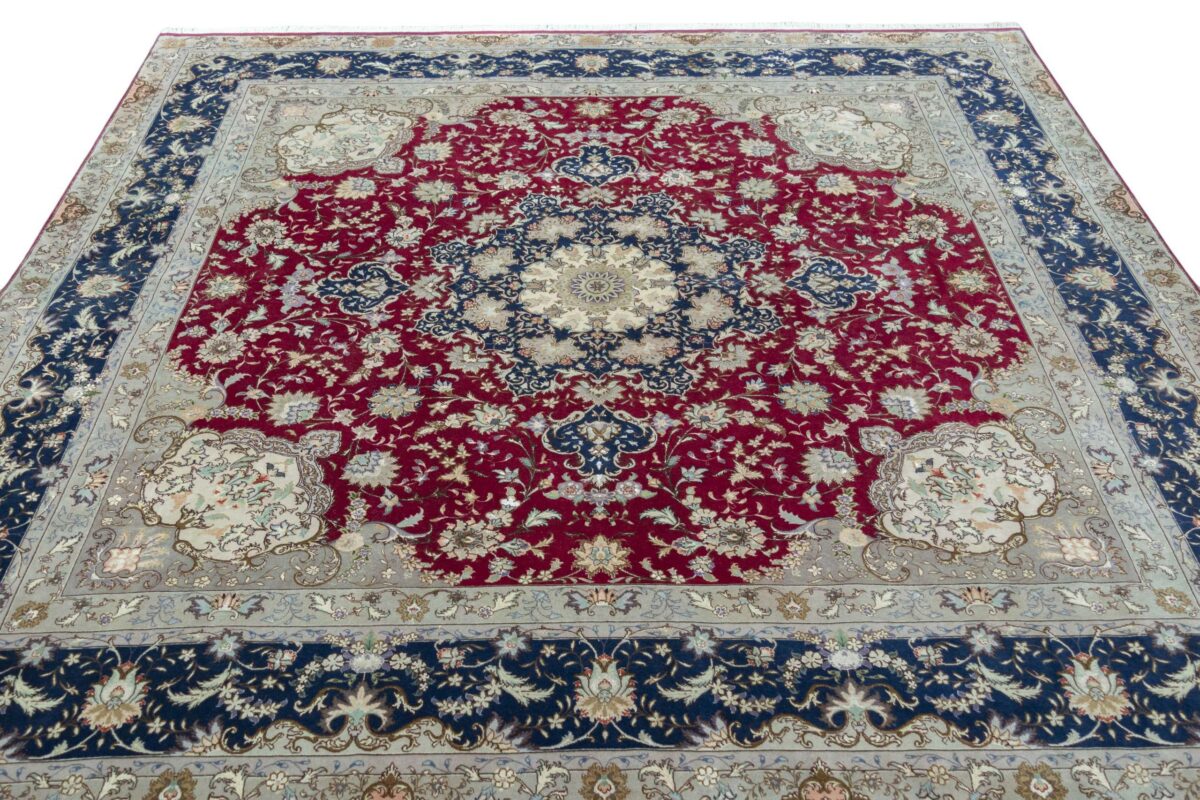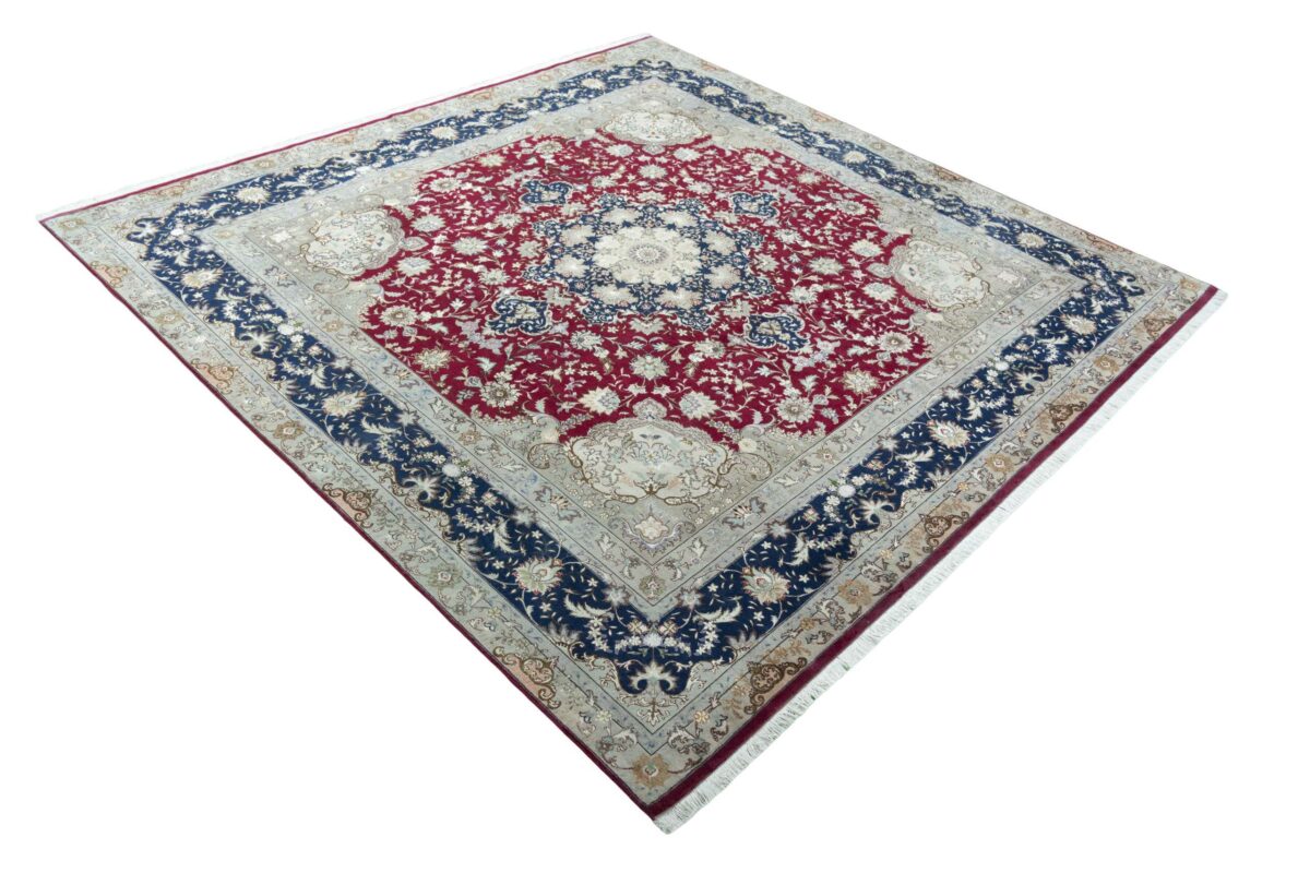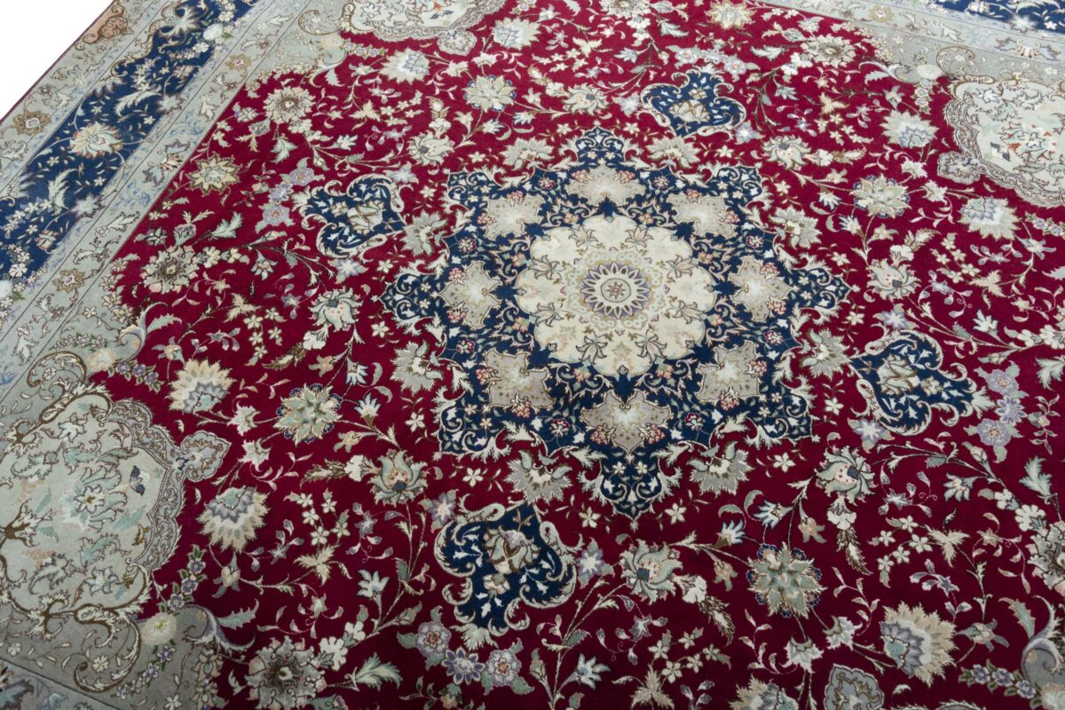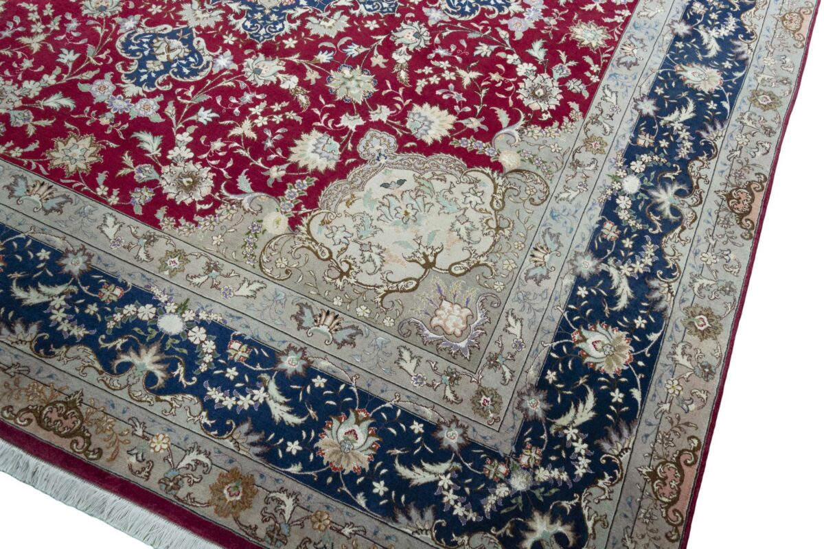 Für die besondere Eleganz des Täbriz-Flors sorgen hervorragende Materialien wie samtig anmutende Korkwolle und glänzende Seidenfäden. Die Knüpfqualität eines Täbriz-Teppichs lässt sich aus der angegebenen Raj-Zahl erschließen – je höher diese ausfällt, umso feiner ist die Knüpfdichte, die eine Million und mehr Knoten pro Quadratmeter erreichen kann. Bei besonders feingeknüpften Qualitäten kommt für die Kette statt des üblichen Baumwollgarns sogar Seide zum Einsatz.