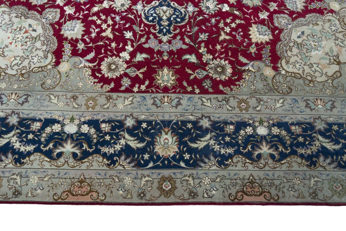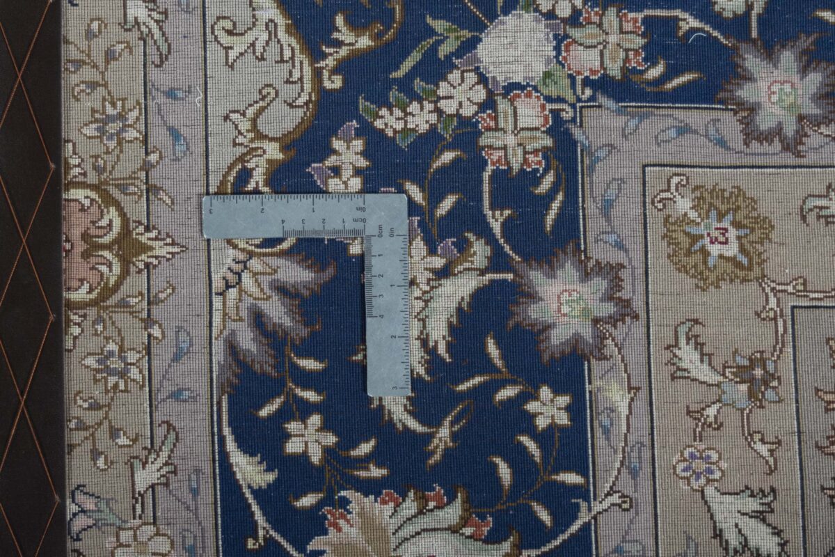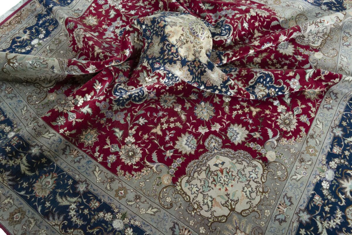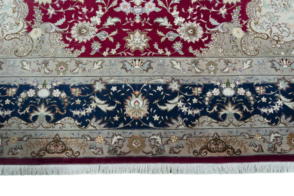 Für die besondere Eleganz des Täbriz-Flors sorgen hervorragende Materialien wie samtig anmutende Korkwolle und glänzende Seidenfäden. Die Knüpfqualität eines Täbriz-Teppichs lässt sich aus der angegebenen Raj-Zahl erschließen – je höher diese ausfällt, umso feiner ist die Knüpfdichte, die eine Million und mehr Knoten pro Quadratmeter erreichen kann. Bei besonders feingeknüpften Qualitäten kommt für die Kette statt des üblichen Baumwollgarns sogar Seide zum Einsatz.