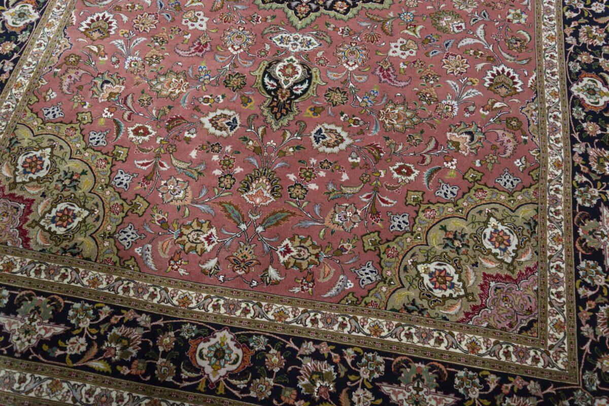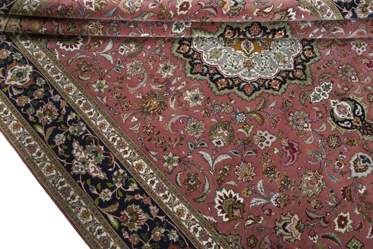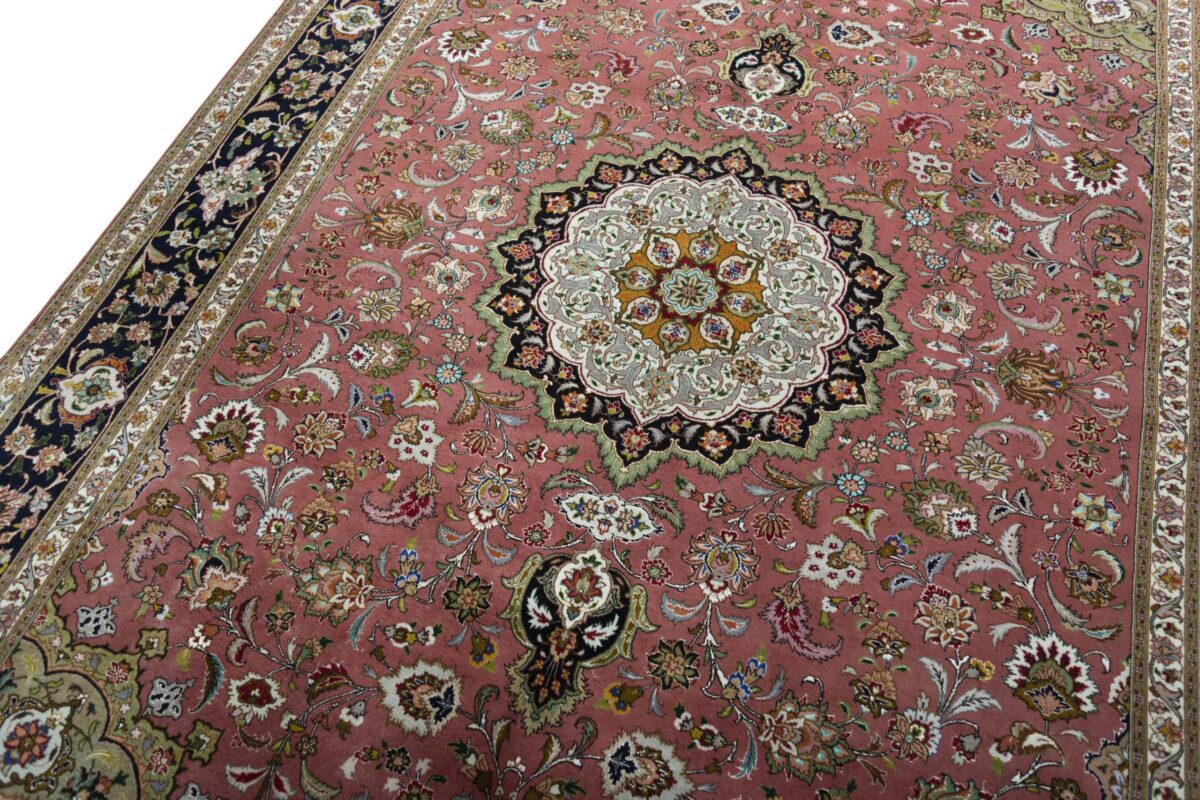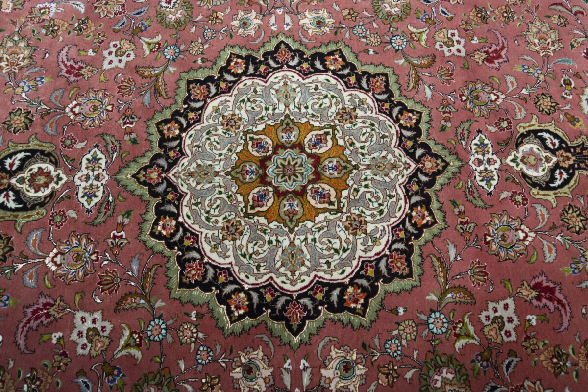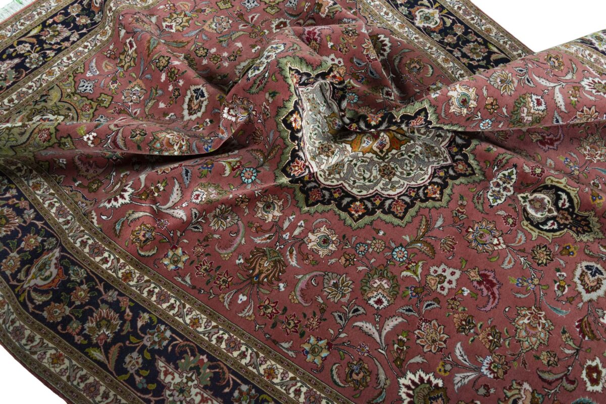 Für die besondere Eleganz des Täbriz-Flors sorgen hervorragende Materialien wie samtig anmutende Korkwolle und glänzende Seidenfäden. Die Knüpfqualität eines Täbriz-Teppichs lässt sich aus der angegebenen Raj-Zahl erschließen – je höher diese ausfällt, umso feiner ist die Knüpfdichte, die eine Million und mehr Knoten pro Quadratmeter erreichen kann. Bei besonders feingeknüpften Qualitäten kommt für die Kette statt des üblichen Baumwollgarns sogar Seide zum Einsatz.