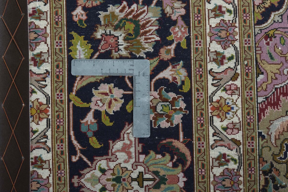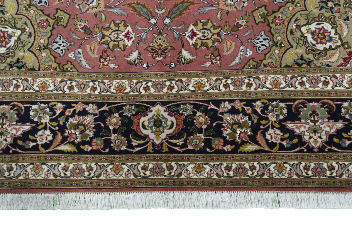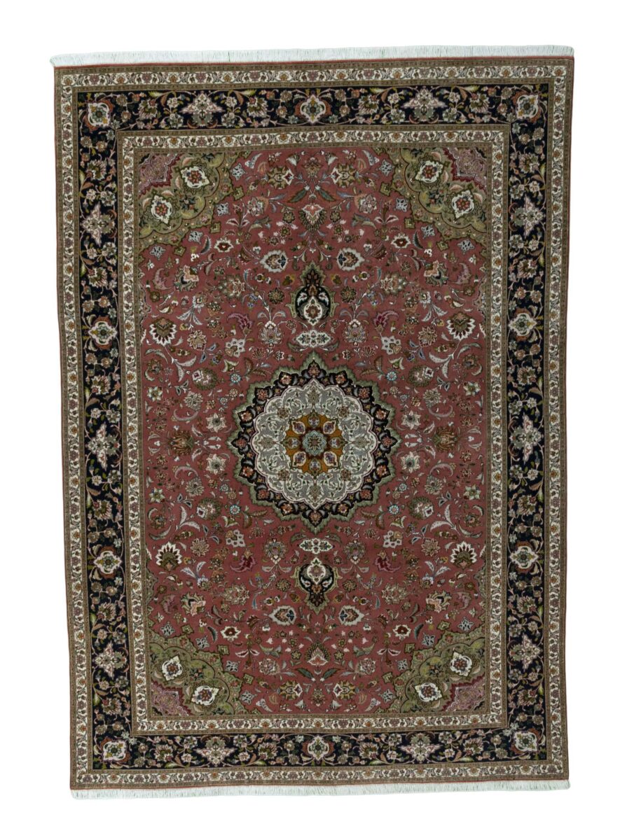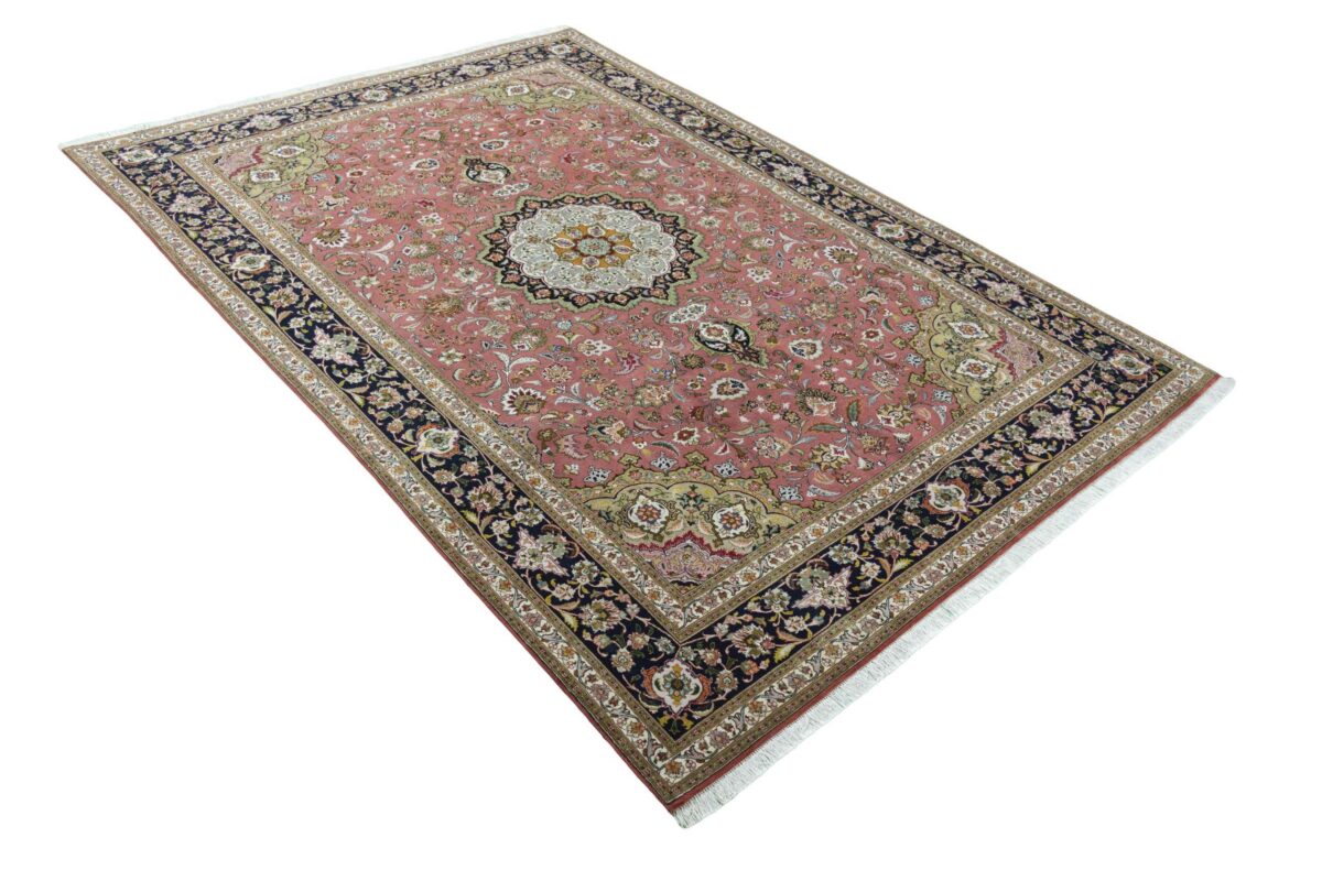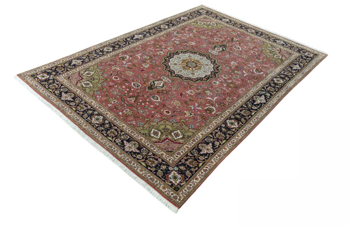 Für die besondere Eleganz des Täbriz-Flors sorgen hervorragende Materialien wie samtig anmutende Korkwolle und glänzende Seidenfäden. Die Knüpfqualität eines Täbriz-Teppichs lässt sich aus der angegebenen Raj-Zahl erschließen – je höher diese ausfällt, umso feiner ist die Knüpfdichte, die eine Million und mehr Knoten pro Quadratmeter erreichen kann. Bei besonders feingeknüpften Qualitäten kommt für die Kette statt des üblichen Baumwollgarns sogar Seide zum Einsatz.