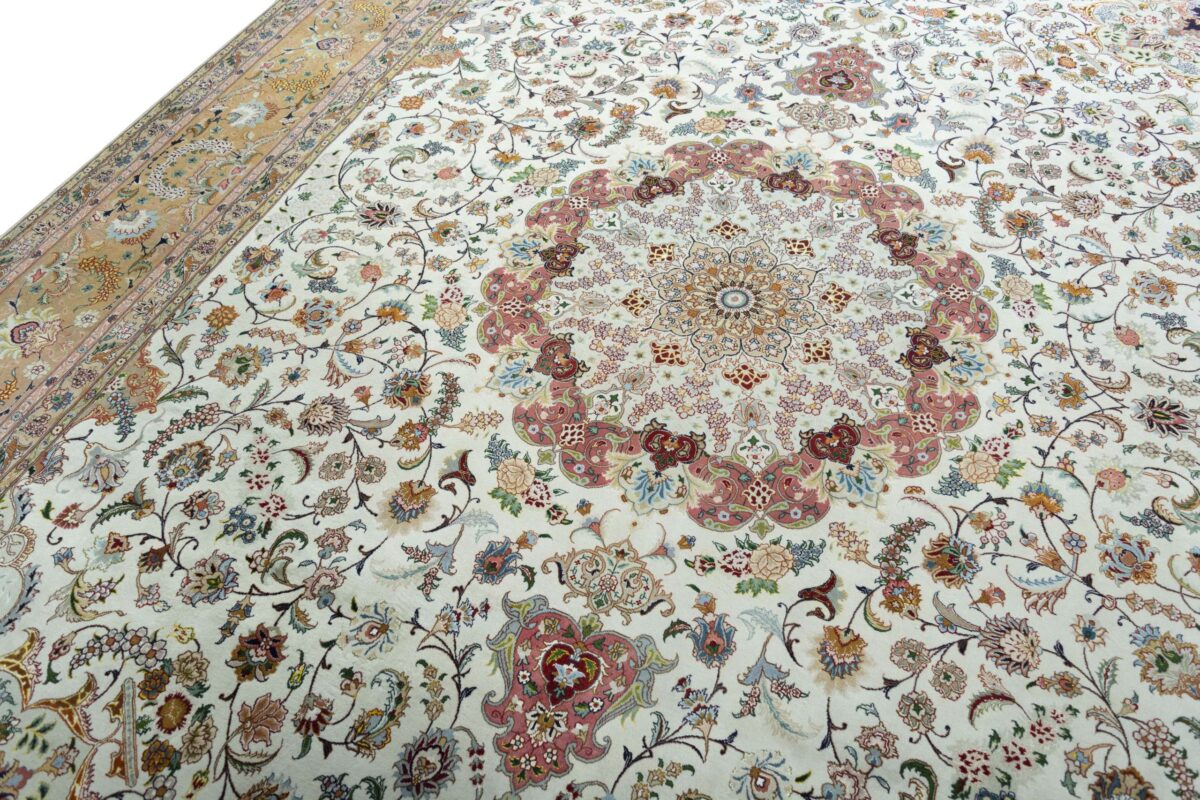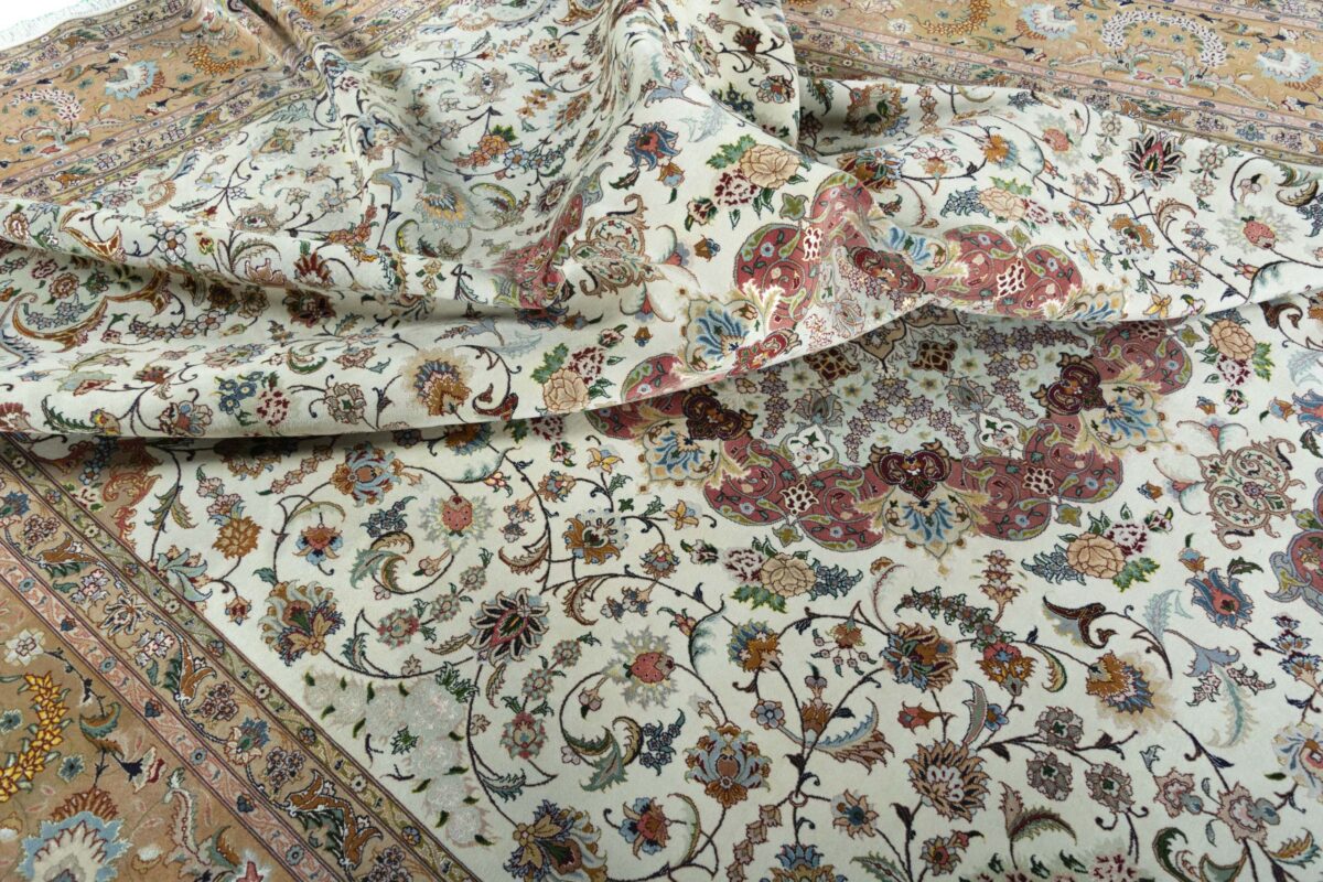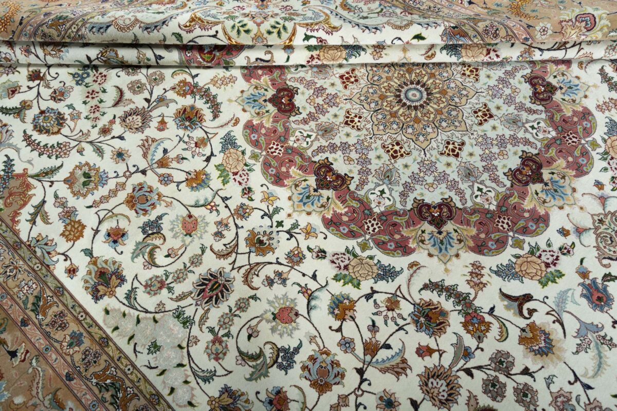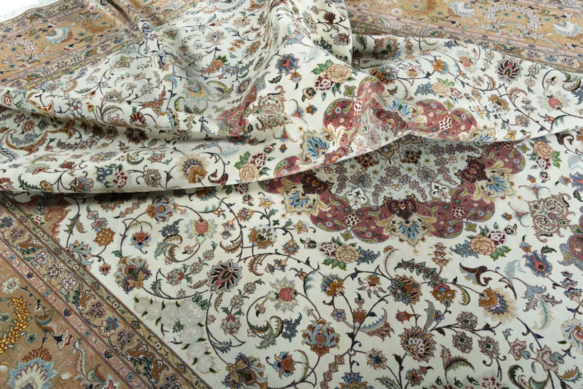 Für die besondere Eleganz des Täbriz-Flors sorgen hervorragende Materialien wie samtig anmutende Korkwolle und glänzende Seidenfäden. Die Knüpfqualität eines Täbriz-Teppichs lässt sich aus der angegebenen Raj-Zahl erschließen – je höher diese ausfällt, umso feiner ist die Knüpfdichte, die eine Million und mehr Knoten pro Quadratmeter erreichen kann. Bei besonders feingeknüpften Qualitäten kommt für die Kette statt des üblichen Baumwollgarns sogar Seide zum Einsatz.