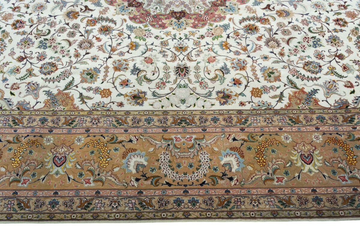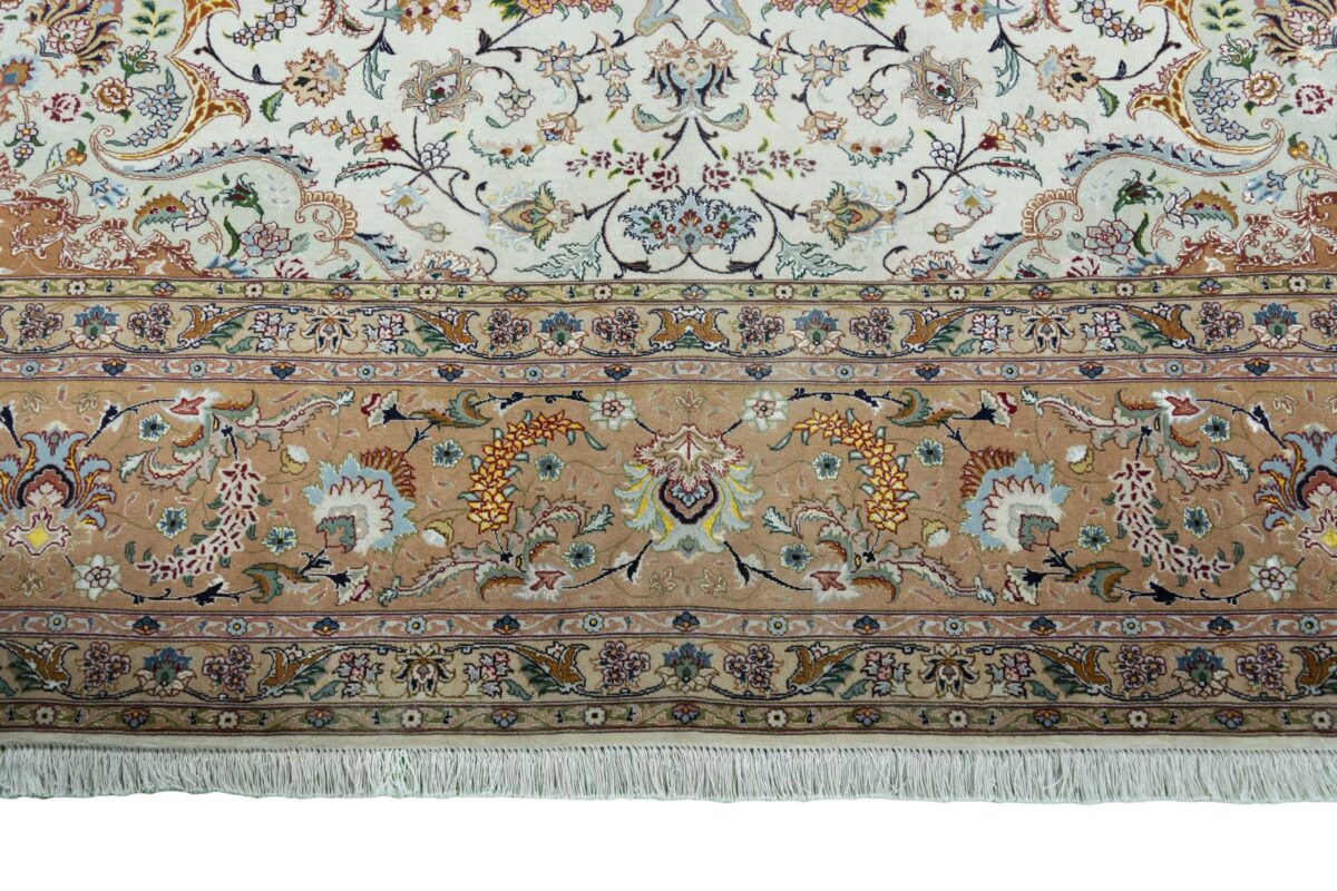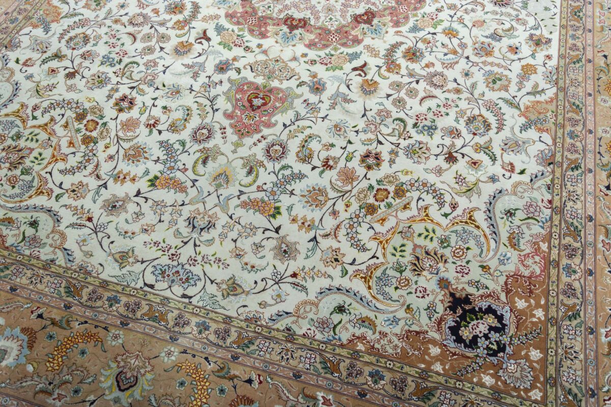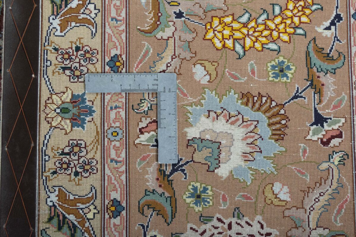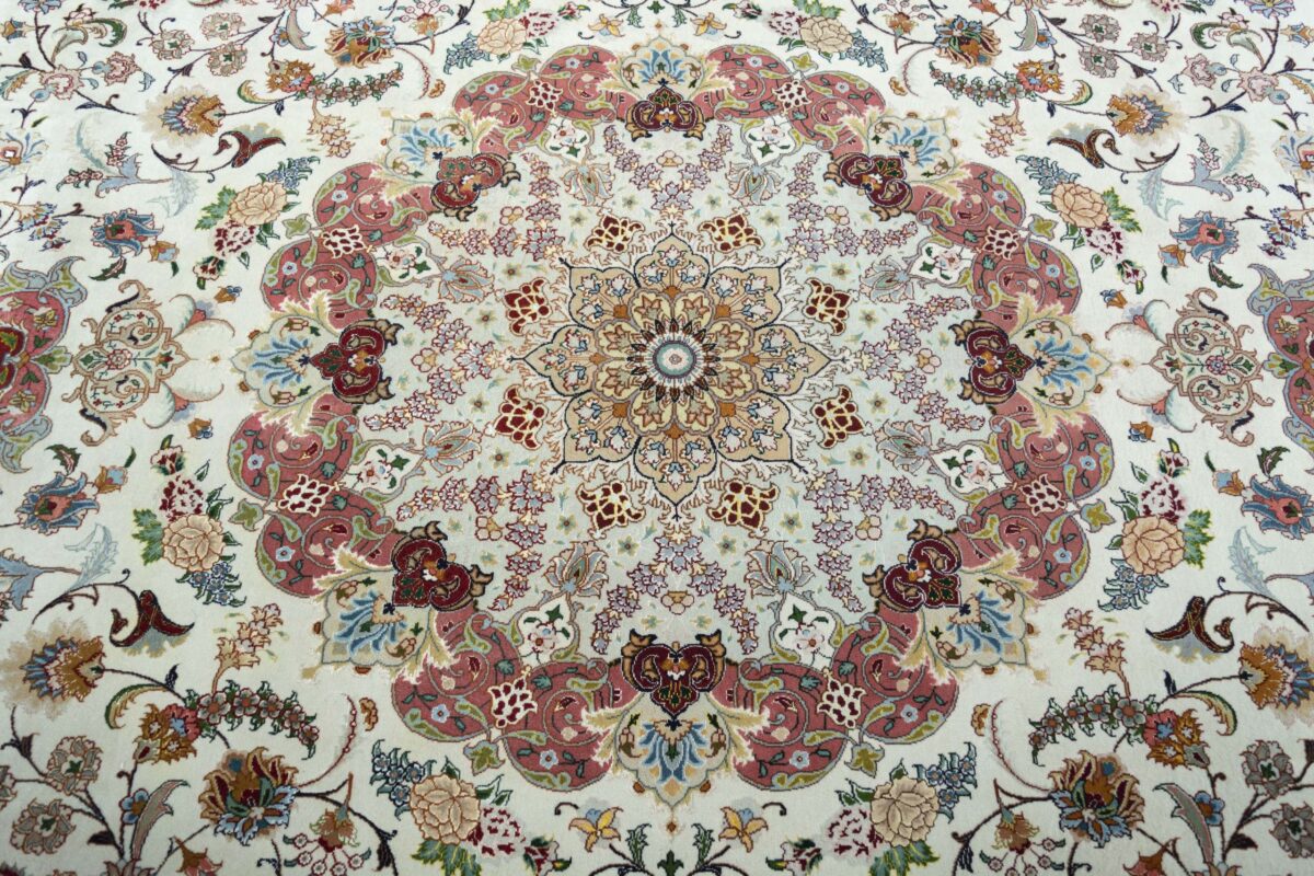 Für die besondere Eleganz des Täbriz-Flors sorgen hervorragende Materialien wie samtig anmutende Korkwolle und glänzende Seidenfäden. Die Knüpfqualität eines Täbriz-Teppichs lässt sich aus der angegebenen Raj-Zahl erschließen – je höher diese ausfällt, umso feiner ist die Knüpfdichte, die eine Million und mehr Knoten pro Quadratmeter erreichen kann. Bei besonders feingeknüpften Qualitäten kommt für die Kette statt des üblichen Baumwollgarns sogar Seide zum Einsatz.