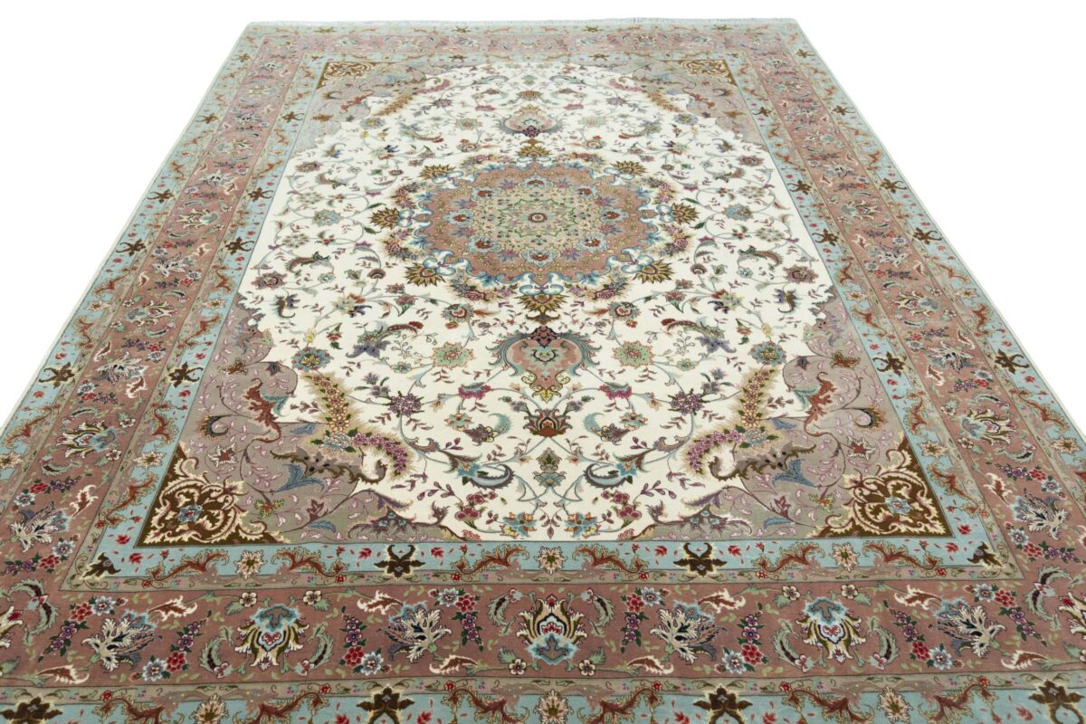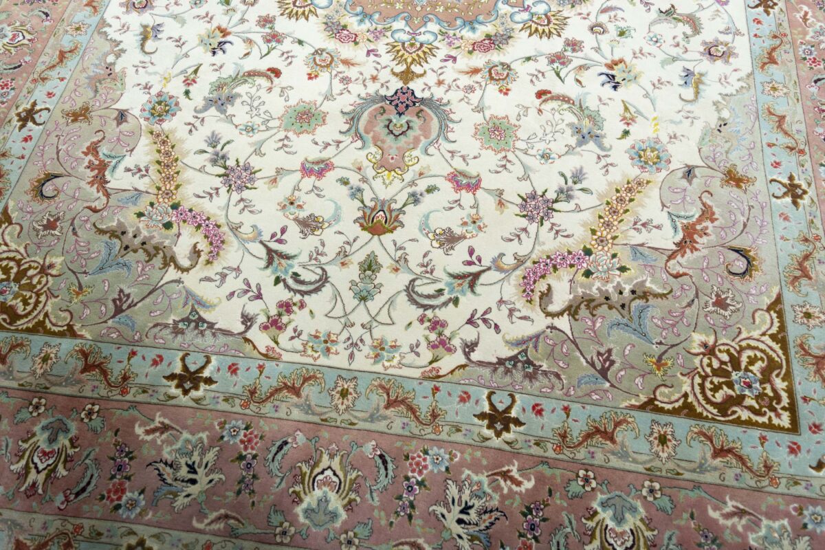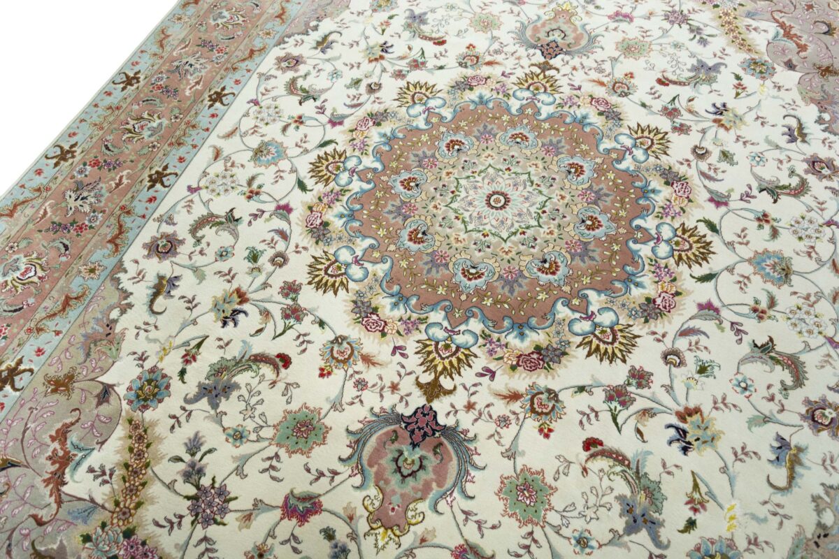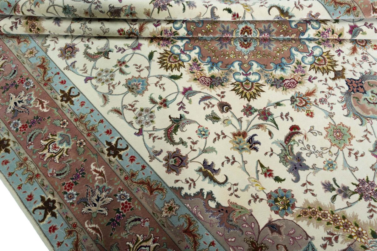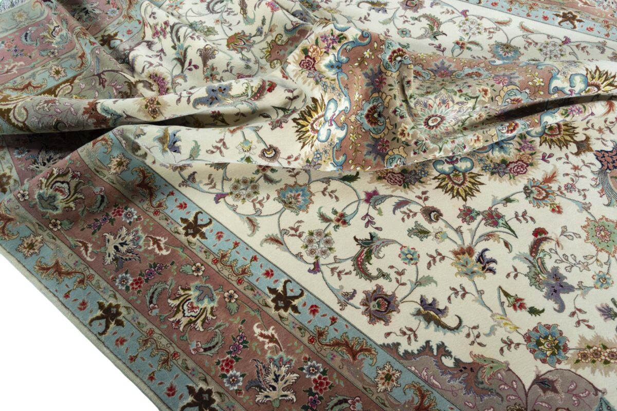 Für die besondere Eleganz des Täbriz-Flors sorgen hervorragende Materialien wie samtig anmutende Korkwolle und glänzende Seidenfäden. Die Knüpfqualität eines Täbriz-Teppichs lässt sich aus der angegebenen Raj-Zahl erschließen – je höher diese ausfällt, umso feiner ist die Knüpfdichte, die eine Million und mehr Knoten pro Quadratmeter erreichen kann. Bei besonders feingeknüpften Qualitäten kommt für die Kette statt des üblichen Baumwollgarns sogar Seide zum Einsatz.