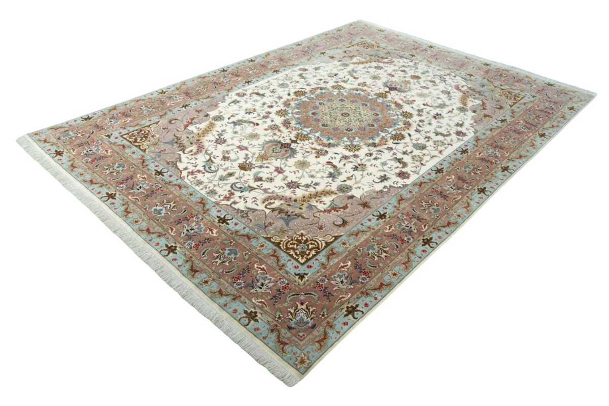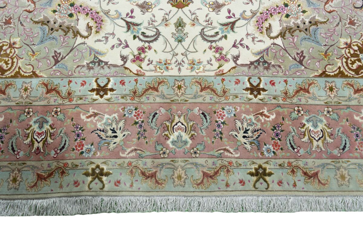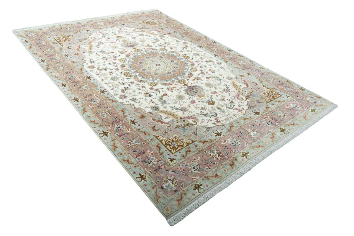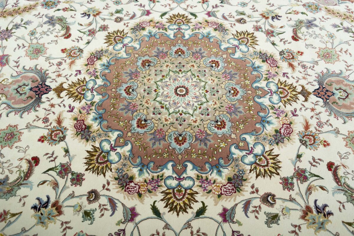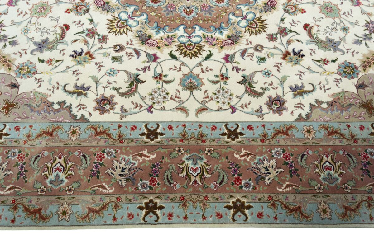 Für die besondere Eleganz des Täbriz-Flors sorgen hervorragende Materialien wie samtig anmutende Korkwolle und glänzende Seidenfäden. Die Knüpfqualität eines Täbriz-Teppichs lässt sich aus der angegebenen Raj-Zahl erschließen – je höher diese ausfällt, umso feiner ist die Knüpfdichte, die eine Million und mehr Knoten pro Quadratmeter erreichen kann. Bei besonders feingeknüpften Qualitäten kommt für die Kette statt des üblichen Baumwollgarns sogar Seide zum Einsatz.
