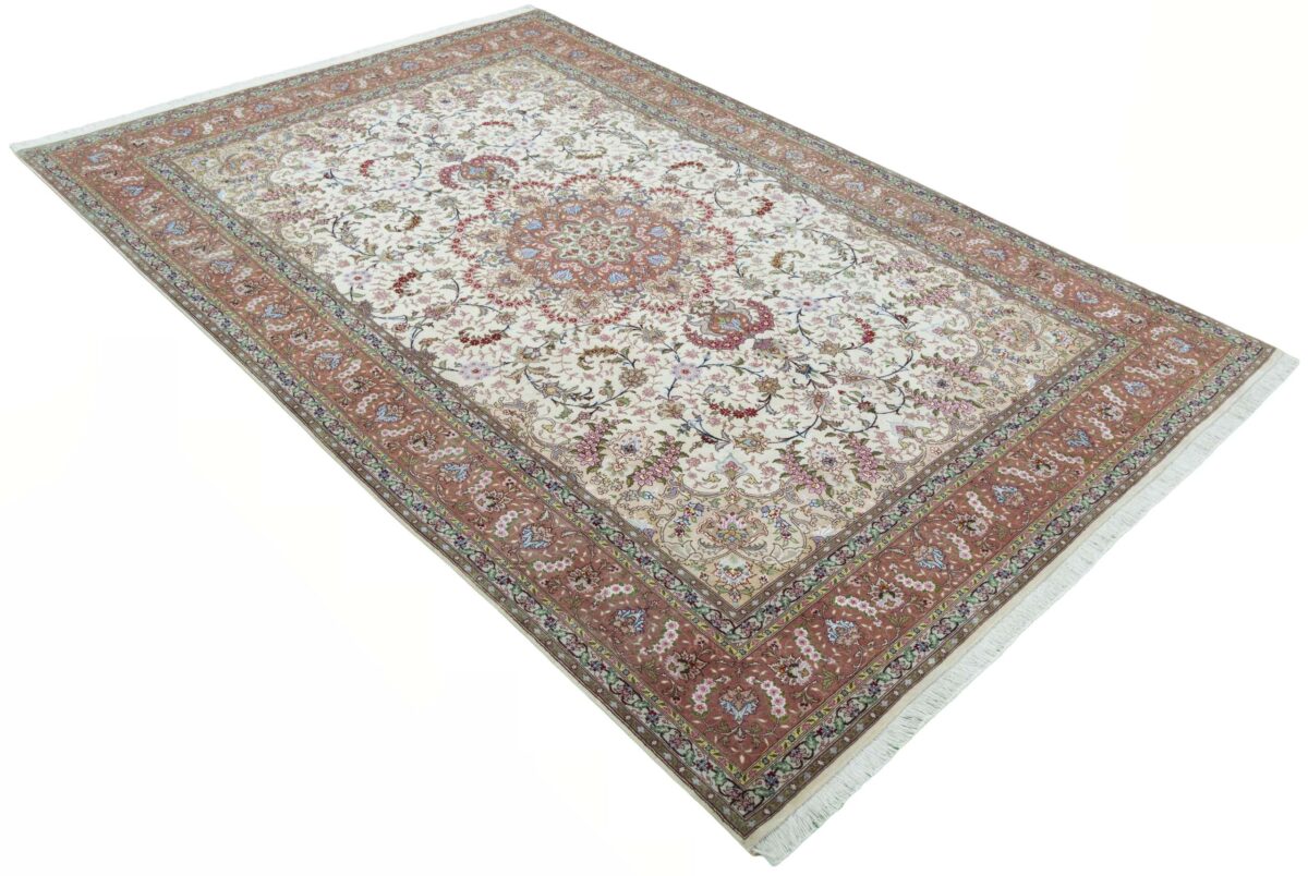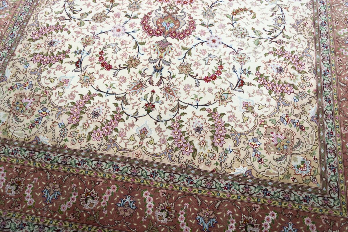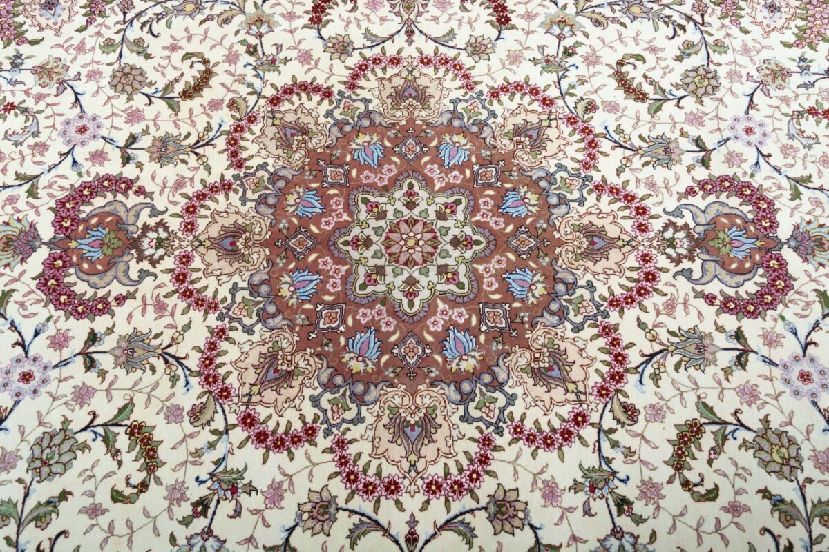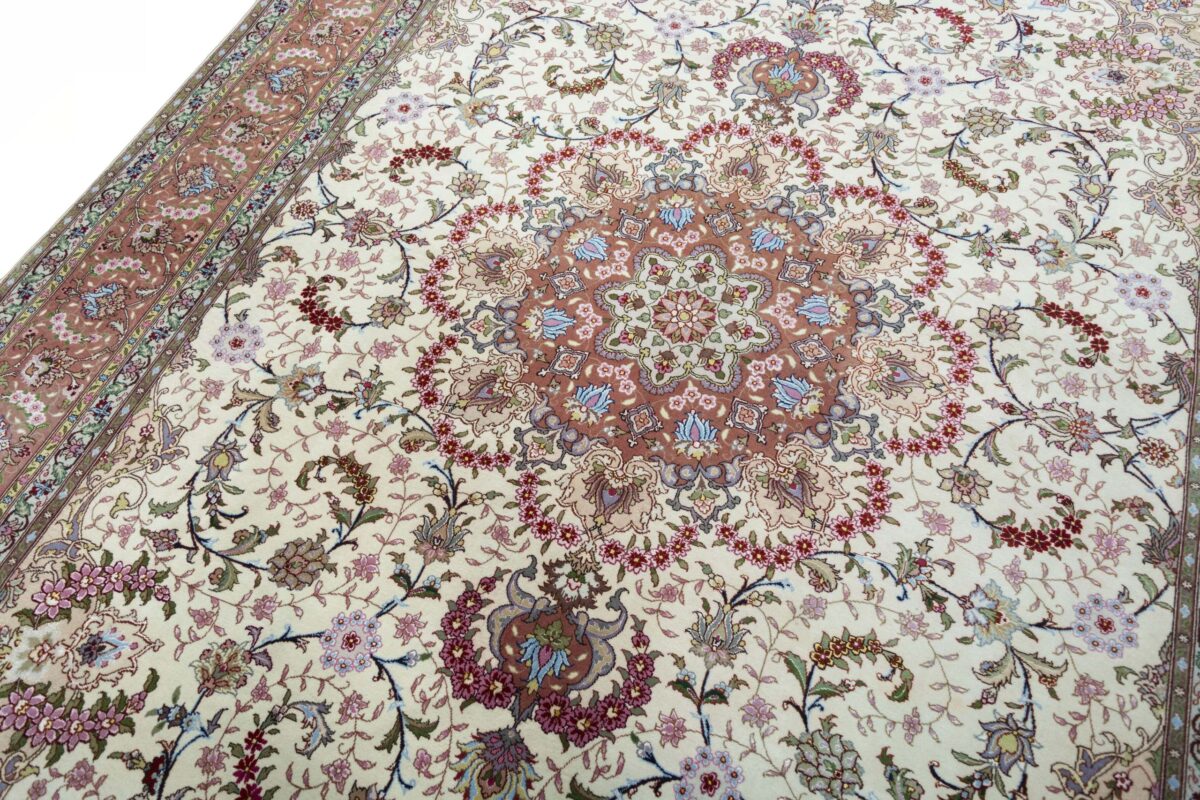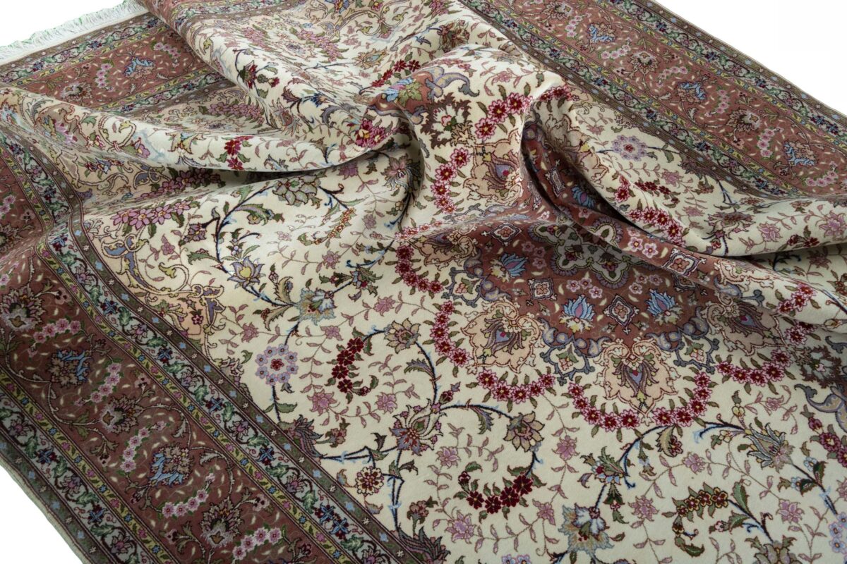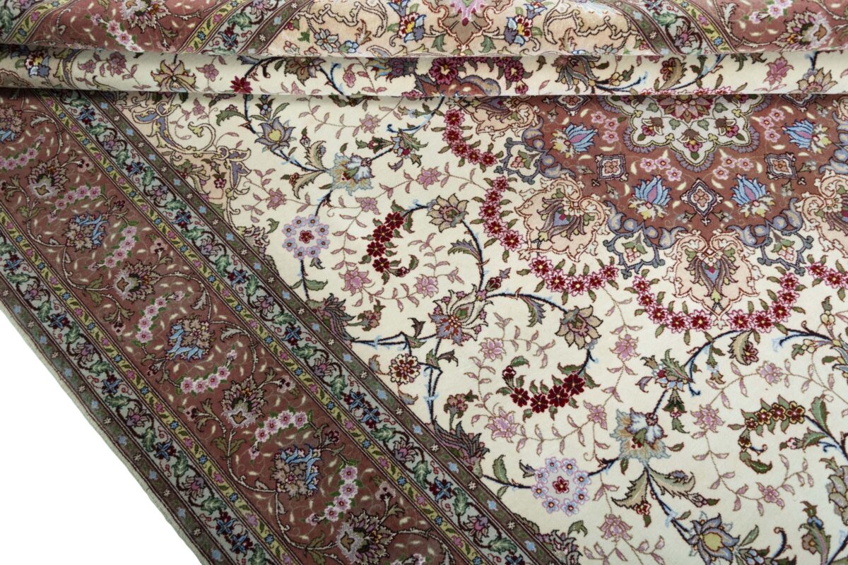 Für die besondere Eleganz des Täbriz-Flors sorgen hervorragende Materialien wie samtig anmutende Korkwolle und glänzende Seidenfäden. Die Knüpfqualität eines Täbriz-Teppichs lässt sich aus der angegebenen Raj-Zahl erschließen – je höher diese ausfällt, umso feiner ist die Knüpfdichte, die eine Million und mehr Knoten pro Quadratmeter erreichen kann. Bei besonders feingeknüpften Qualitäten kommt für die Kette statt des üblichen Baumwollgarns sogar Seide zum Einsatz.
