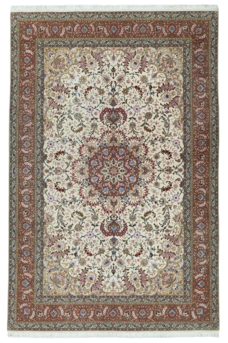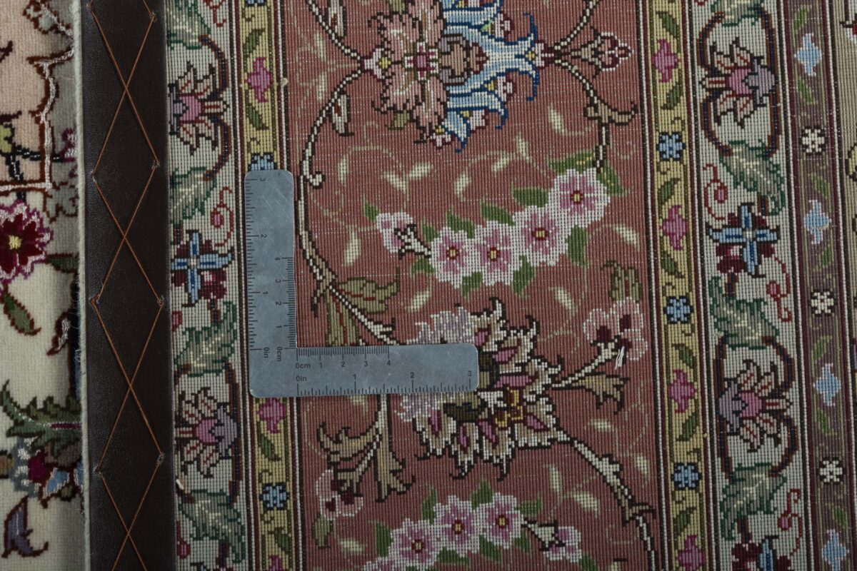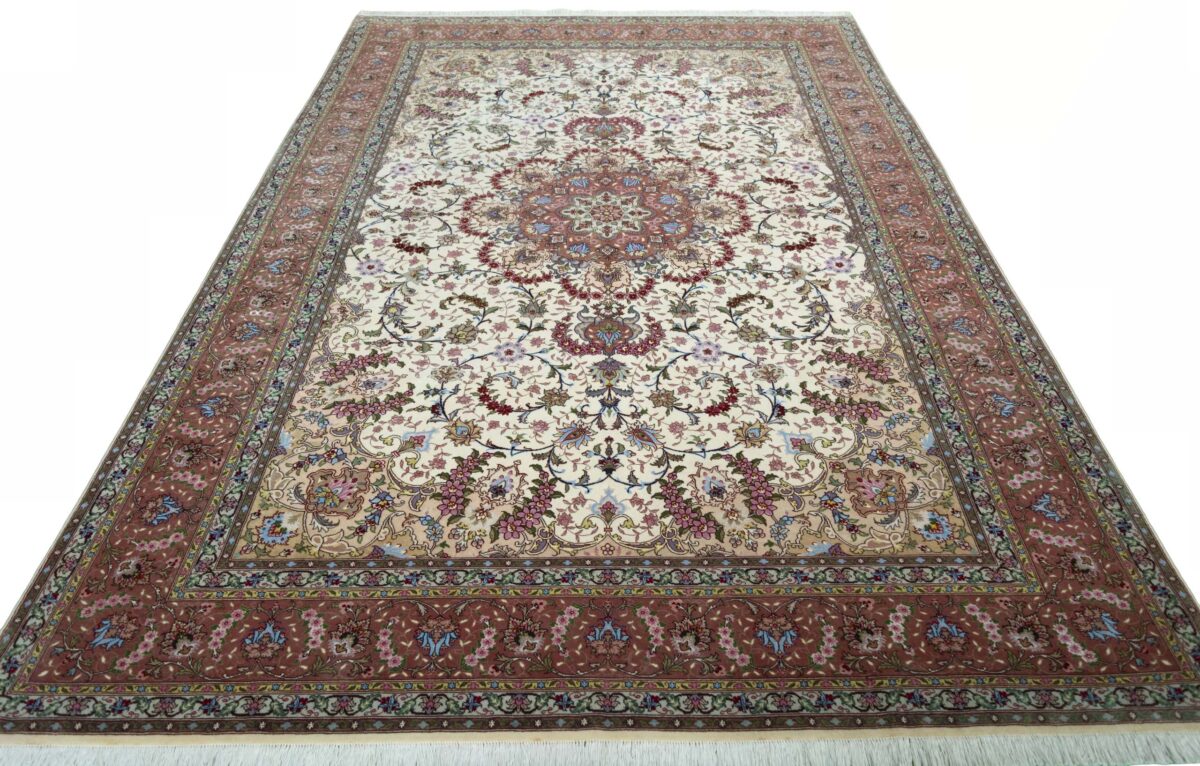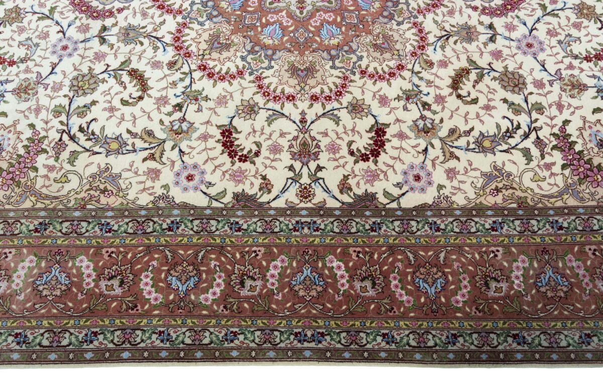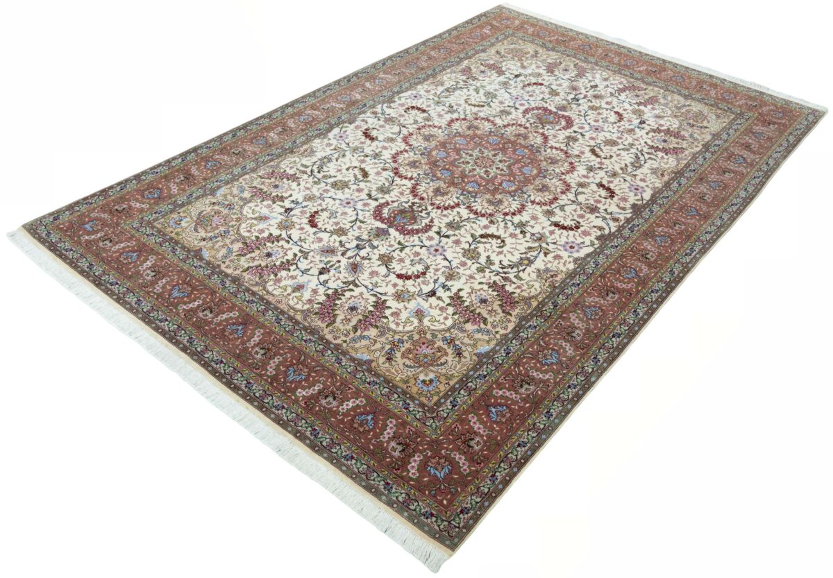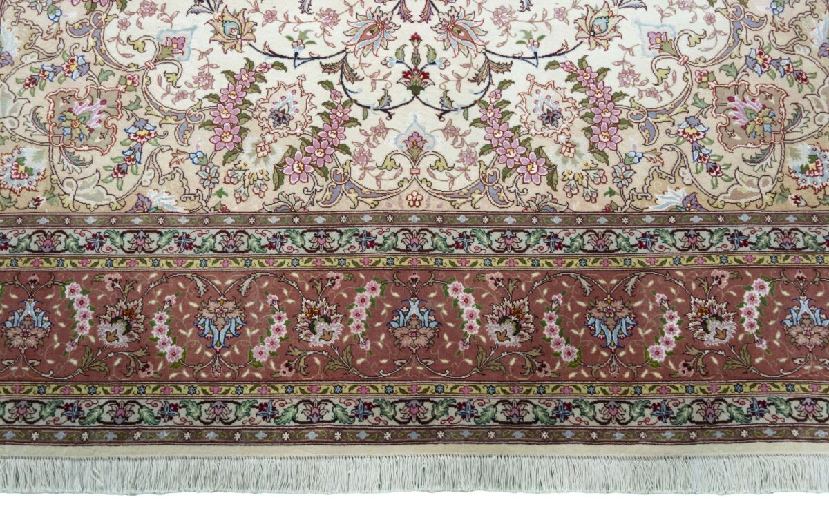 Für die besondere Eleganz des Täbriz-Flors sorgen hervorragende Materialien wie samtig anmutende Korkwolle und glänzende Seidenfäden. Die Knüpfqualität eines Täbriz-Teppichs lässt sich aus der angegebenen Raj-Zahl erschließen – je höher diese ausfällt, umso feiner ist die Knüpfdichte, die eine Million und mehr Knoten pro Quadratmeter erreichen kann. Bei besonders feingeknüpften Qualitäten kommt für die Kette statt des üblichen Baumwollgarns sogar Seide zum Einsatz.