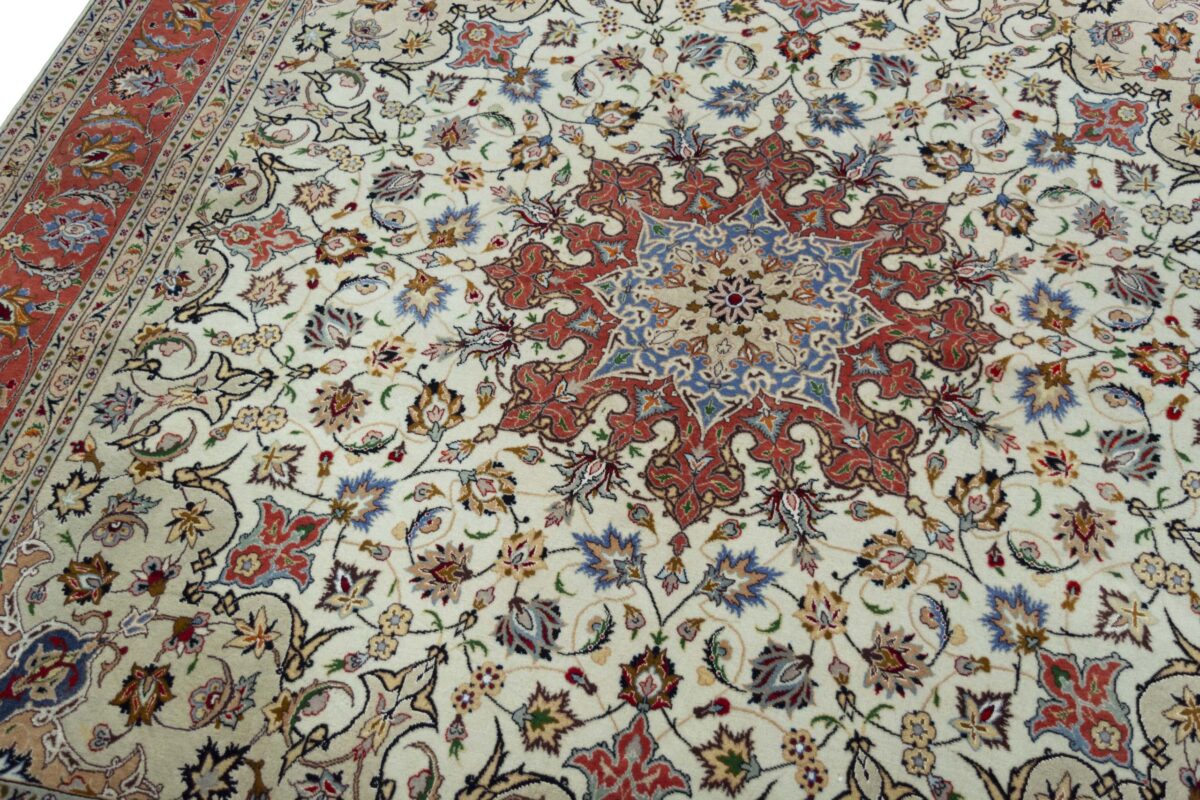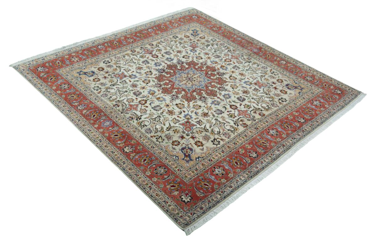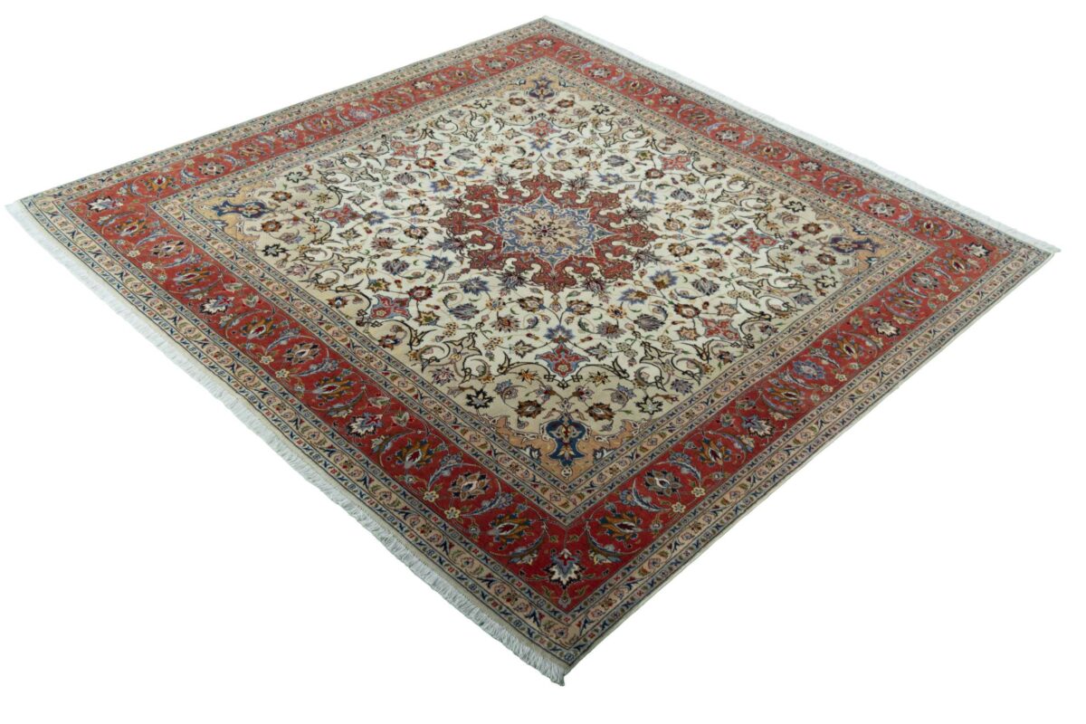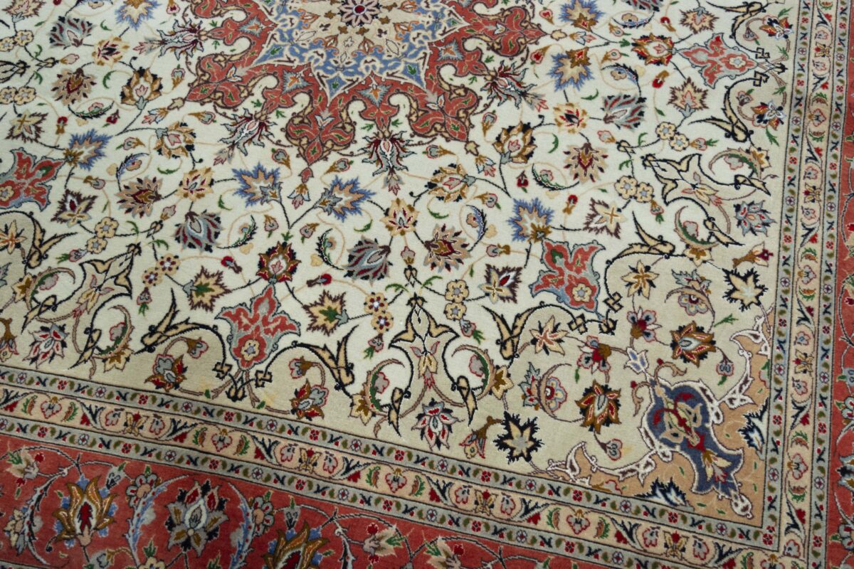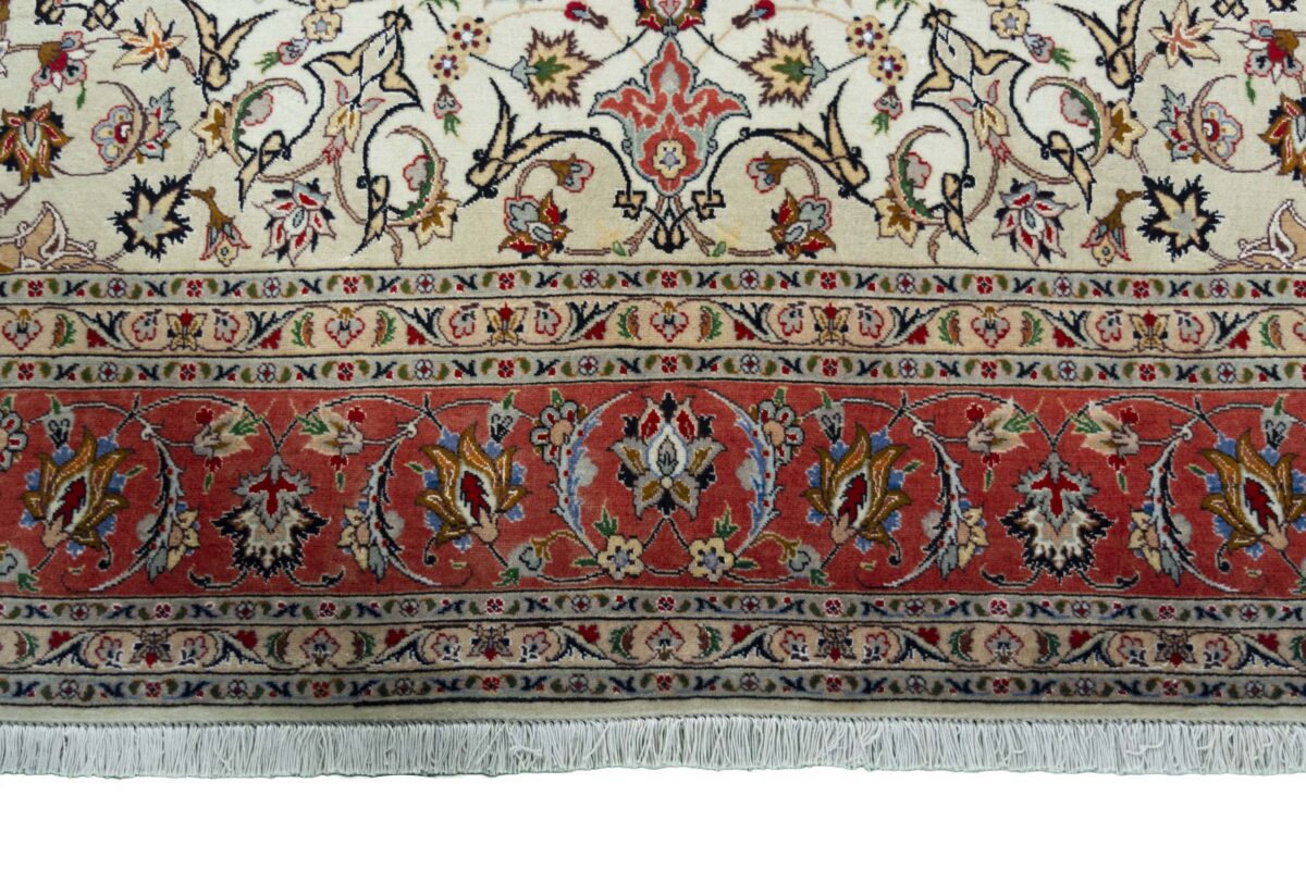 Für die besondere Eleganz des Täbriz-Flors sorgen hervorragende Materialien wie samtig anmutende Korkwolle und glänzende Seidenfäden. Die Knüpfqualität eines Täbriz-Teppichs lässt sich aus der angegebenen Raj-Zahl erschließen – je höher diese ausfällt, umso feiner ist die Knüpfdichte, die eine Million und mehr Knoten pro Quadratmeter erreichen kann. Bei besonders feingeknüpften Qualitäten kommt für die Kette statt des üblichen Baumwollgarns sogar Seide zum Einsatz.