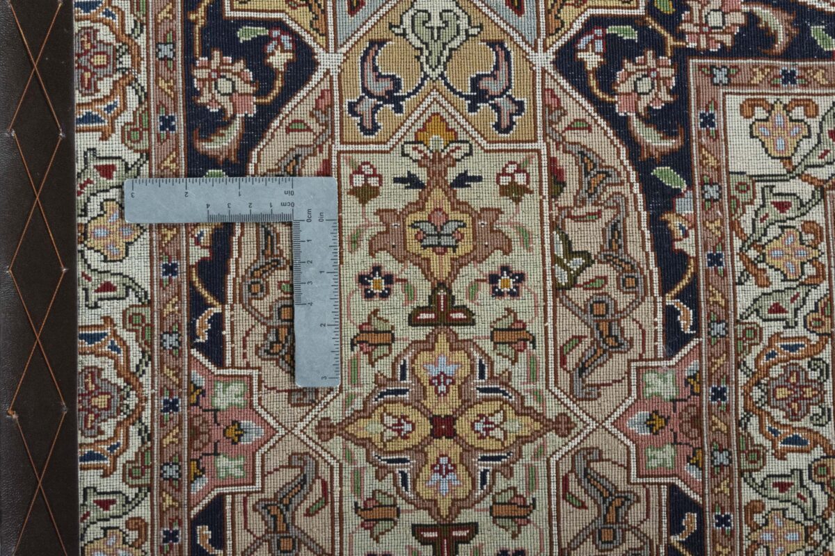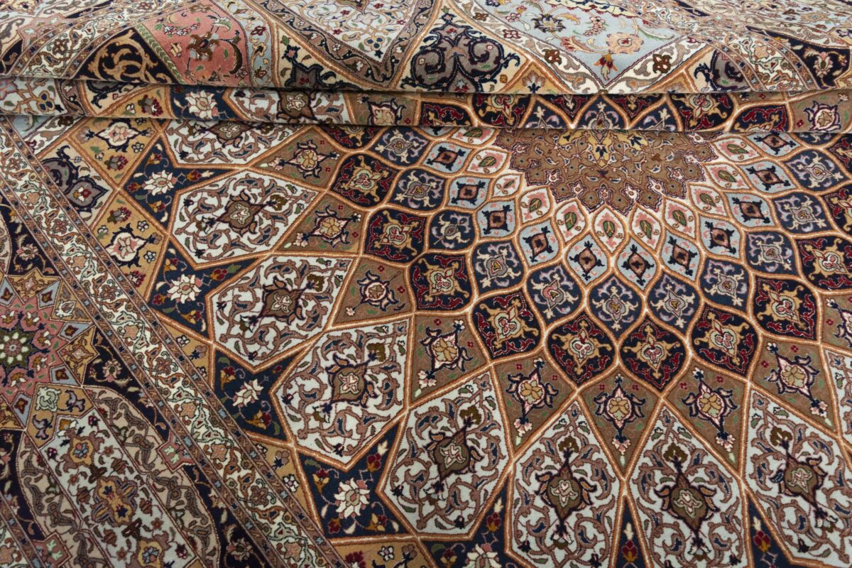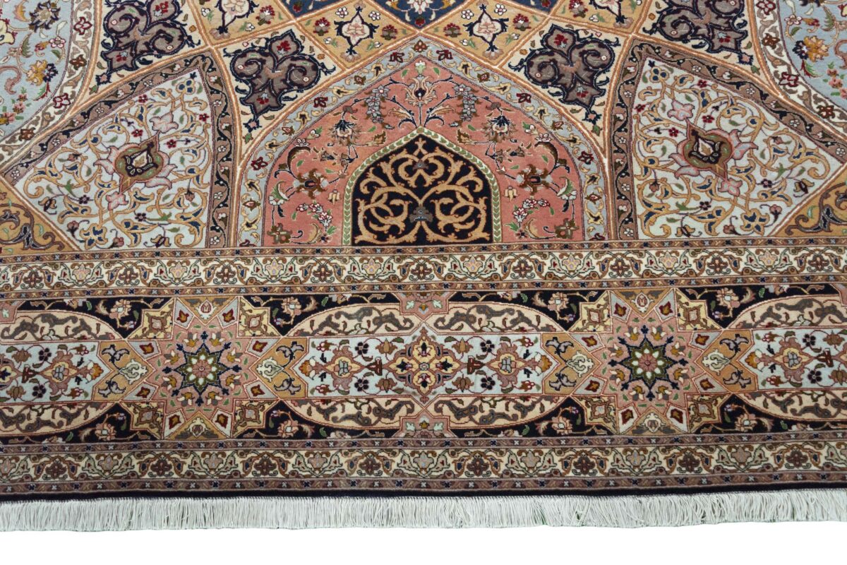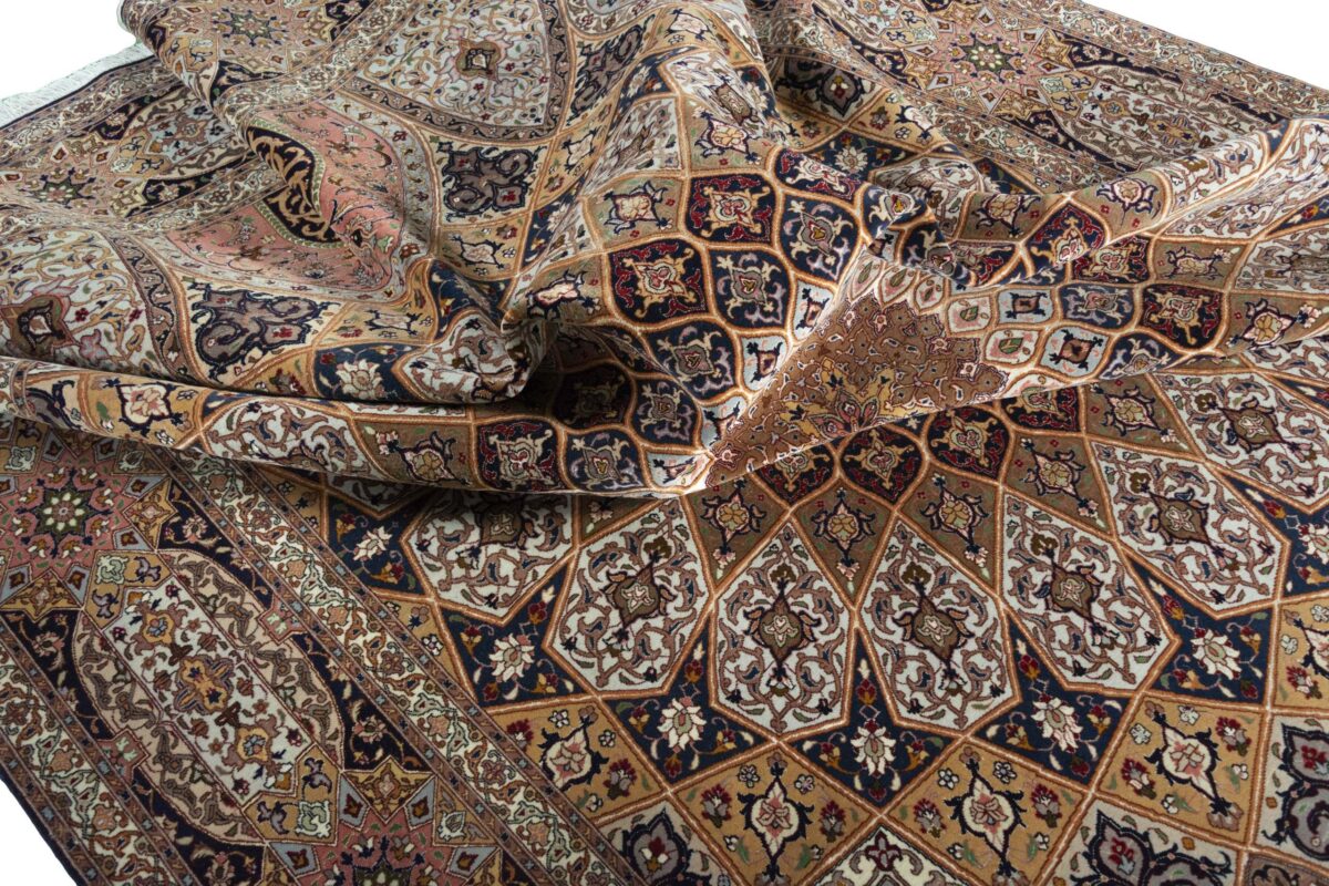 Für die besondere Eleganz des Täbriz-Flors sorgen hervorragende Materialien wie samtig anmutende Korkwolle und glänzende Seidenfäden. Die Knüpfqualität eines Täbriz-Teppichs lässt sich aus der angegebenen Raj-Zahl erschließen – je höher diese ausfällt, umso feiner ist die Knüpfdichte, die eine Million und mehr Knoten pro Quadratmeter erreichen kann. Bei besonders feingeknüpften Qualitäten kommt für die Kette statt des üblichen Baumwollgarns sogar Seide zum Einsatz.