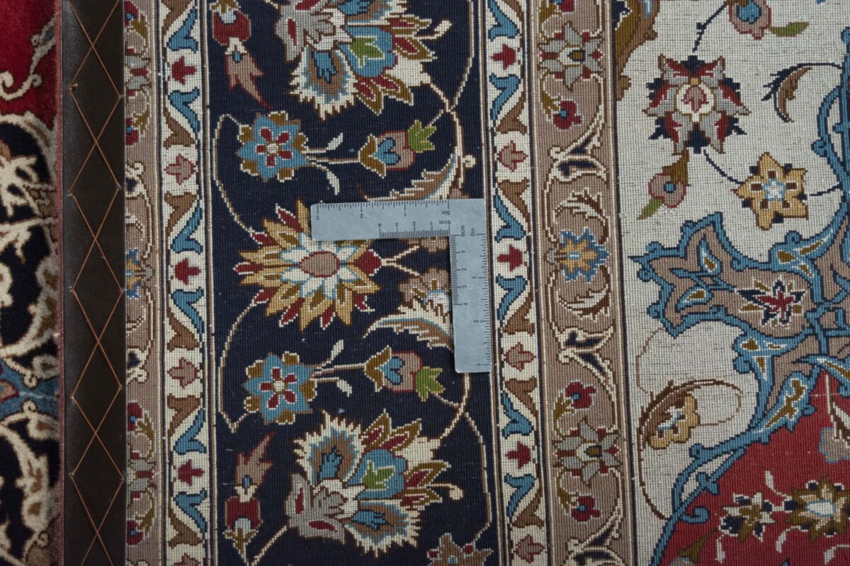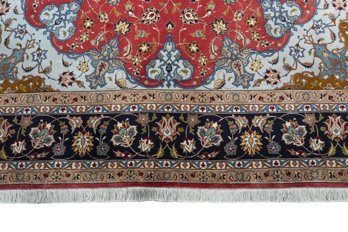 Für die besondere Eleganz des Täbriz-Flors sorgen hervorragende Materialien wie samtig anmutende Korkwolle und glänzende Seidenfäden. Die Knüpfqualität eines Täbriz-Teppichs lässt sich aus der angegebenen Raj-Zahl erschließen – je höher diese ausfällt, umso feiner ist die Knüpfdichte, die eine Million und mehr Knoten pro Quadratmeter erreichen kann. Bei besonders feingeknüpften Qualitäten kommt für die Kette statt des üblichen Baumwollgarns sogar Seide zum Einsatz.