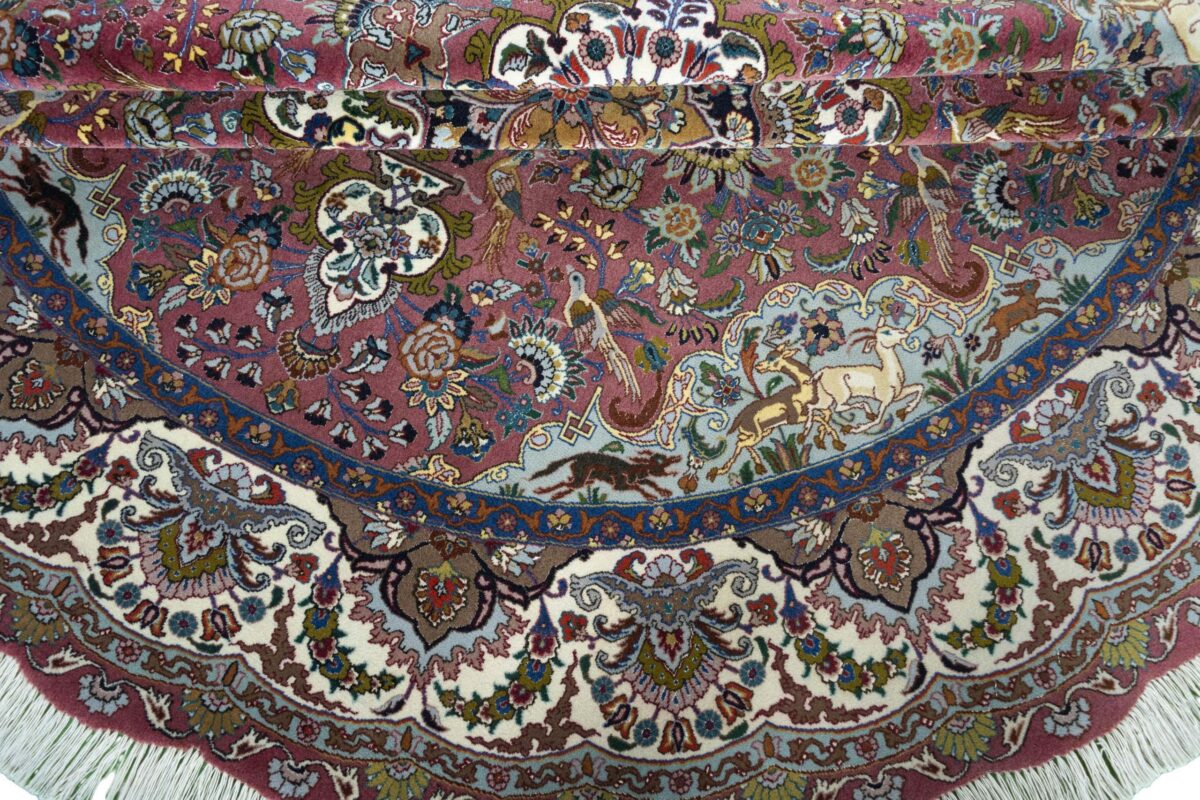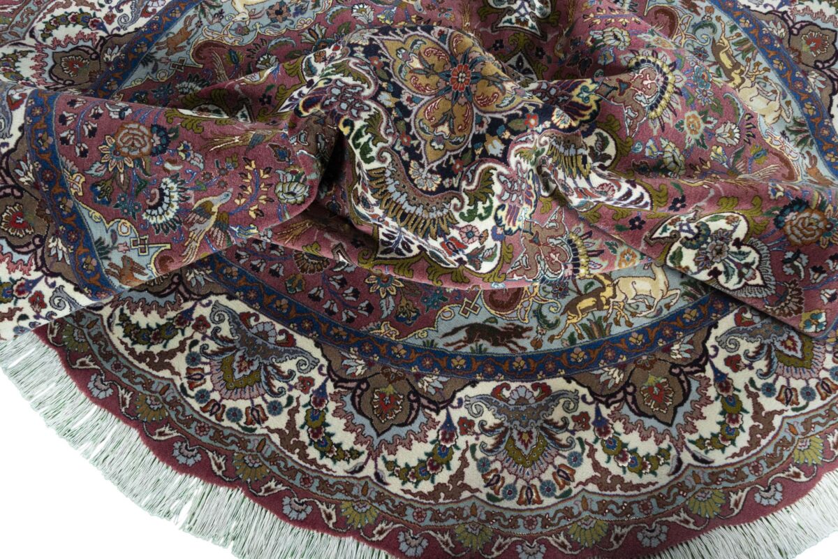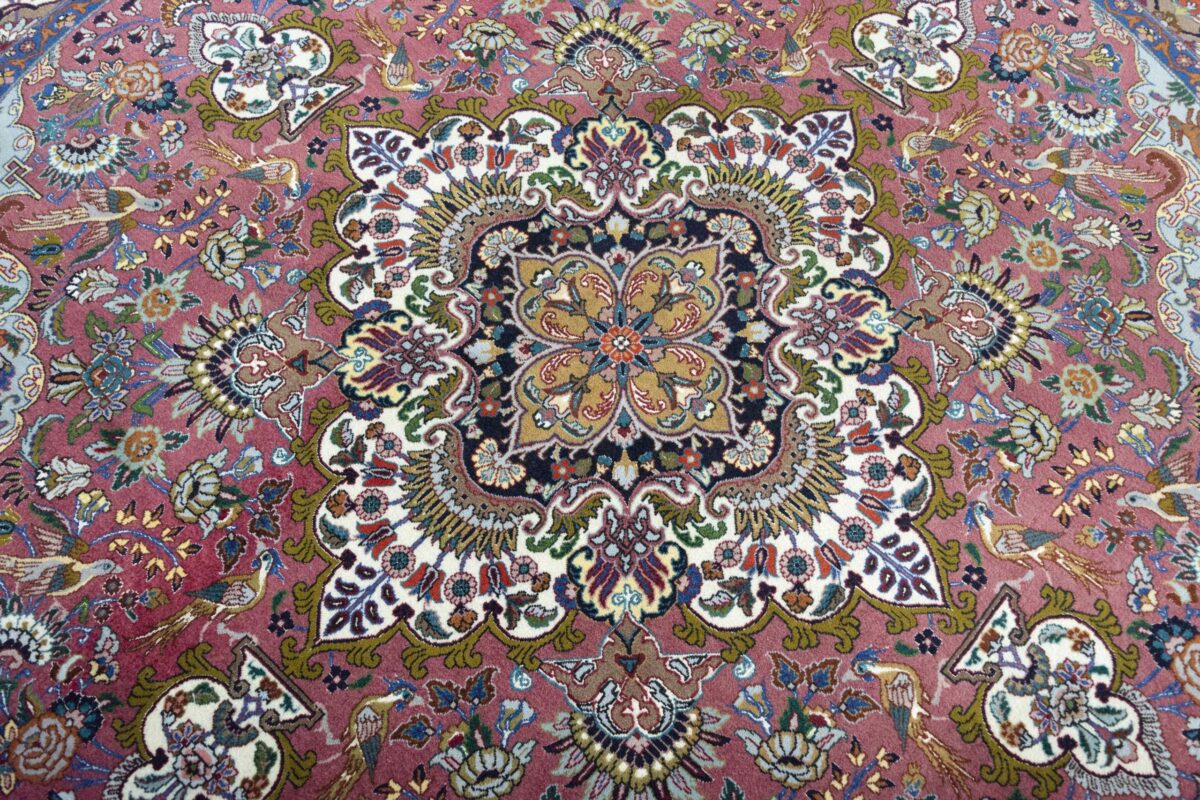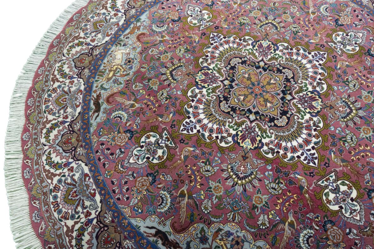 Für die besondere Eleganz des Täbriz-Flors sorgen hervorragende Materialien wie samtig anmutende Korkwolle und glänzende Seidenfäden. Die Knüpfqualität eines Täbriz-Teppichs lässt sich aus der angegebenen Raj-Zahl erschließen – je höher diese ausfällt, umso feiner ist die Knüpfdichte, die eine Million und mehr Knoten pro Quadratmeter erreichen kann. Bei besonders feingeknüpften Qualitäten kommt für die Kette statt des üblichen Baumwollgarns sogar Seide zum Einsatz.