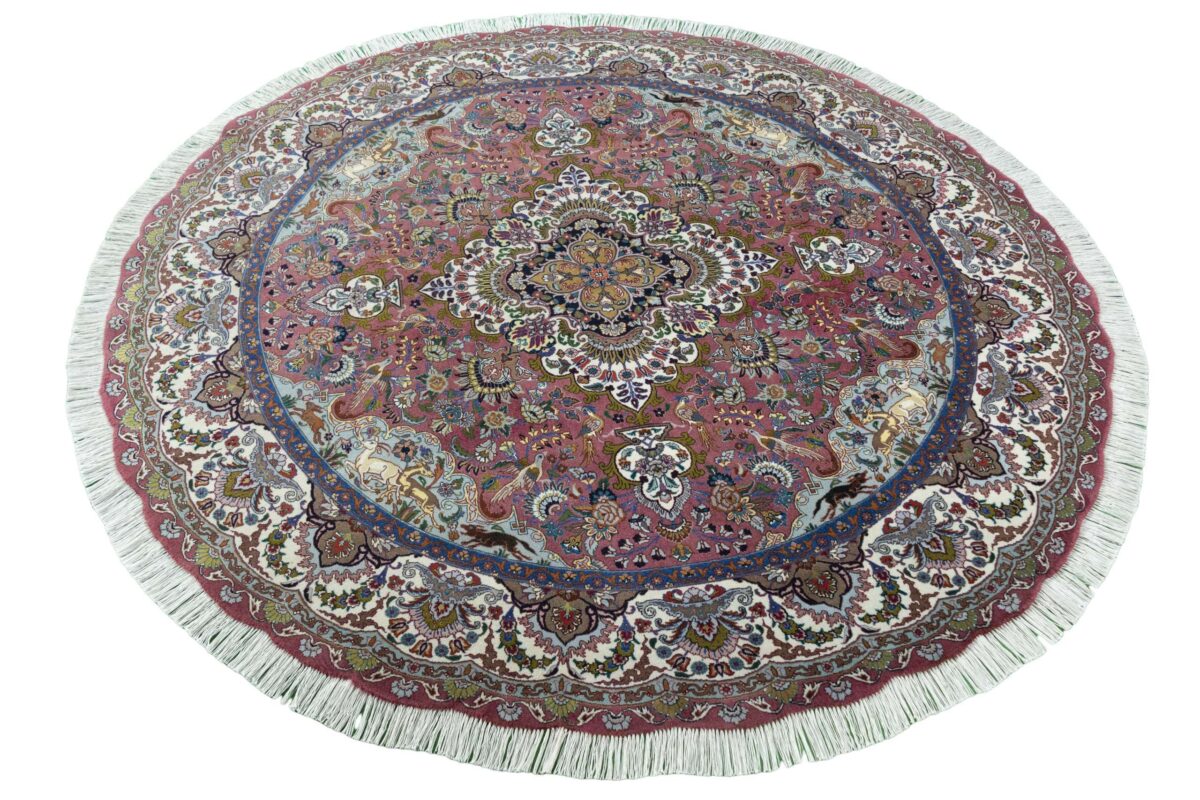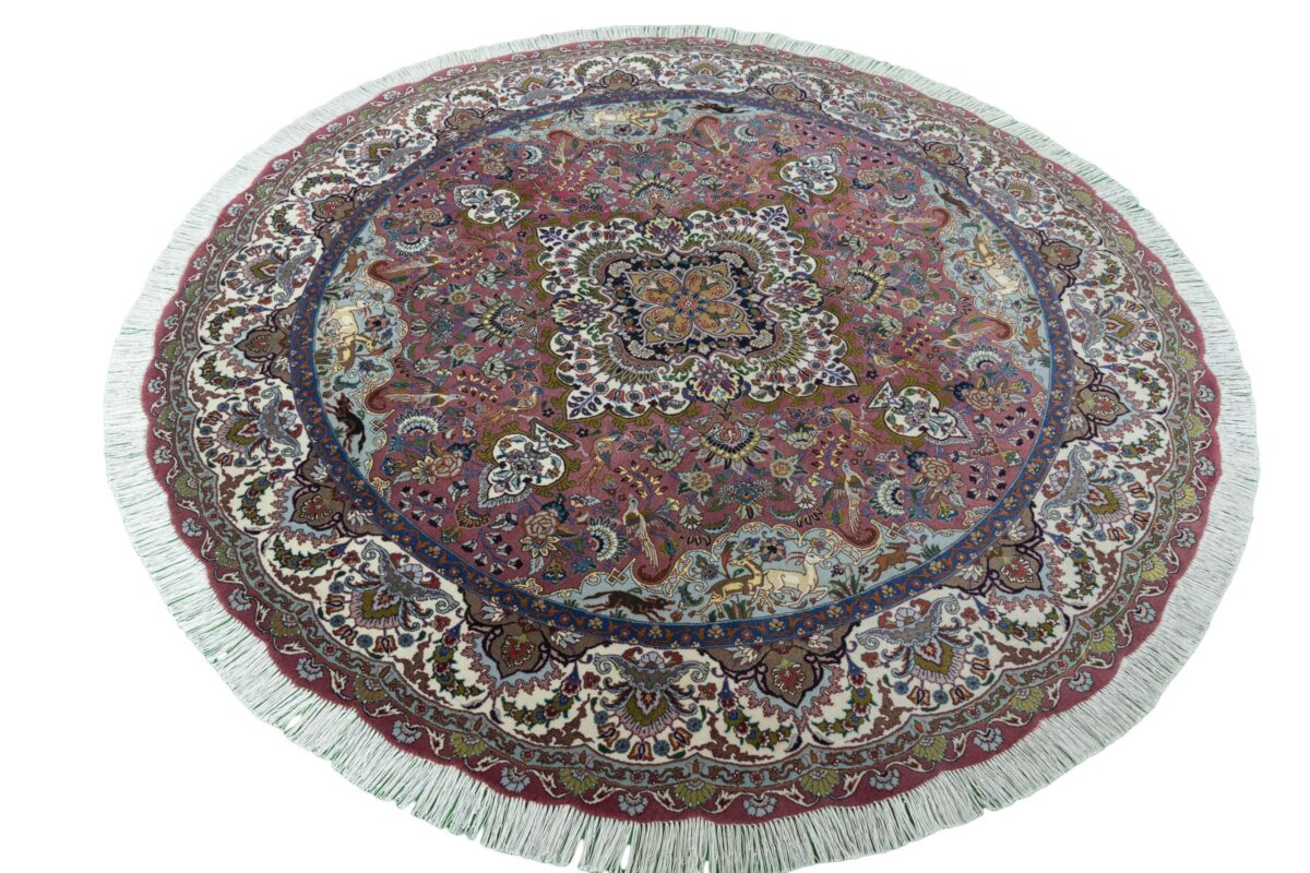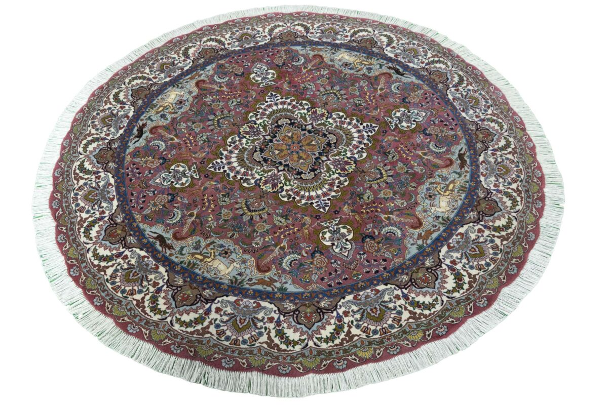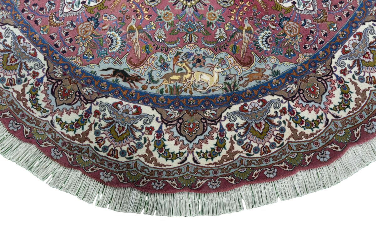 Für die besondere Eleganz des Täbriz-Flors sorgen hervorragende Materialien wie samtig anmutende Korkwolle und glänzende Seidenfäden. Die Knüpfqualität eines Täbriz-Teppichs lässt sich aus der angegebenen Raj-Zahl erschließen – je höher diese ausfällt, umso feiner ist die Knüpfdichte, die eine Million und mehr Knoten pro Quadratmeter erreichen kann. Bei besonders feingeknüpften Qualitäten kommt für die Kette statt des üblichen Baumwollgarns sogar Seide zum Einsatz.