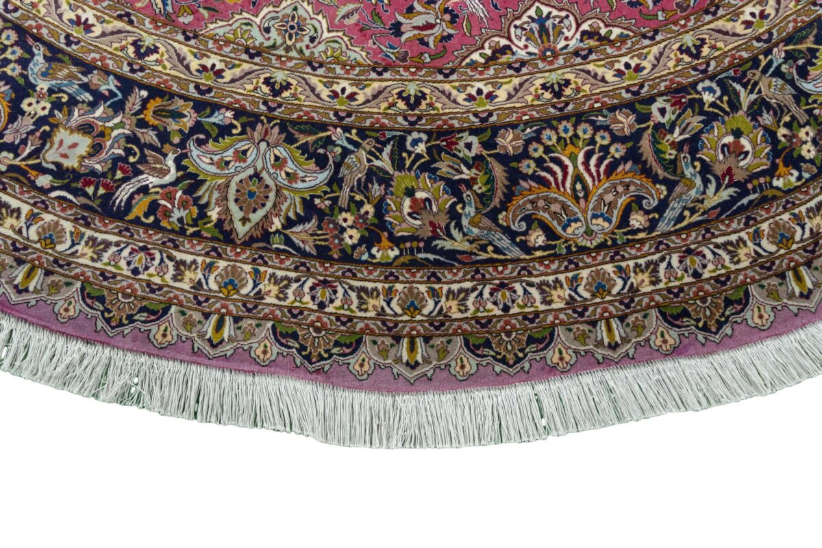 Für die besondere Eleganz des Täbriz-Flors sorgen hervorragende Materialien wie samtig anmutende Korkwolle und glänzende Seidenfäden. Die Knüpfqualität eines Täbriz-Teppichs lässt sich aus der angegebenen Raj-Zahl erschließen – je höher diese ausfällt, umso feiner ist die Knüpfdichte, die eine Million und mehr Knoten pro Quadratmeter erreichen kann. Bei besonders feingeknüpften Qualitäten kommt für die Kette statt des üblichen Baumwollgarns sogar Seide zum Einsatz.