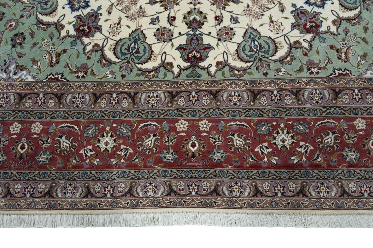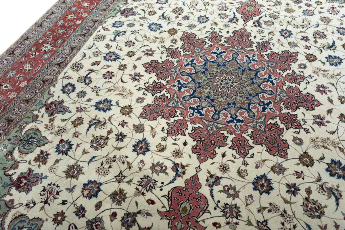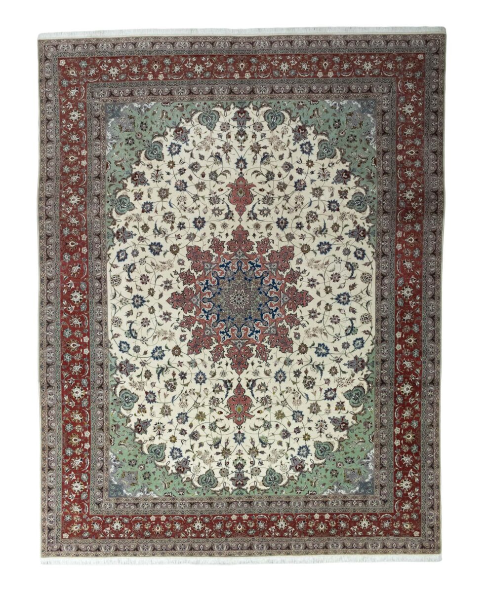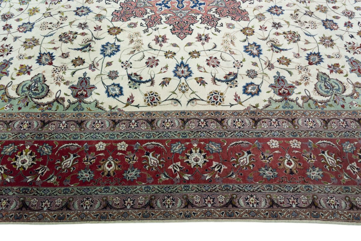 Für die besondere Eleganz des Täbriz-Flors sorgen hervorragende Materialien wie samtig anmutende Korkwolle und glänzende Seidenfäden. Die Knüpfqualität eines Täbriz-Teppichs lässt sich aus der angegebenen Raj-Zahl erschließen – je höher diese ausfällt, umso feiner ist die Knüpfdichte, die eine Million und mehr Knoten pro Quadratmeter erreichen kann. Bei besonders feingeknüpften Qualitäten kommt für die Kette statt des üblichen Baumwollgarns sogar Seide zum Einsatz.