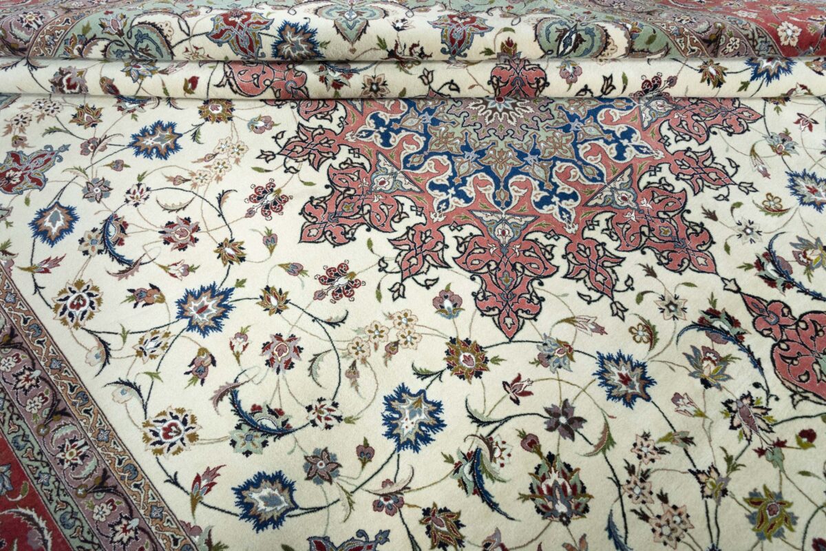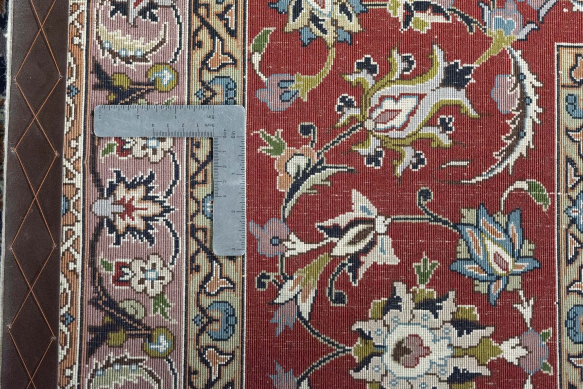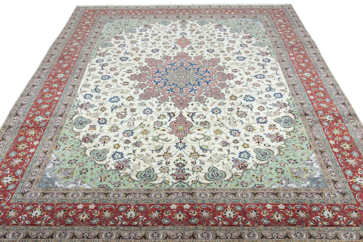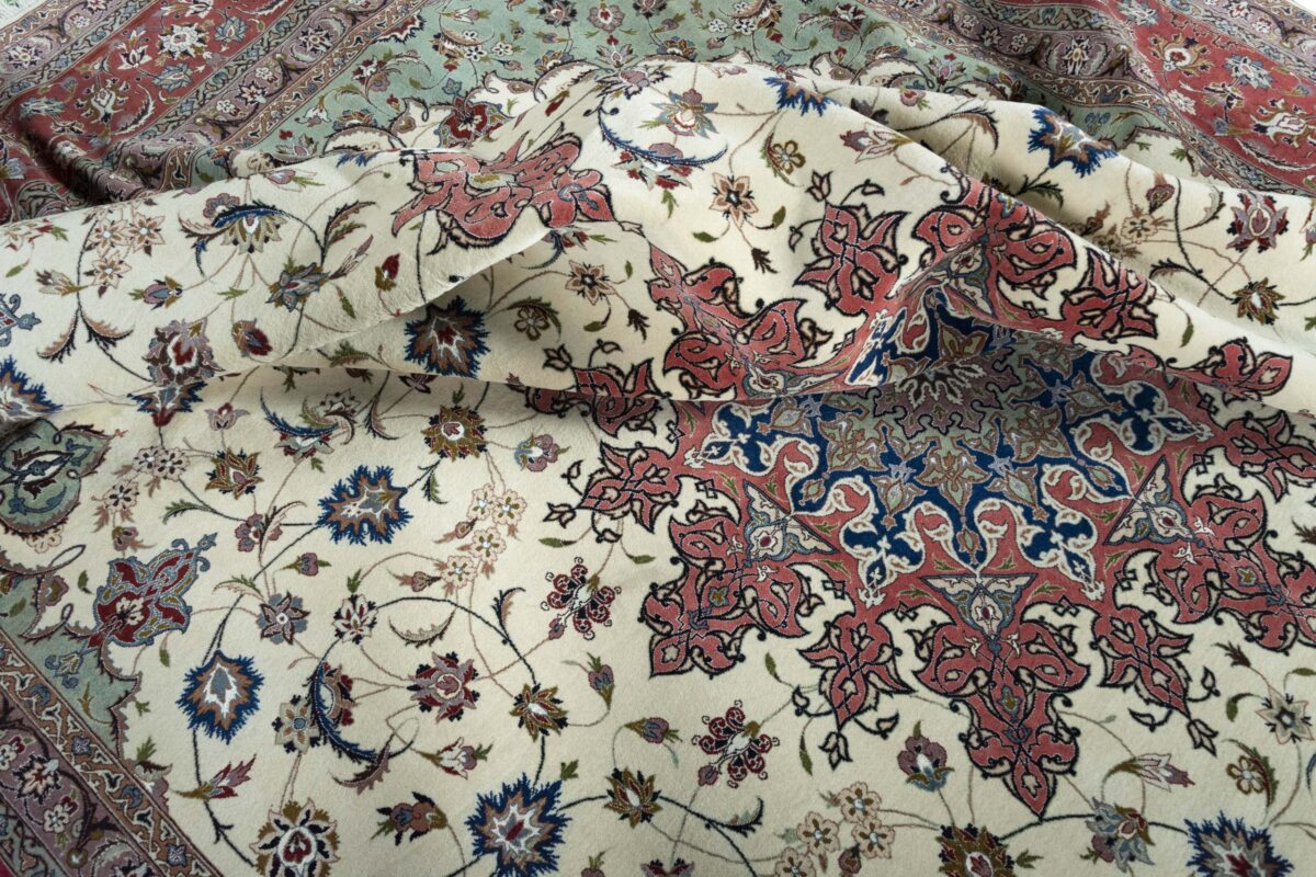 Für die besondere Eleganz des Täbriz-Flors sorgen hervorragende Materialien wie samtig anmutende Korkwolle und glänzende Seidenfäden. Die Knüpfqualität eines Täbriz-Teppichs lässt sich aus der angegebenen Raj-Zahl erschließen – je höher diese ausfällt, umso feiner ist die Knüpfdichte, die eine Million und mehr Knoten pro Quadratmeter erreichen kann. Bei besonders feingeknüpften Qualitäten kommt für die Kette statt des üblichen Baumwollgarns sogar Seide zum Einsatz.