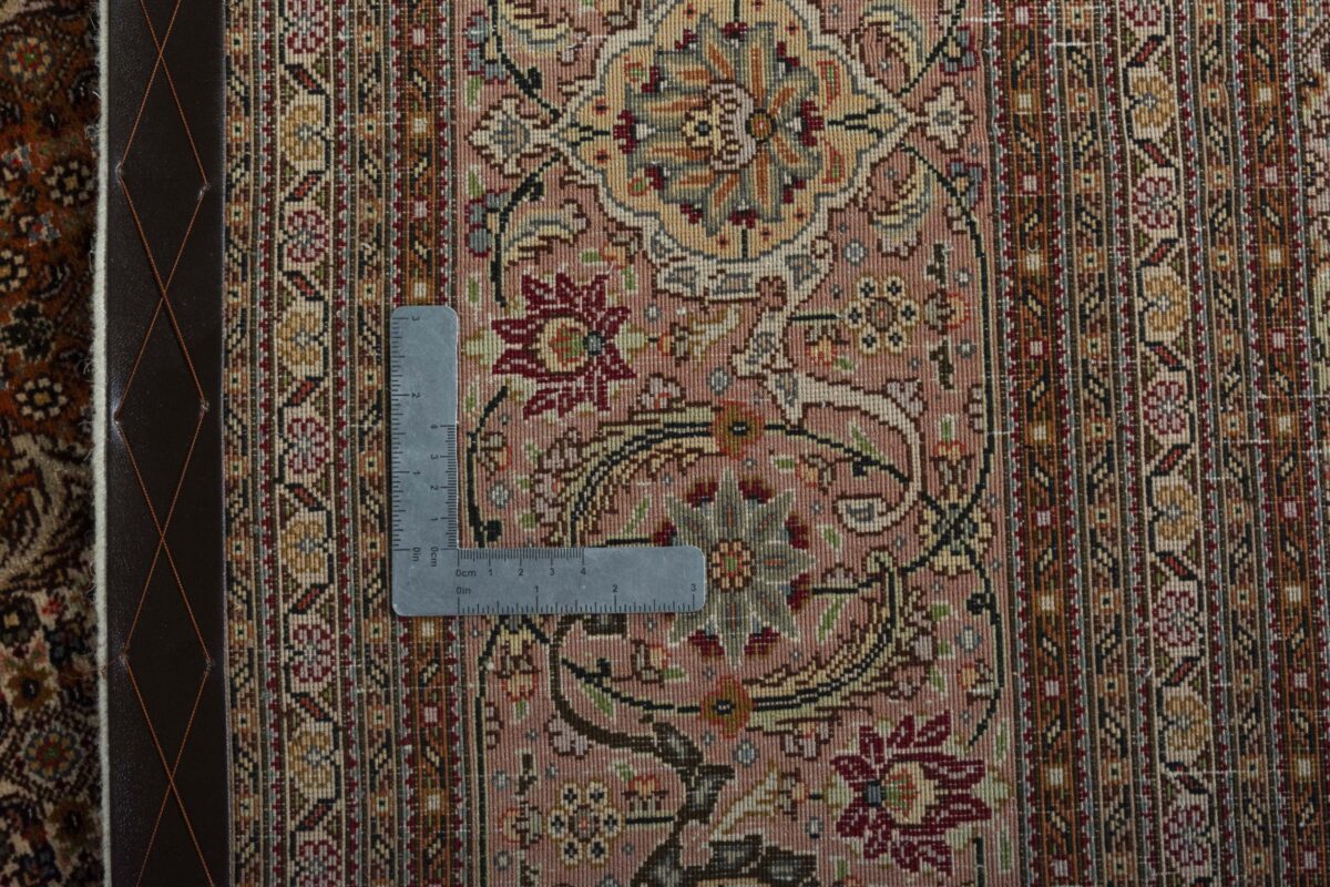 Für die besondere Eleganz des Täbriz-Flors sorgen hervorragende Materialien wie samtig anmutende Korkwolle und glänzende Seidenfäden. Die Knüpfqualität eines Täbriz-Teppichs lässt sich aus der angegebenen Raj-Zahl erschließen – je höher diese ausfällt, umso feiner ist die Knüpfdichte, die eine Million und mehr Knoten pro Quadratmeter erreichen kann. Bei besonders feingeknüpften Qualitäten kommt für die Kette statt des üblichen Baumwollgarns sogar Seide zum Einsatz.
