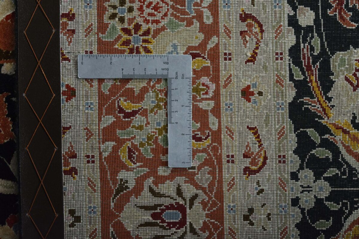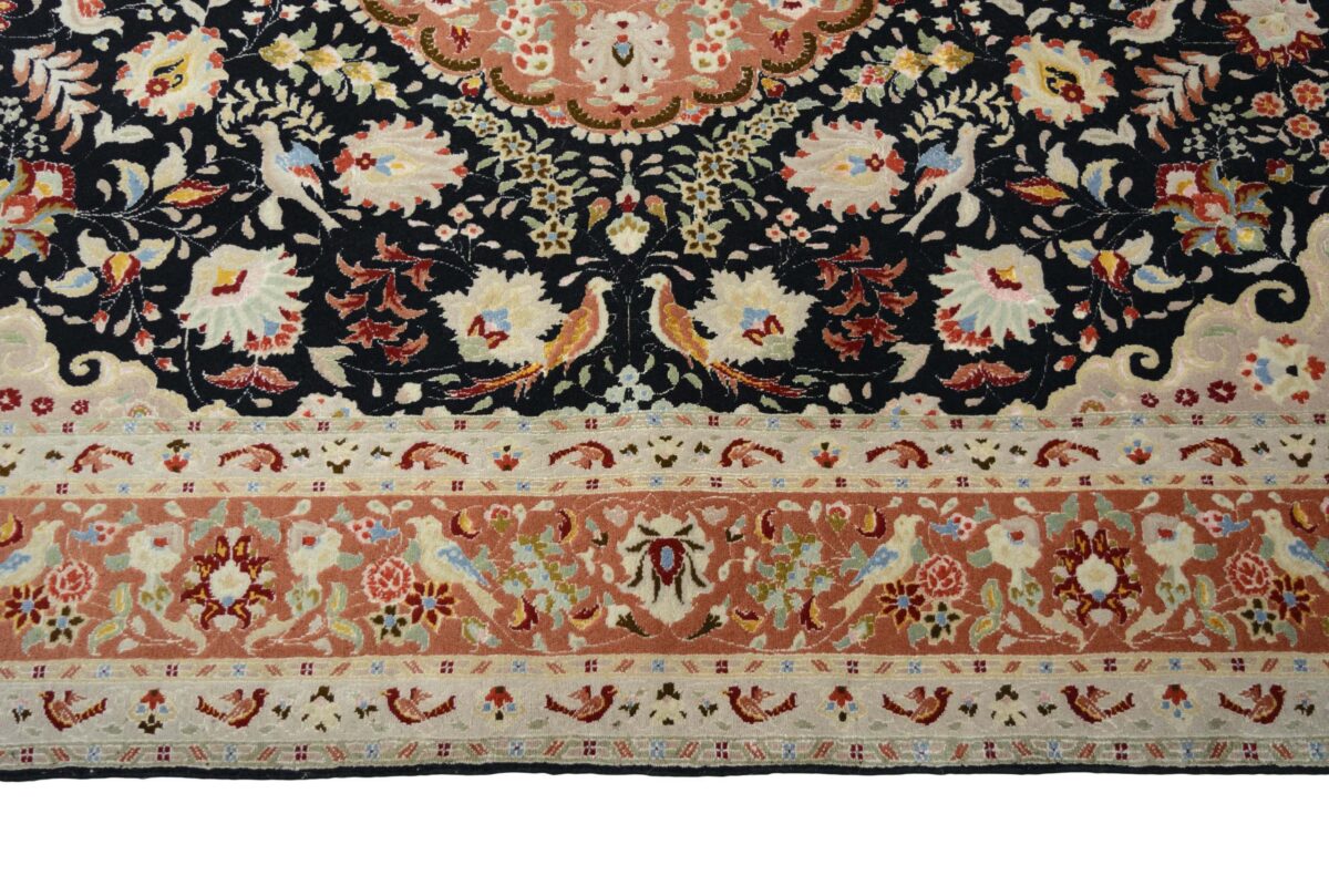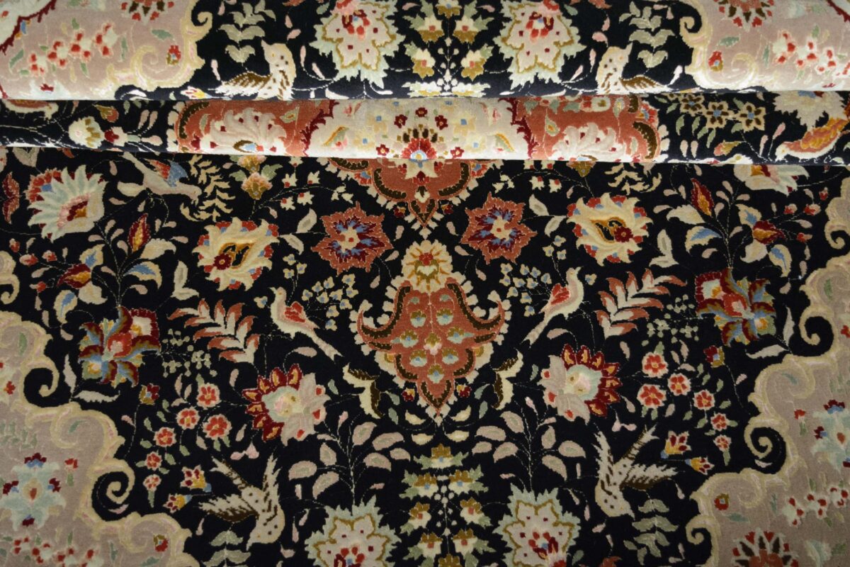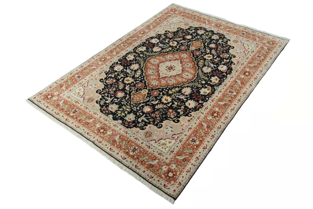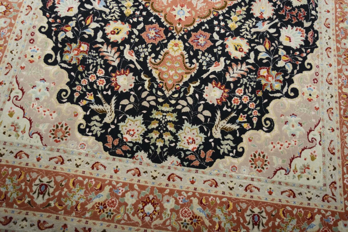 Für die besondere Eleganz des Täbriz-Flors sorgen hervorragende Materialien wie samtig anmutende Korkwolle und glänzende Seidenfäden. Die Knüpfqualität eines Täbriz-Teppichs lässt sich aus der angegebenen Raj-Zahl erschließen – je höher diese ausfällt, umso feiner ist die Knüpfdichte, die eine Million und mehr Knoten pro Quadratmeter erreichen kann. Bei besonders feingeknüpften Qualitäten kommt für die Kette statt des üblichen Baumwollgarns sogar Seide zum Einsatz.
