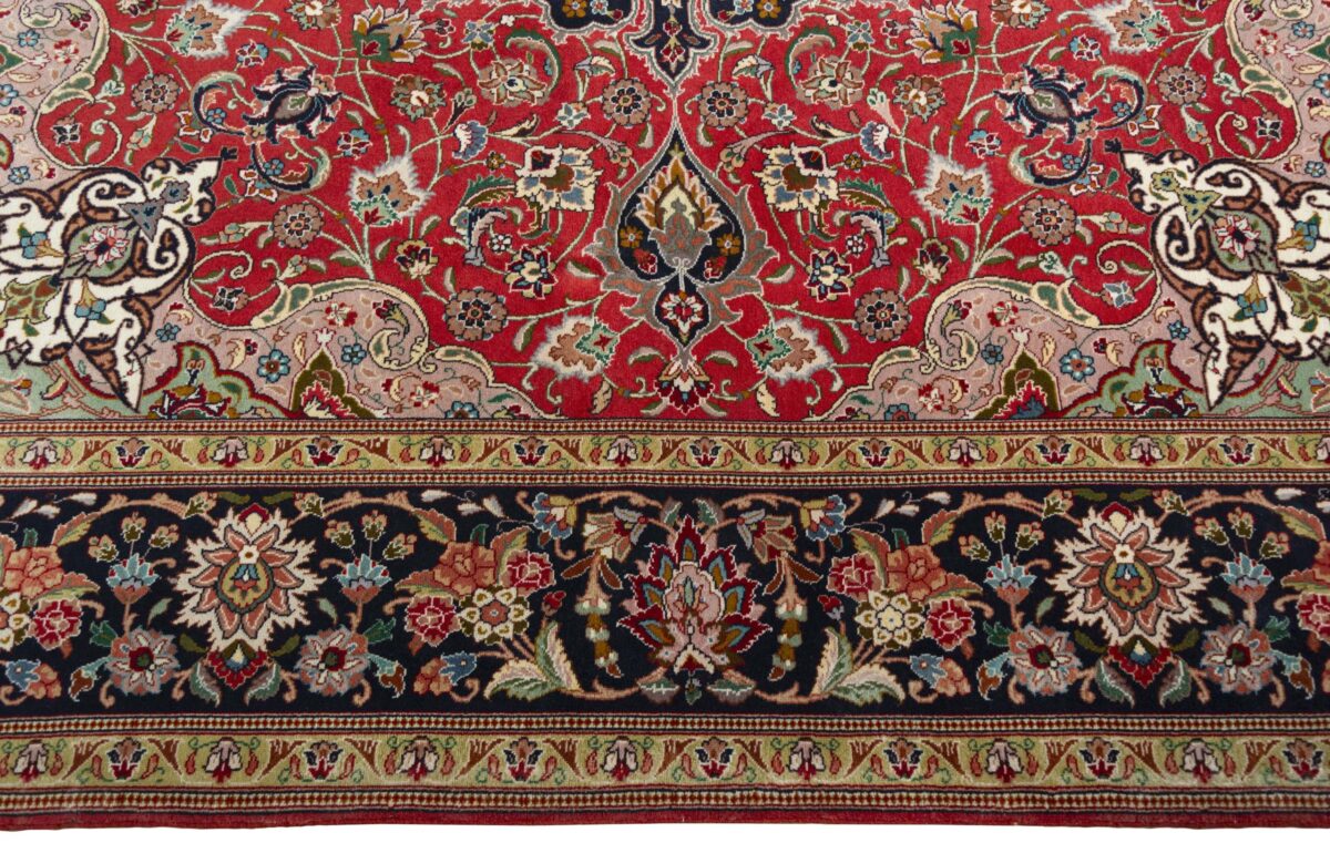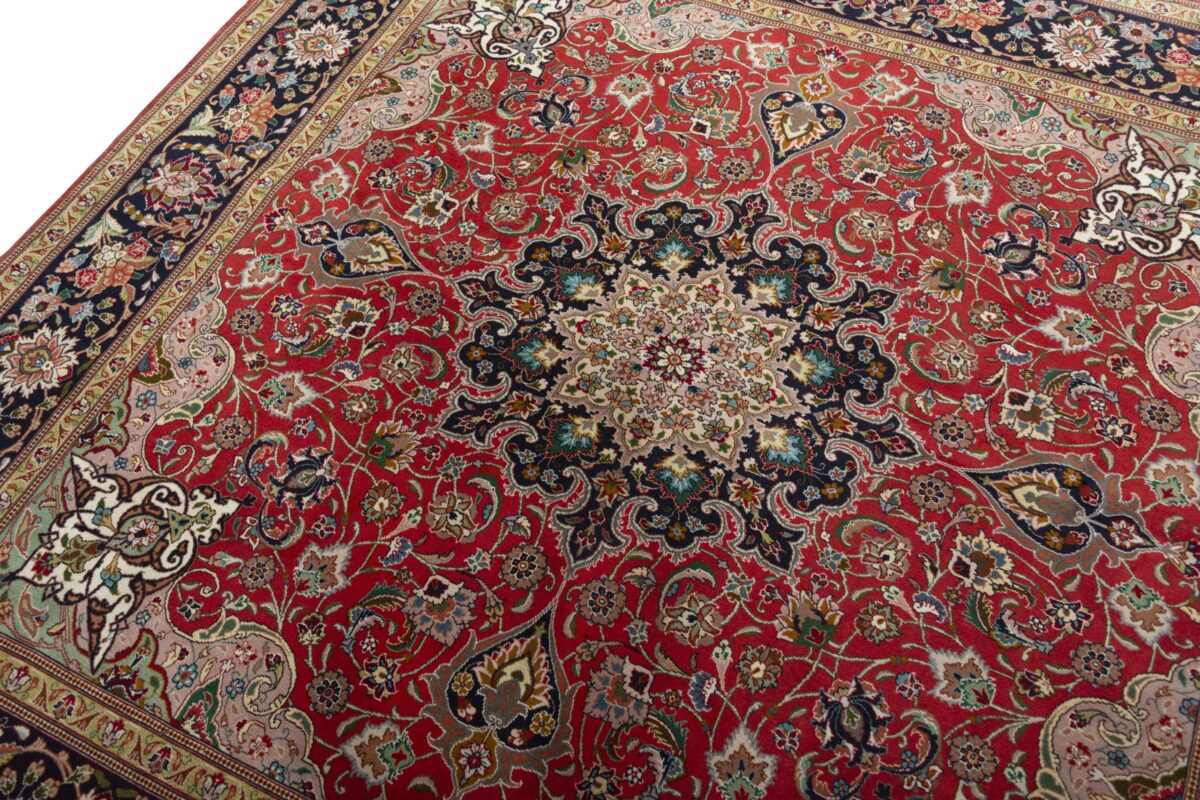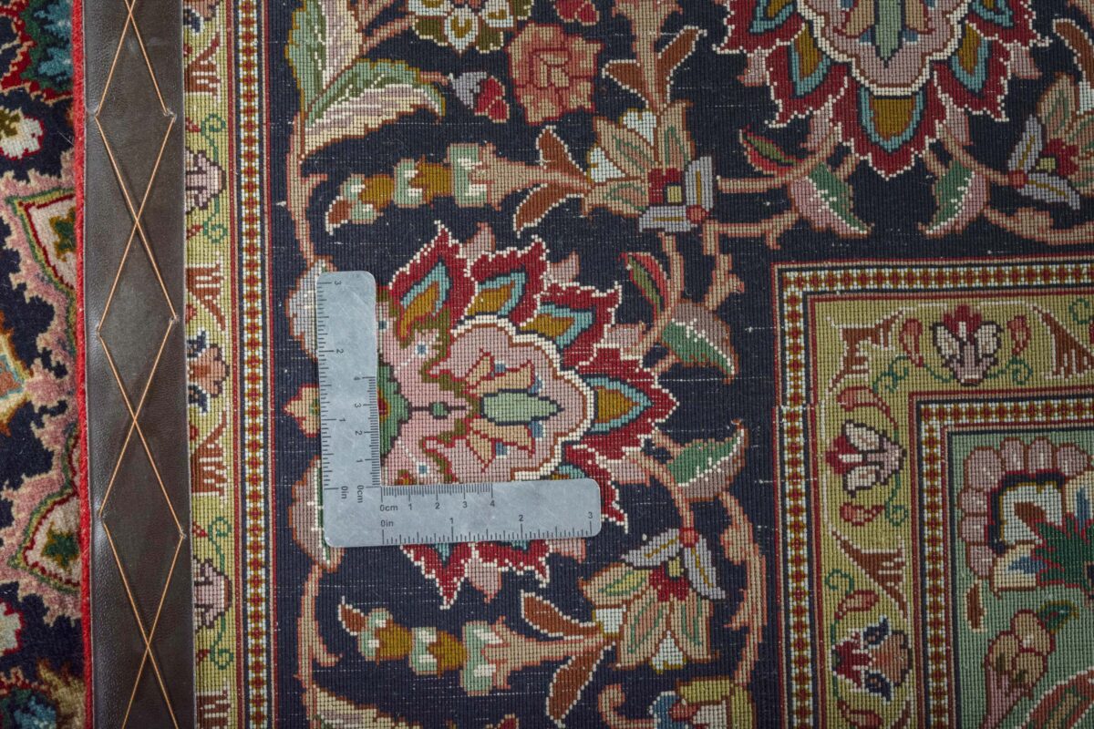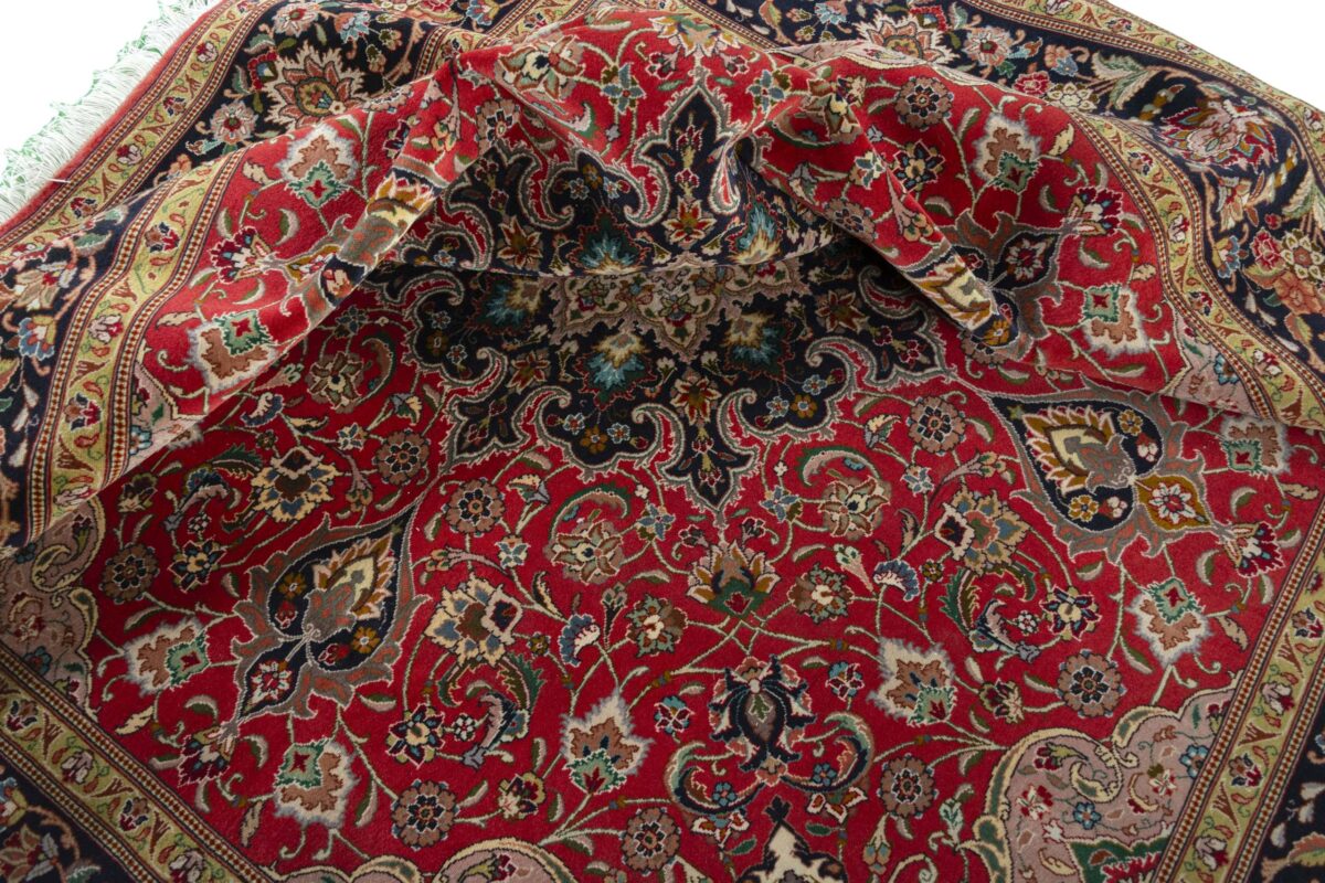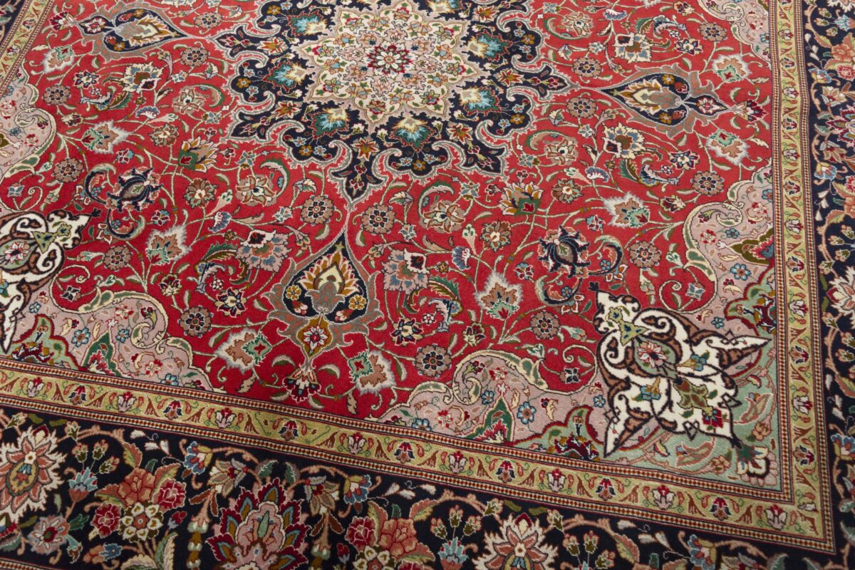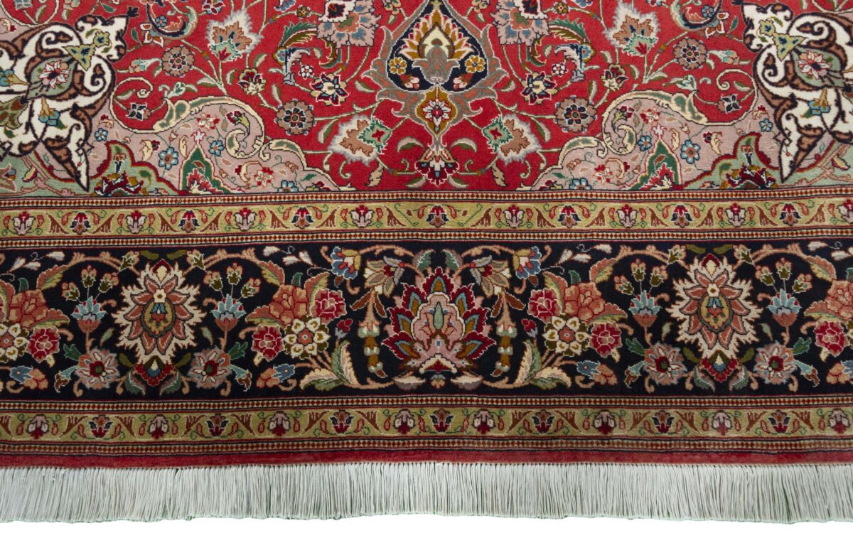 Für die besondere Eleganz des Täbriz-Flors sorgen hervorragende Materialien wie samtig anmutende Korkwolle und glänzende Seidenfäden. Die Knüpfqualität eines Täbriz-Teppichs lässt sich aus der angegebenen Raj-Zahl erschließen – je höher diese ausfällt, umso feiner ist die Knüpfdichte, die eine Million und mehr Knoten pro Quadratmeter erreichen kann. Bei besonders feingeknüpften Qualitäten kommt für die Kette statt des üblichen Baumwollgarns sogar Seide zum Einsatz.