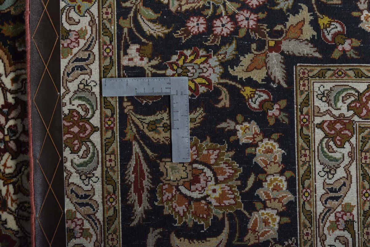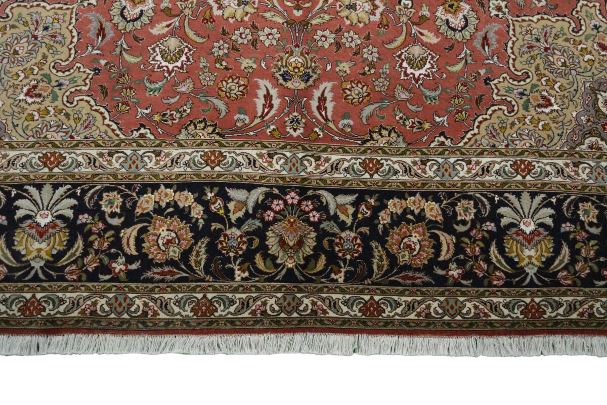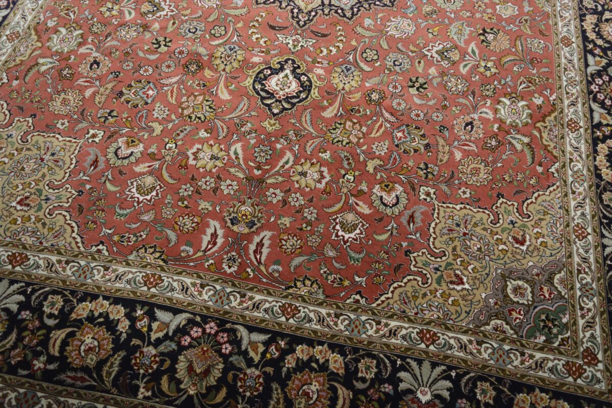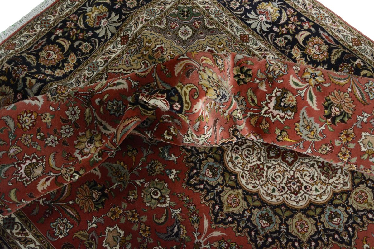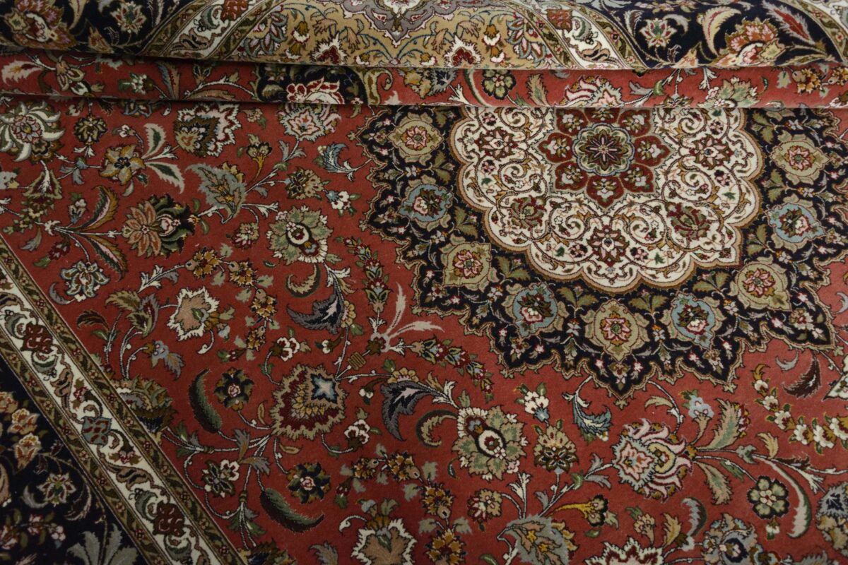 Für die besondere Eleganz des Täbriz-Flors sorgen hervorragende Materialien wie samtig anmutende Korkwolle und glänzende Seidenfäden. Die Knüpfqualität eines Täbriz-Teppichs lässt sich aus der angegebenen Raj-Zahl erschließen – je höher diese ausfällt, umso feiner ist die Knüpfdichte, die eine Million und mehr Knoten pro Quadratmeter erreichen kann. Bei besonders feingeknüpften Qualitäten kommt für die Kette statt des üblichen Baumwollgarns sogar Seide zum Einsatz.
