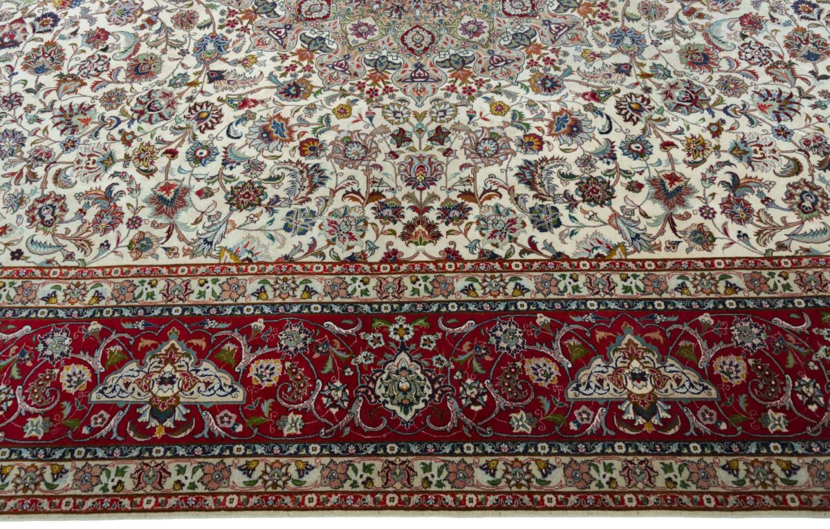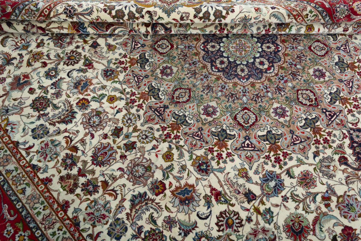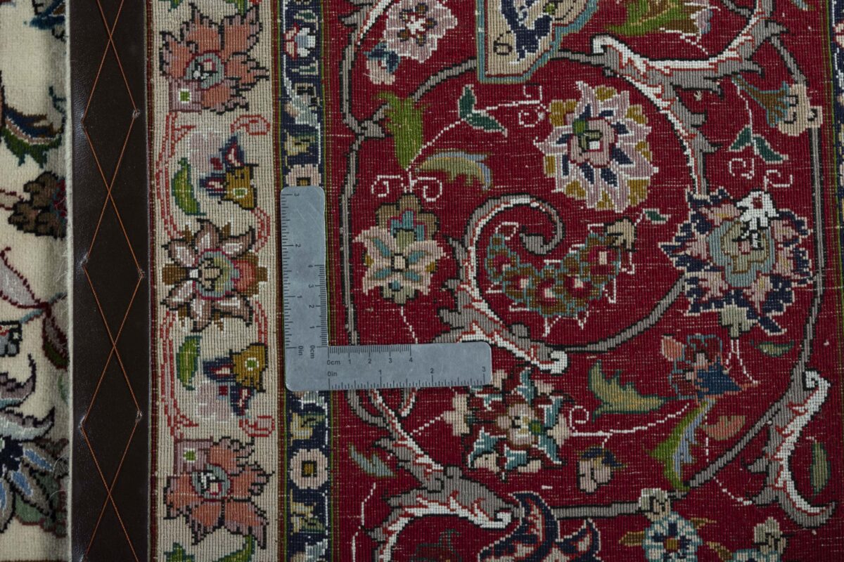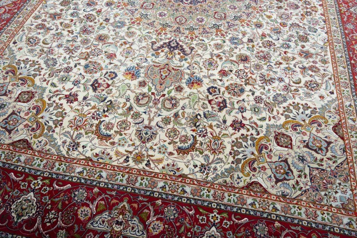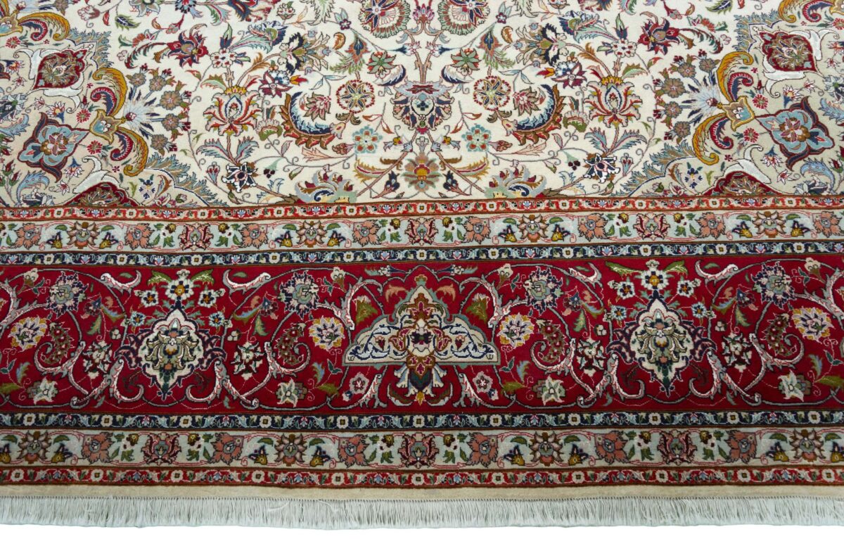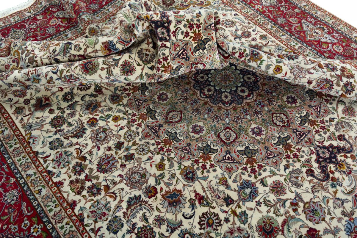 Für die besondere Eleganz des Täbriz-Flors sorgen hervorragende Materialien wie samtig anmutende Korkwolle und glänzende Seidenfäden. Die Knüpfqualität eines Täbriz-Teppichs lässt sich aus der angegebenen Raj-Zahl erschließen – je höher diese ausfällt, umso feiner ist die Knüpfdichte, die eine Million und mehr Knoten pro Quadratmeter erreichen kann. Bei besonders feingeknüpften Qualitäten kommt für die Kette statt des üblichen Baumwollgarns sogar Seide zum Einsatz.