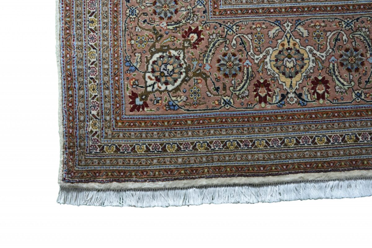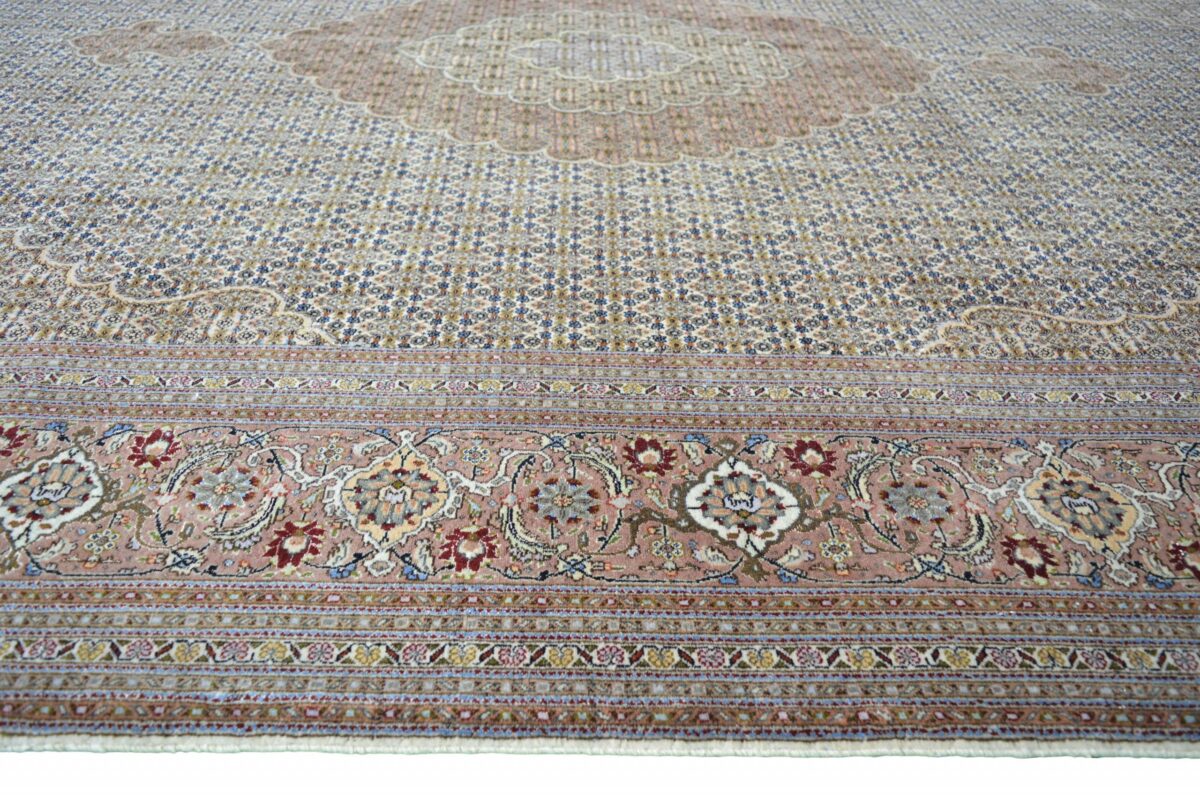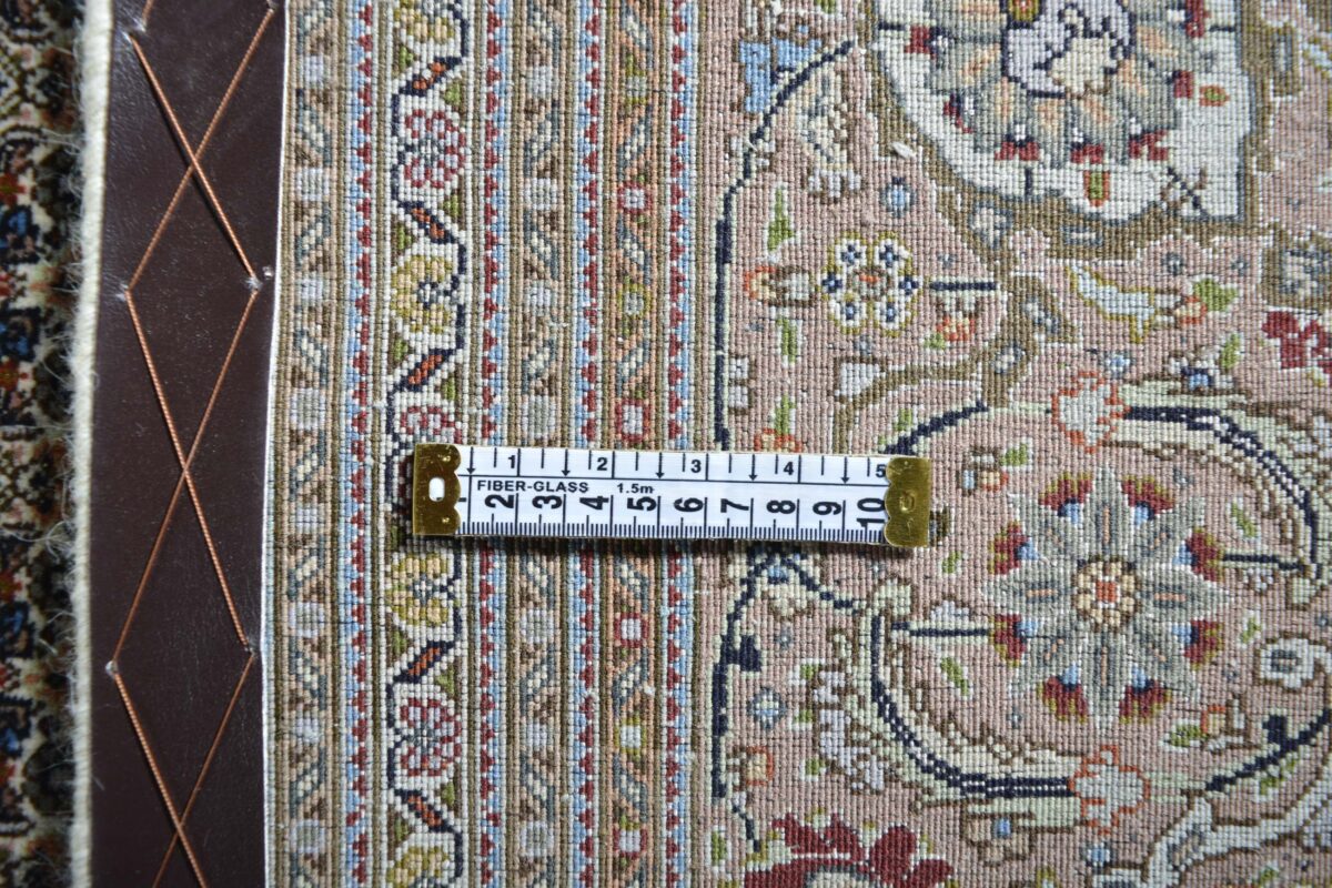 Für die besondere Eleganz des Täbriz-Flors sorgen hervorragende Materialien wie samtig anmutende Korkwolle und glänzende Seidenfäden. Die Knüpfqualität eines Täbriz-Teppichs lässt sich aus der angegebenen Raj-Zahl erschließen – je höher diese ausfällt, umso feiner ist die Knüpfdichte, die eine Million und mehr Knoten pro Quadratmeter erreichen kann. Bei besonders feingeknüpften Qualitäten kommt für die Kette statt des üblichen Baumwollgarns sogar Seide zum Einsatz.