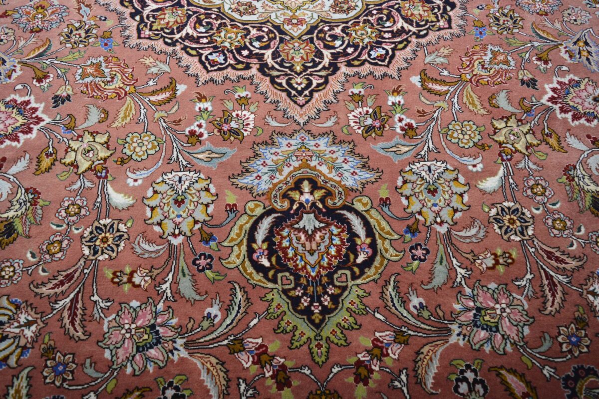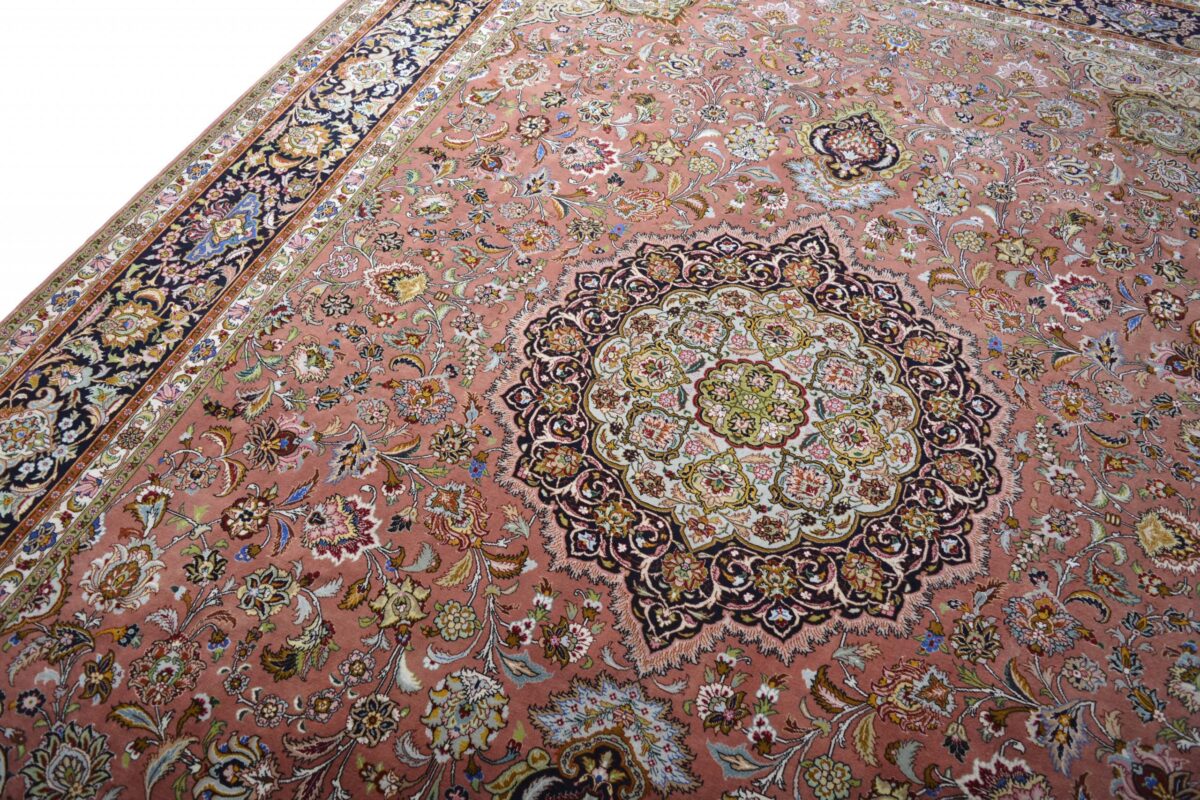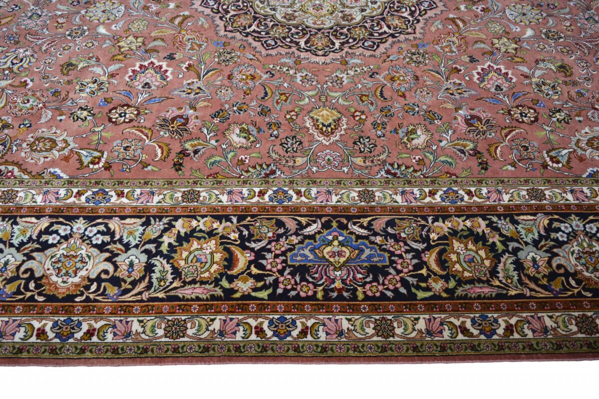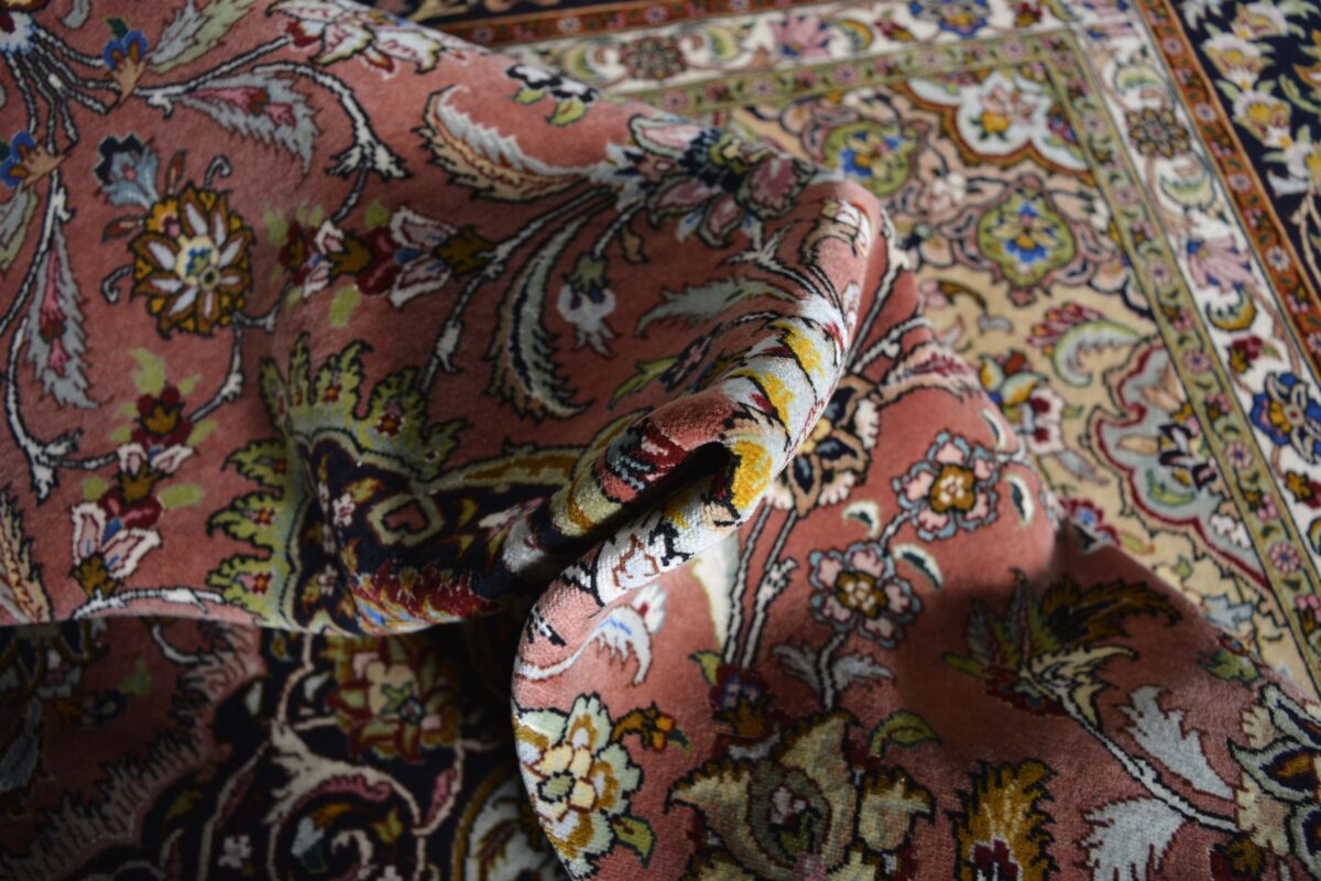 Für die besondere Eleganz des Täbriz-Flors sorgen hervorragende Materialien wie samtig anmutende Korkwolle und glänzende Seidenfäden. Die Knüpfqualität eines Täbriz-Teppichs lässt sich aus der angegebenen Raj-Zahl erschließen – je höher diese ausfällt, umso feiner ist die Knüpfdichte, die eine Million und mehr Knoten pro Quadratmeter erreichen kann. Bei besonders feingeknüpften Qualitäten kommt für die Kette statt des üblichen Baumwollgarns sogar Seide zum Einsatz.