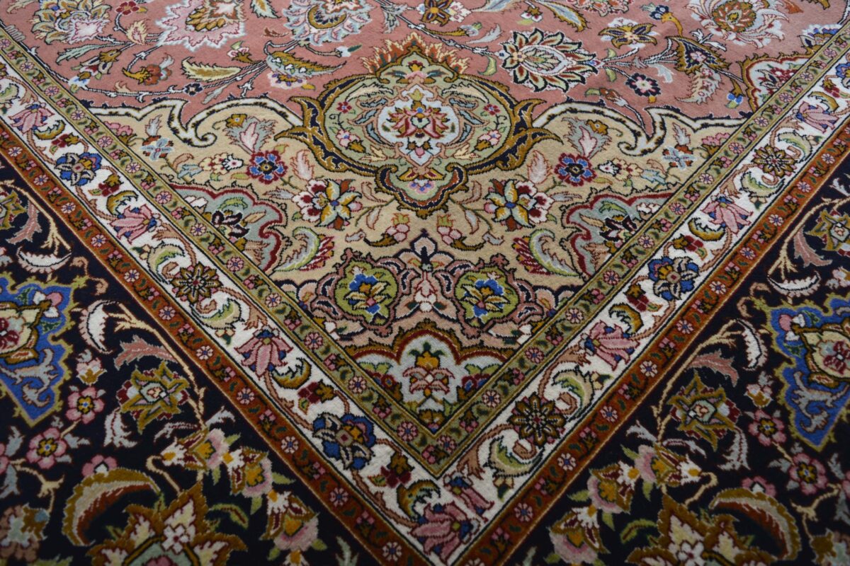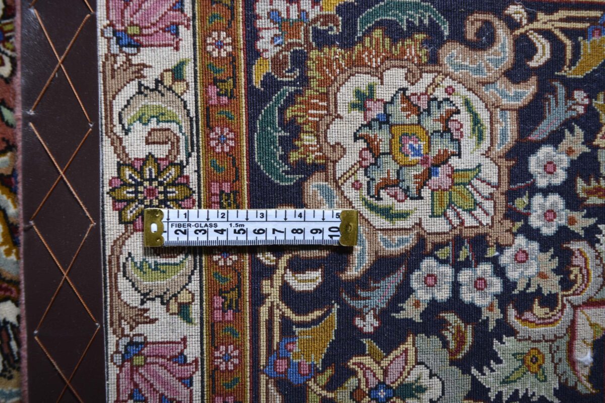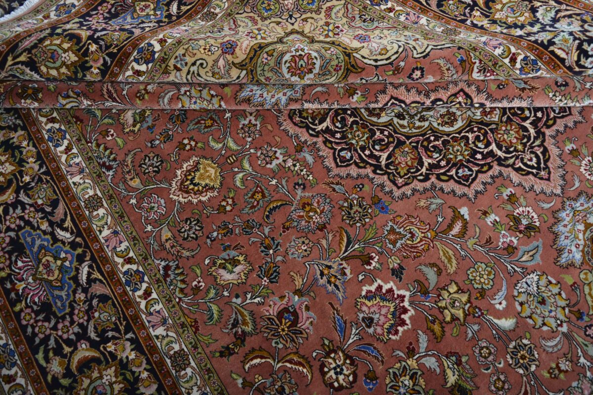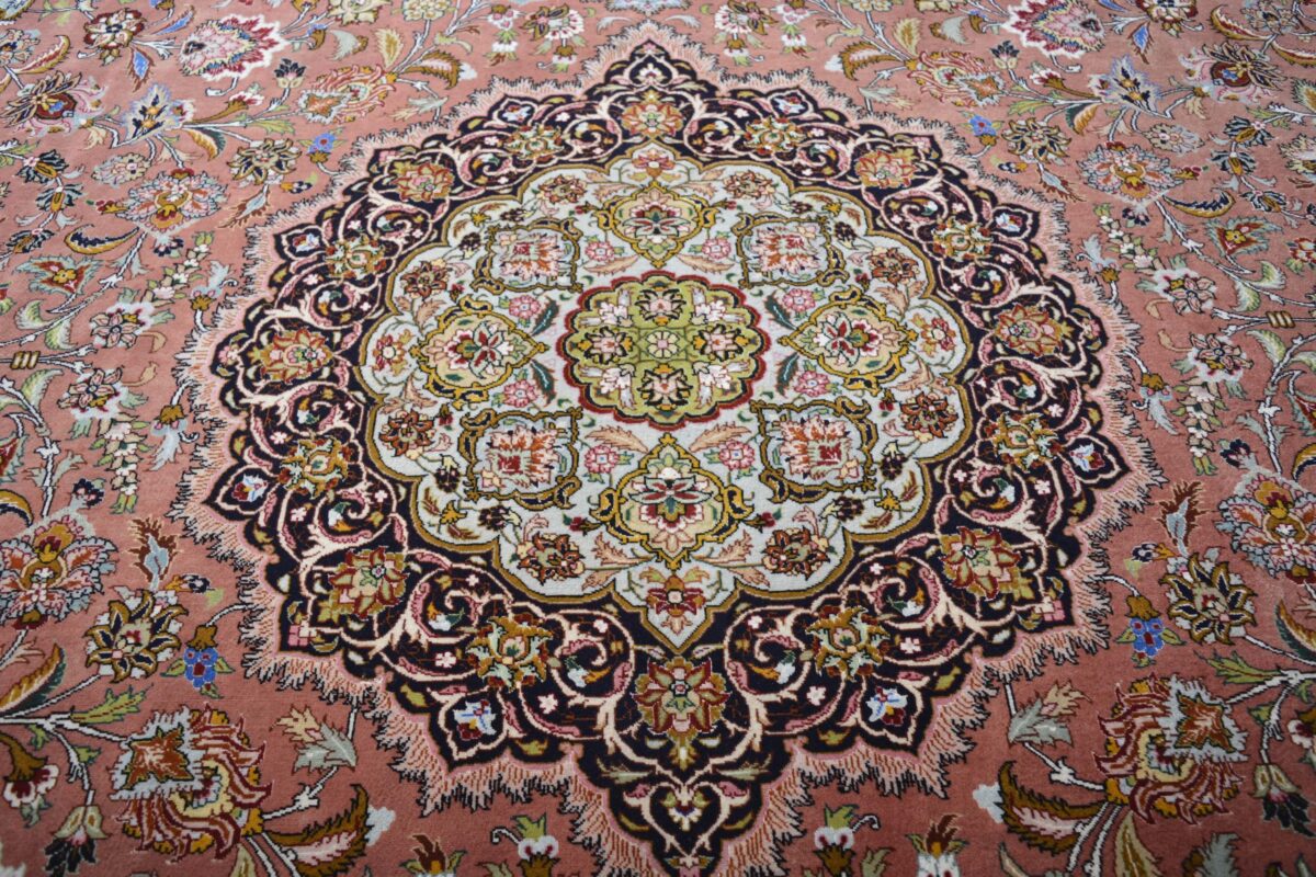 Für die besondere Eleganz des Täbriz-Flors sorgen hervorragende Materialien wie samtig anmutende Korkwolle und glänzende Seidenfäden. Die Knüpfqualität eines Täbriz-Teppichs lässt sich aus der angegebenen Raj-Zahl erschließen – je höher diese ausfällt, umso feiner ist die Knüpfdichte, die eine Million und mehr Knoten pro Quadratmeter erreichen kann. Bei besonders feingeknüpften Qualitäten kommt für die Kette statt des üblichen Baumwollgarns sogar Seide zum Einsatz.