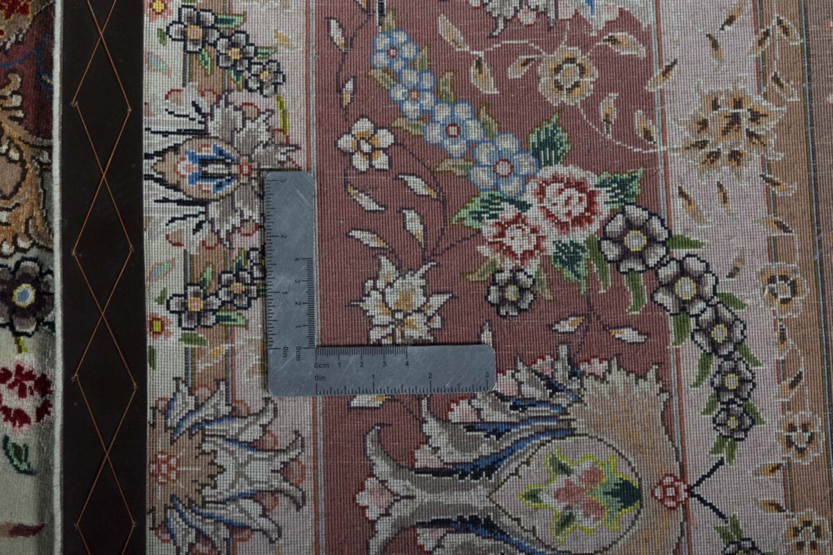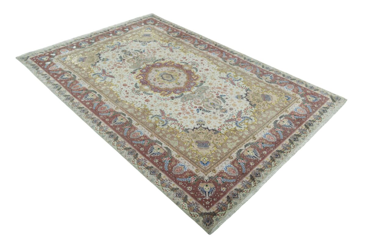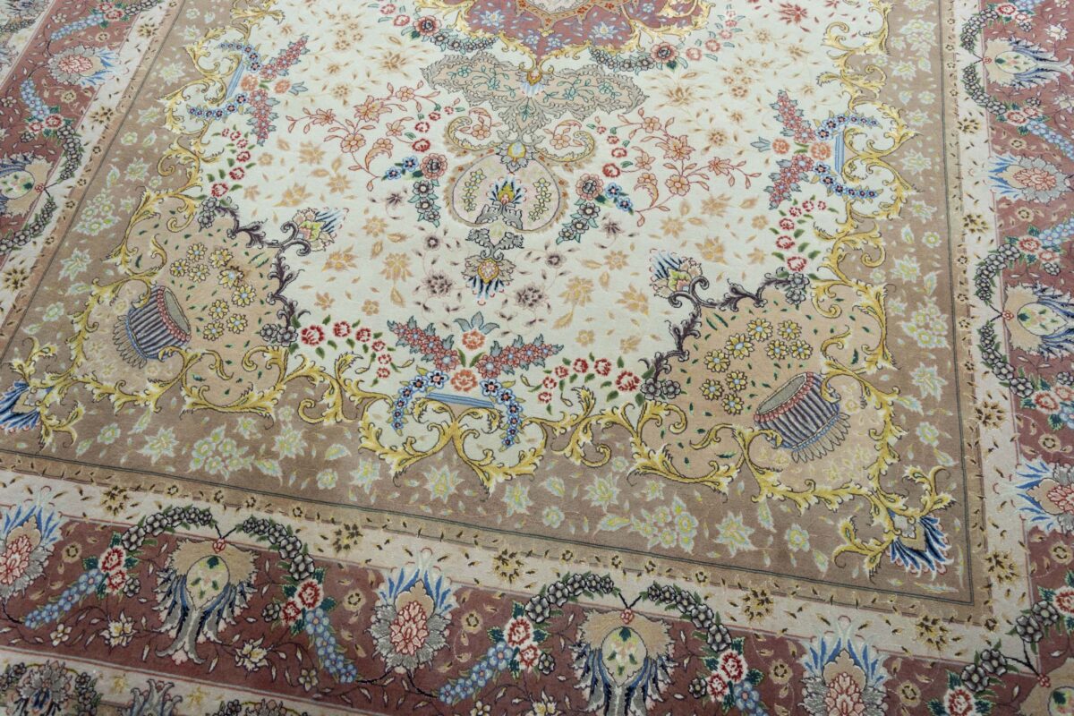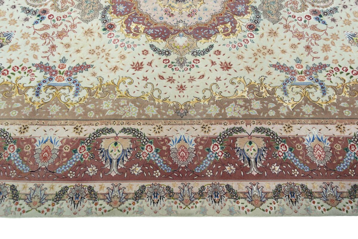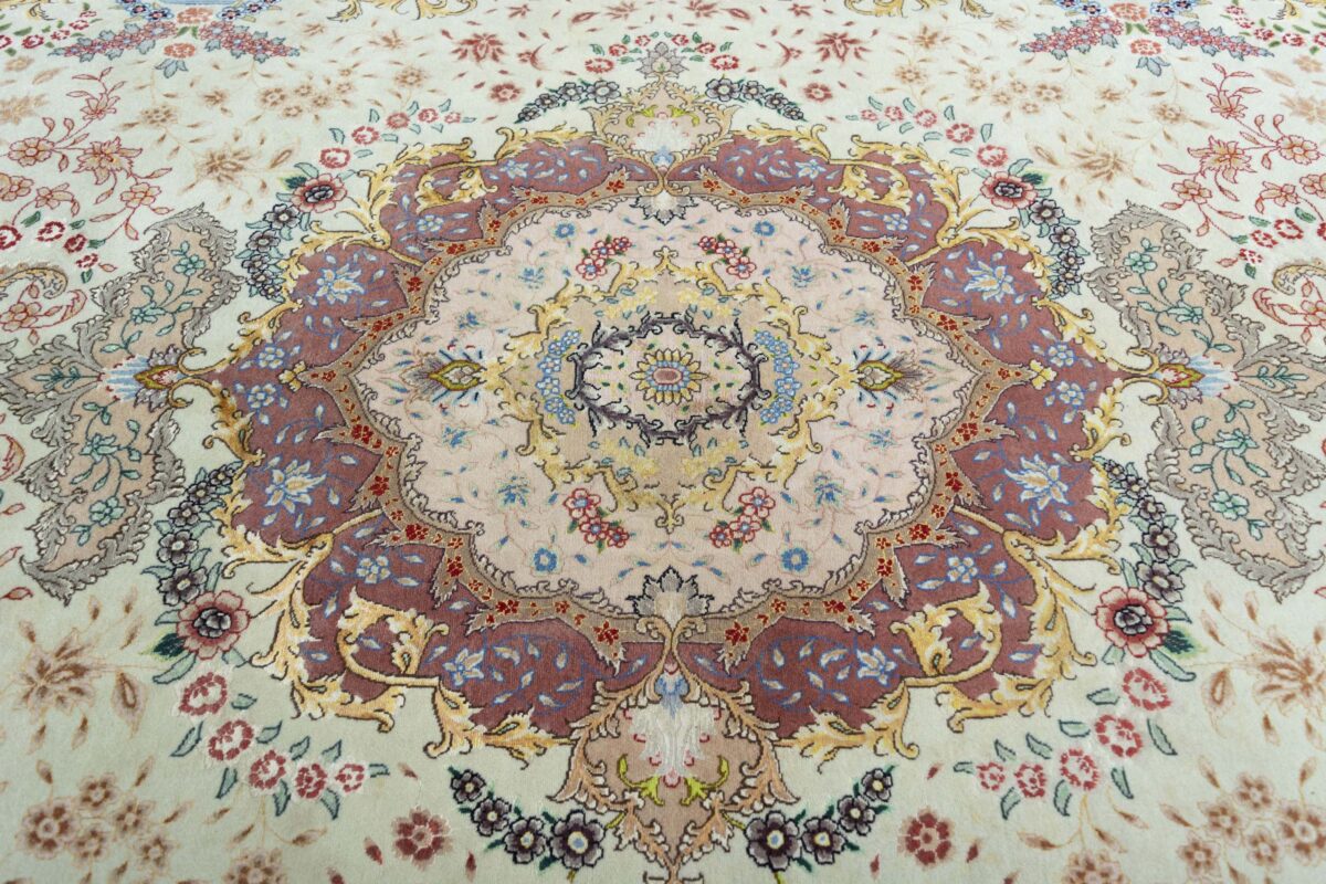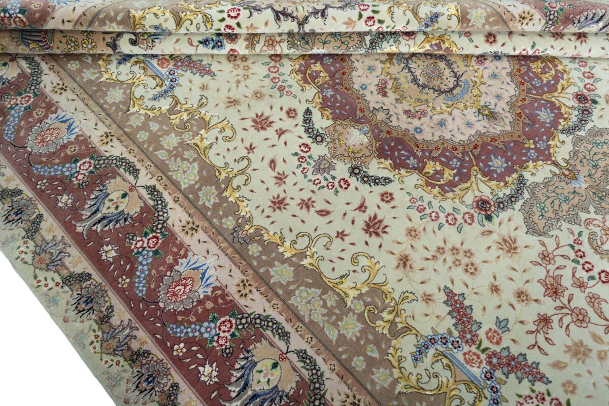 Für die besondere Eleganz des Täbriz-Flors sorgen hervorragende Materialien wie samtig anmutende Korkwolle und glänzende Seidenfäden. Die Knüpfqualität eines Täbriz-Teppichs lässt sich aus der angegebenen Raj-Zahl erschließen – je höher diese ausfällt, umso feiner ist die Knüpfdichte, die eine Million und mehr Knoten pro Quadratmeter erreichen kann. Bei besonders feingeknüpften Qualitäten kommt für die Kette statt des üblichen Baumwollgarns sogar Seide zum Einsatz.