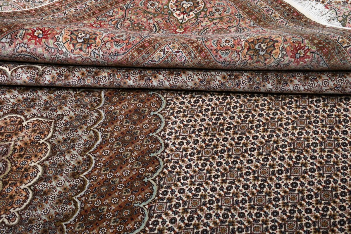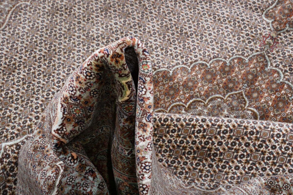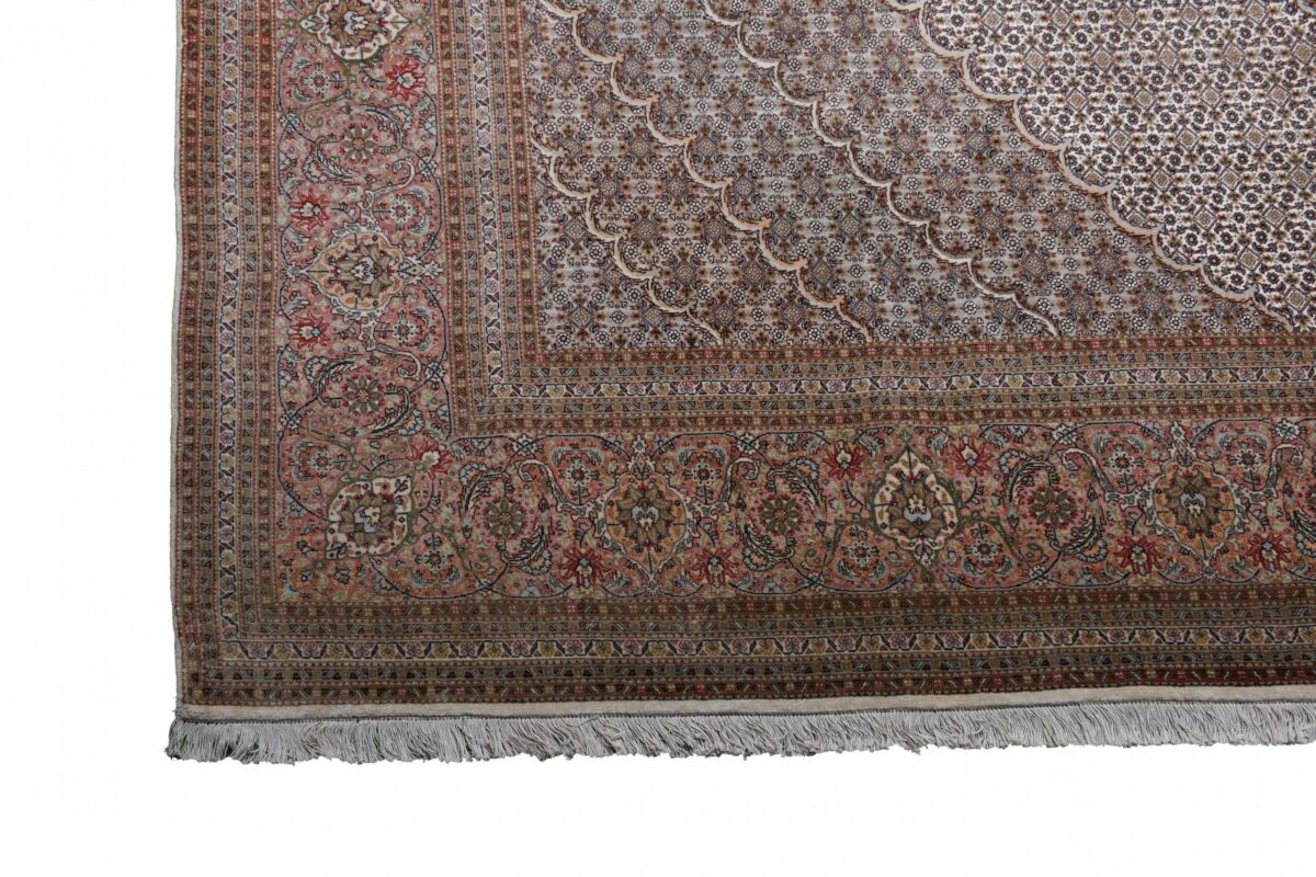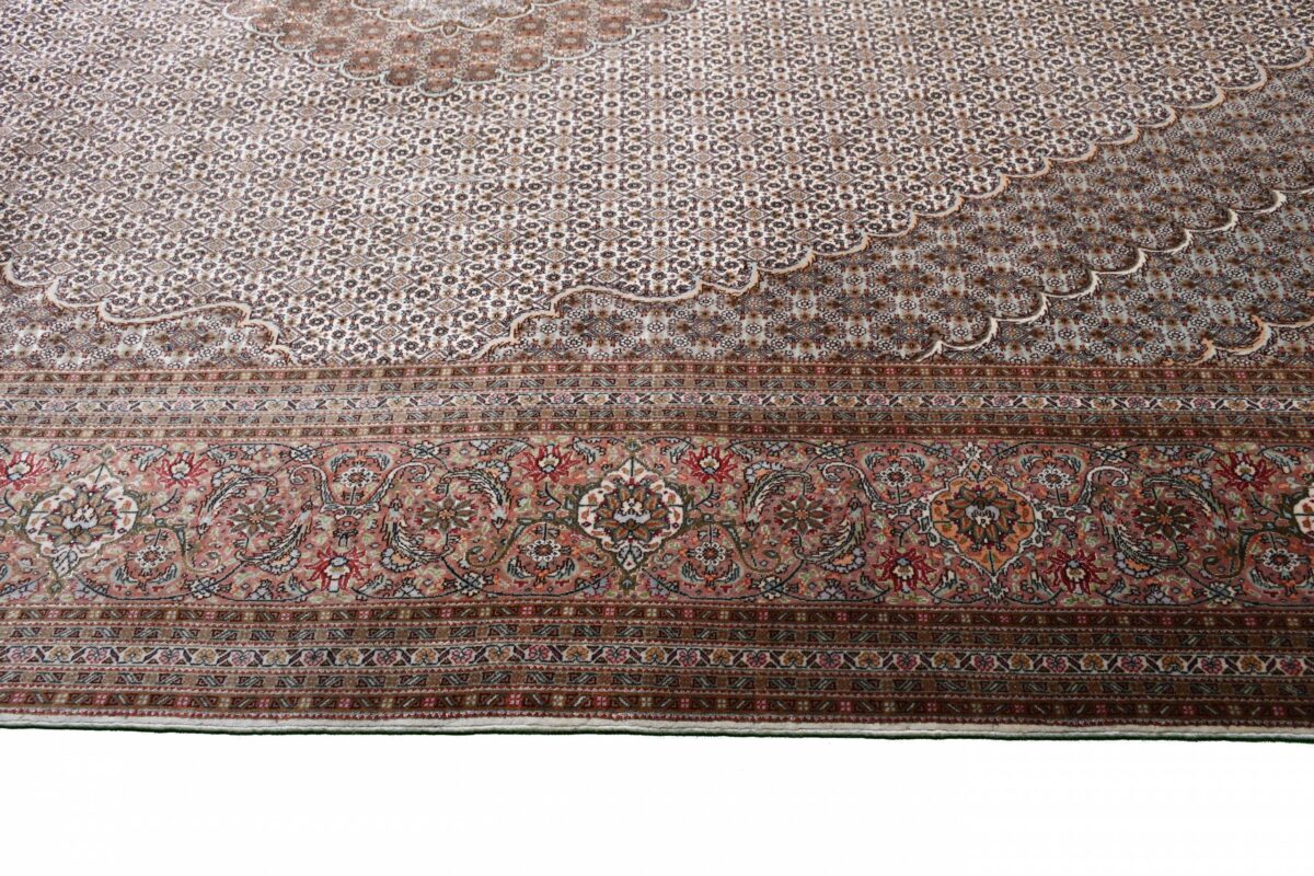 Für die besondere Eleganz des Täbriz-Flors sorgen hervorragende Materialien wie samtig anmutende Korkwolle und glänzende Seidenfäden. Die Knüpfqualität eines Täbriz-Teppichs lässt sich aus der angegebenen Raj-Zahl erschließen – je höher diese ausfällt, umso feiner ist die Knüpfdichte, die eine Million und mehr Knoten pro Quadratmeter erreichen kann. Bei besonders feingeknüpften Qualitäten kommt für die Kette statt des üblichen Baumwollgarns sogar Seide zum Einsatz.