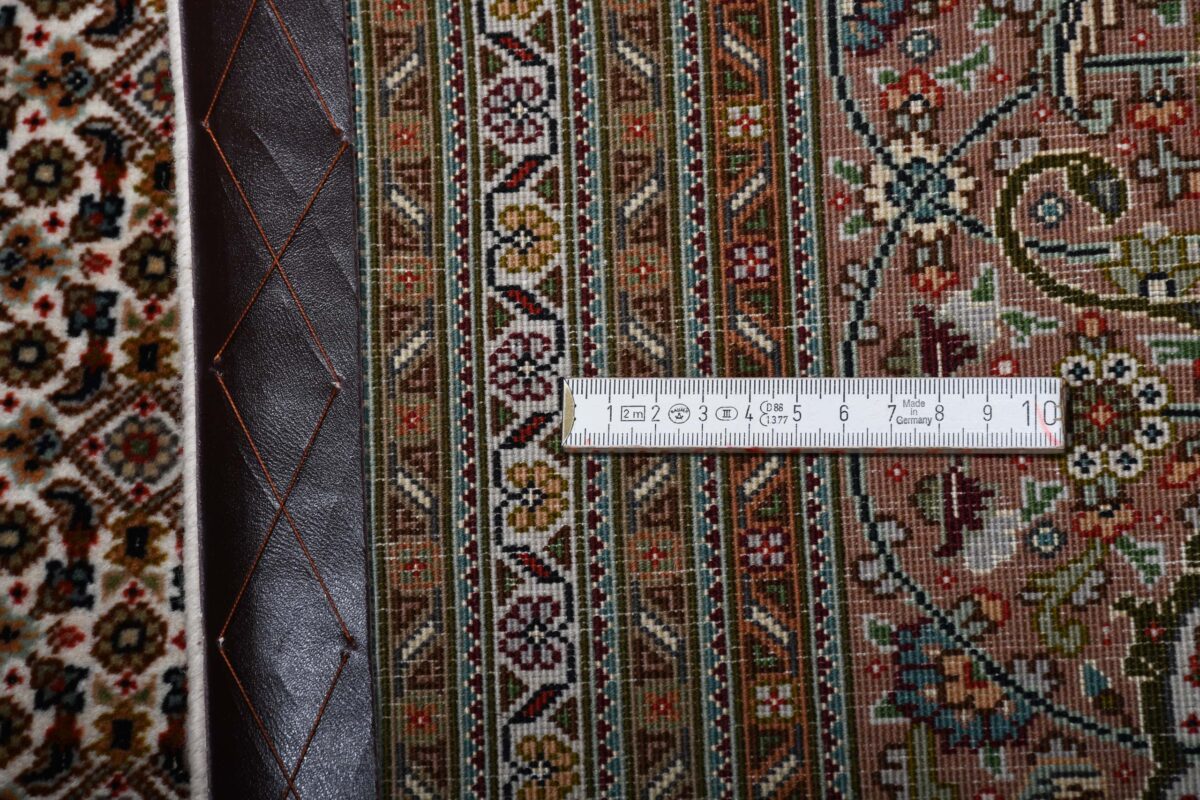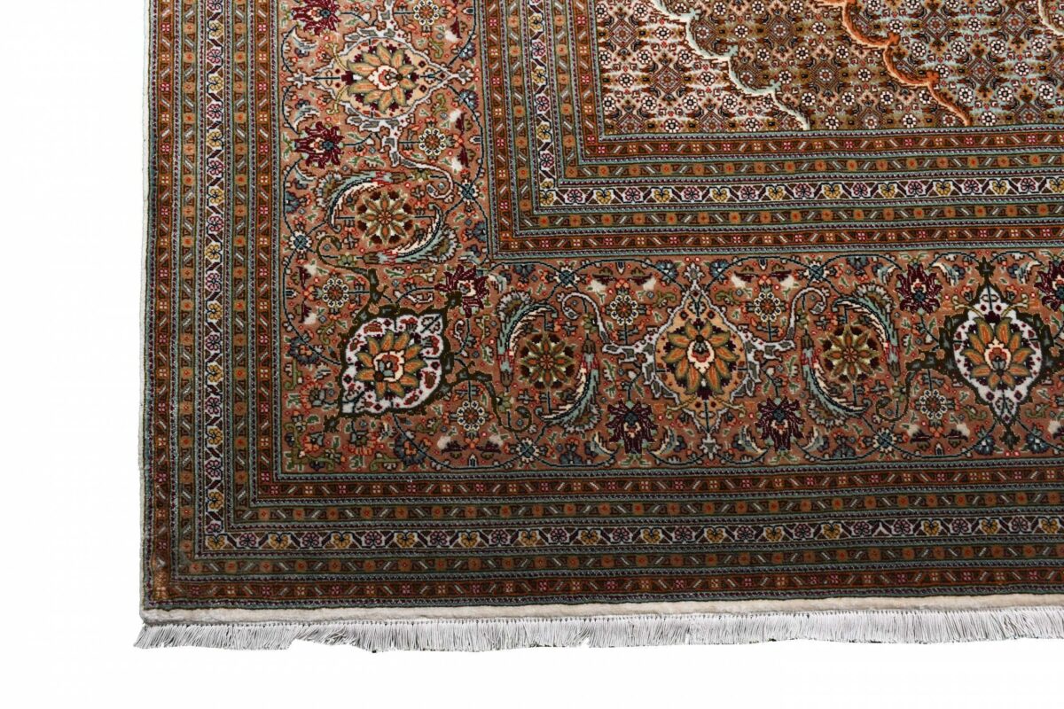 Für die besondere Eleganz des Täbriz-Flors sorgen hervorragende Materialien wie samtig anmutende Korkwolle und glänzende Seidenfäden. Die Knüpfqualität eines Täbriz-Teppichs lässt sich aus der angegebenen Raj-Zahl erschließen – je höher diese ausfällt, umso feiner ist die Knüpfdichte, die eine Million und mehr Knoten pro Quadratmeter erreichen kann. Bei besonders feingeknüpften Qualitäten kommt für die Kette statt des üblichen Baumwollgarns sogar Seide zum Einsatz.